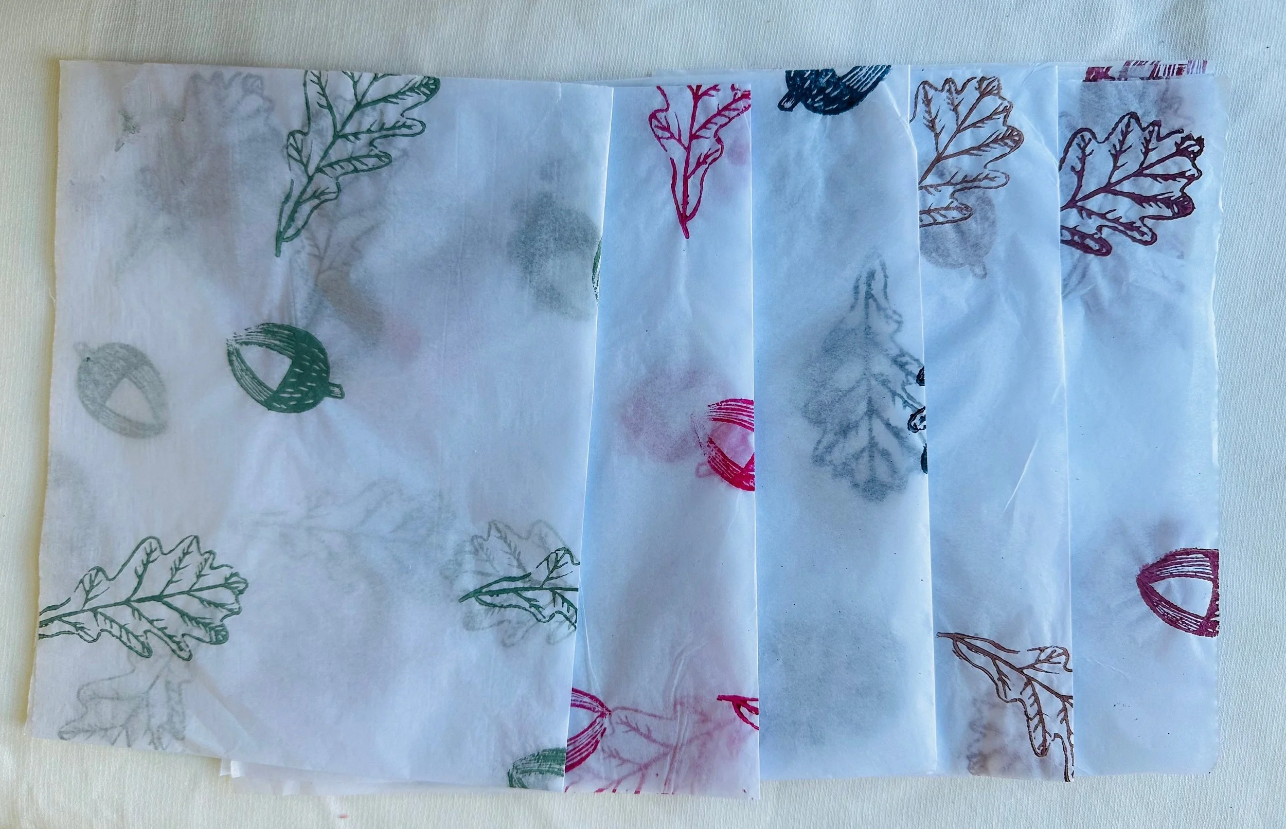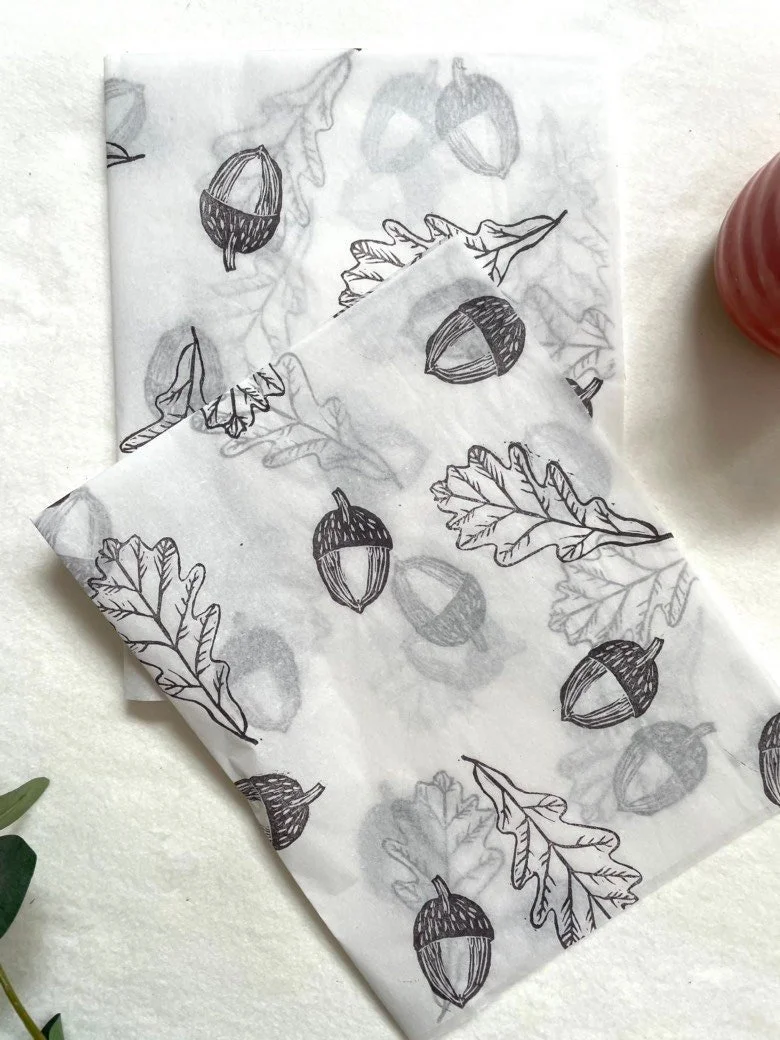 3 x acorn/oak Handprinted Eco Tissue paper, tissue paper, gift wrap, packaging, pretty packaging.