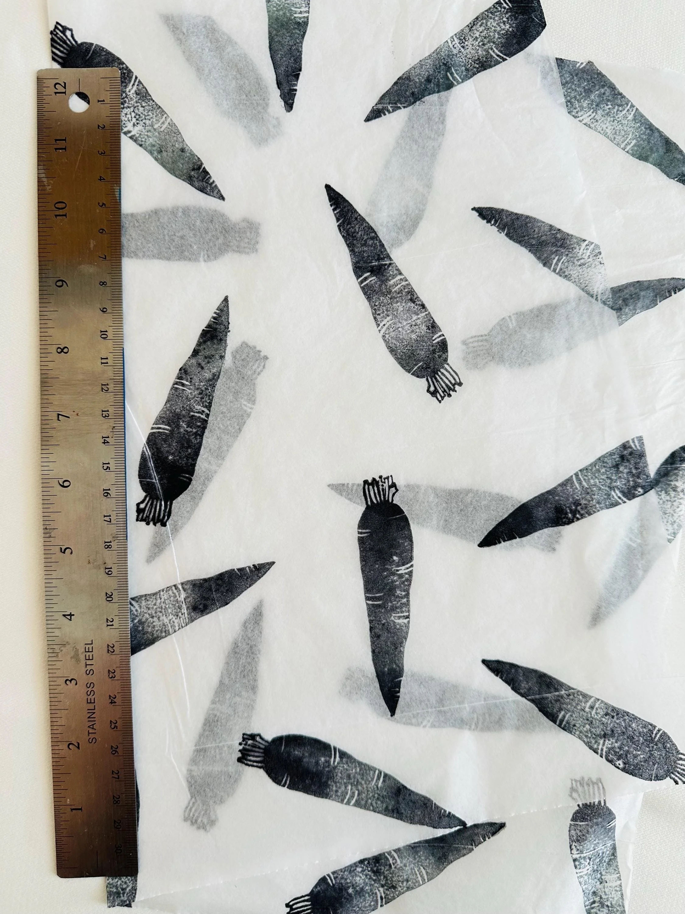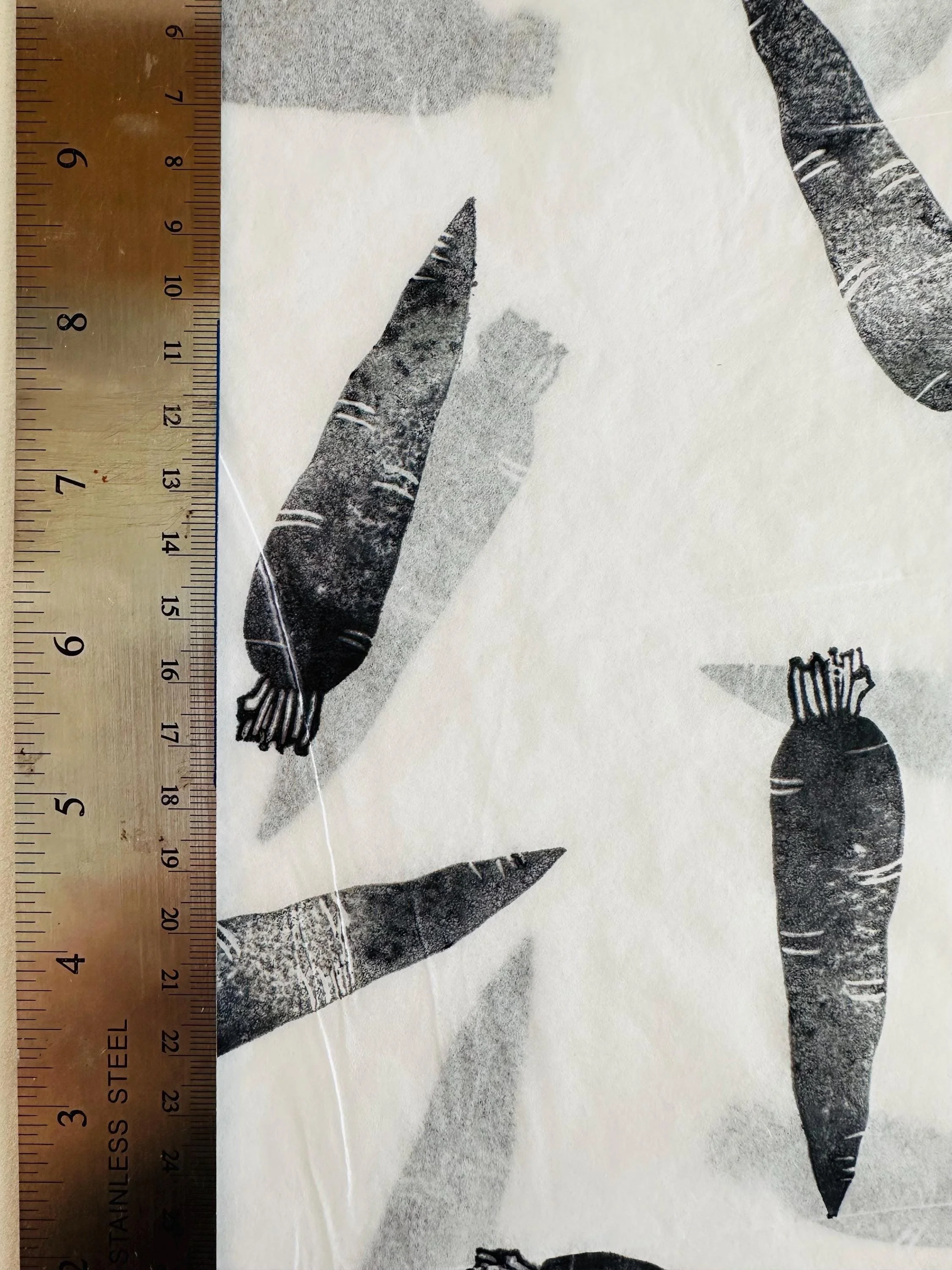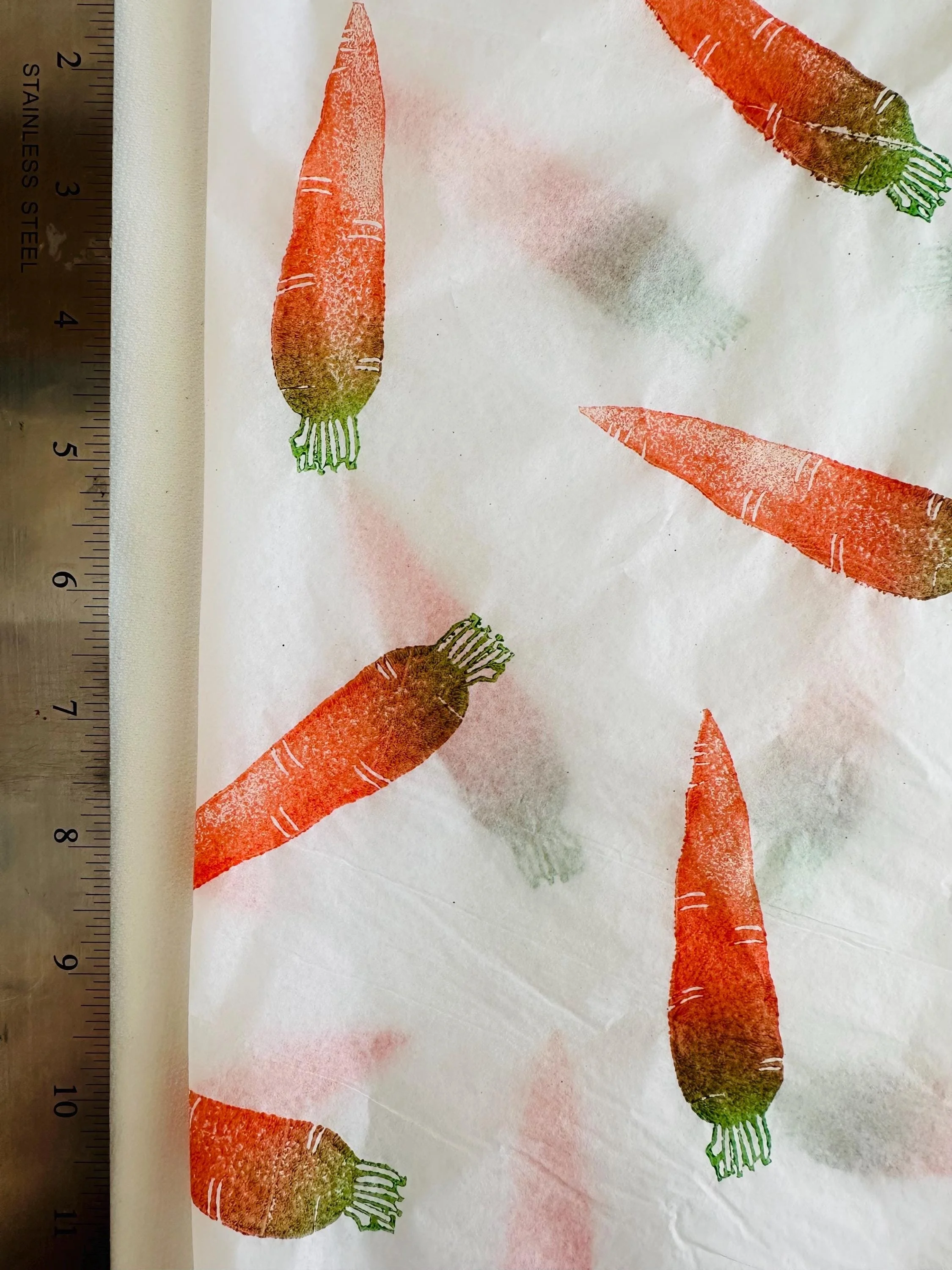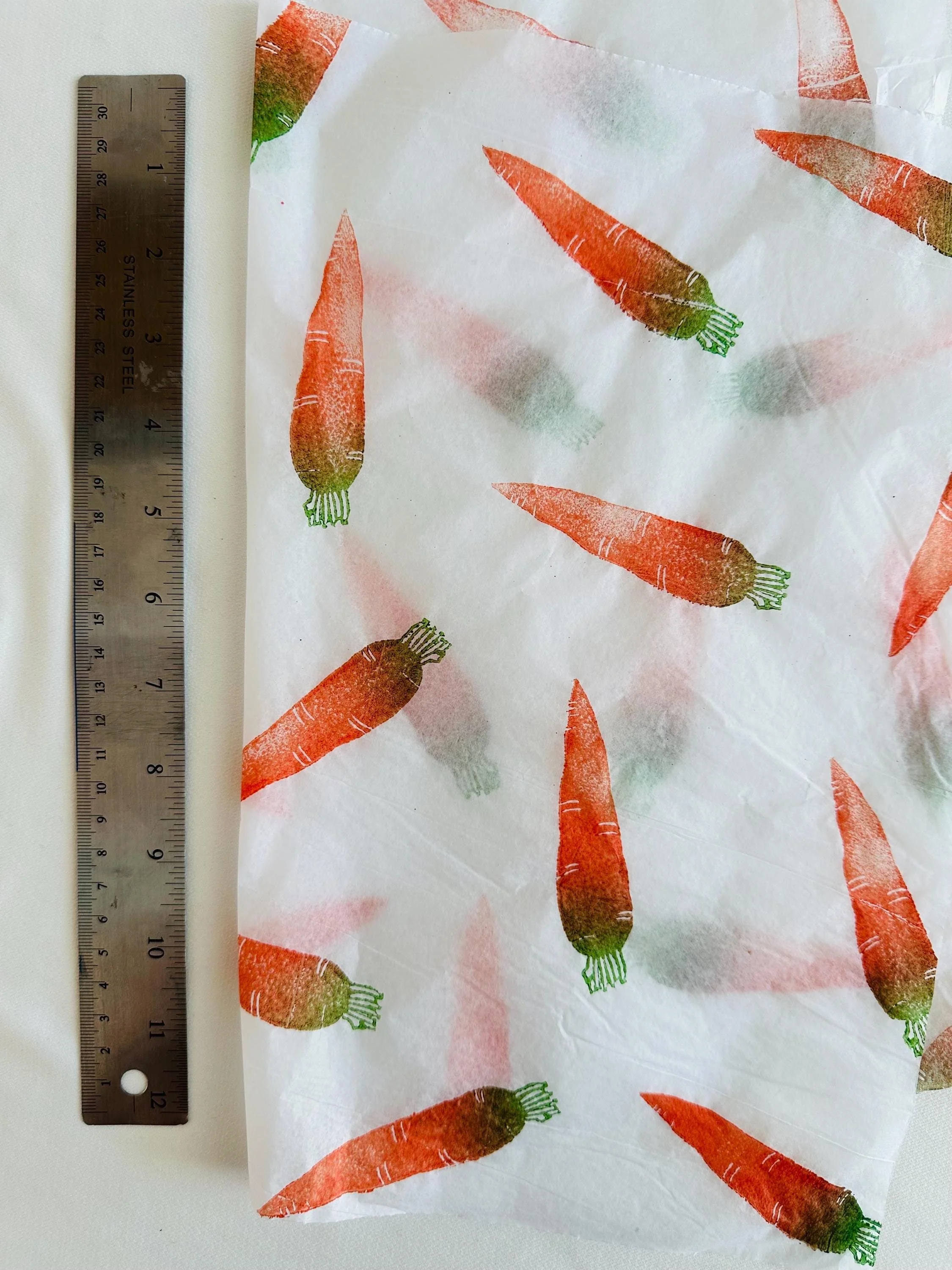 3 x carrot Handprinted Eco Tissue paper, tissue paper, gift wrap, packaging, pretty packaging.