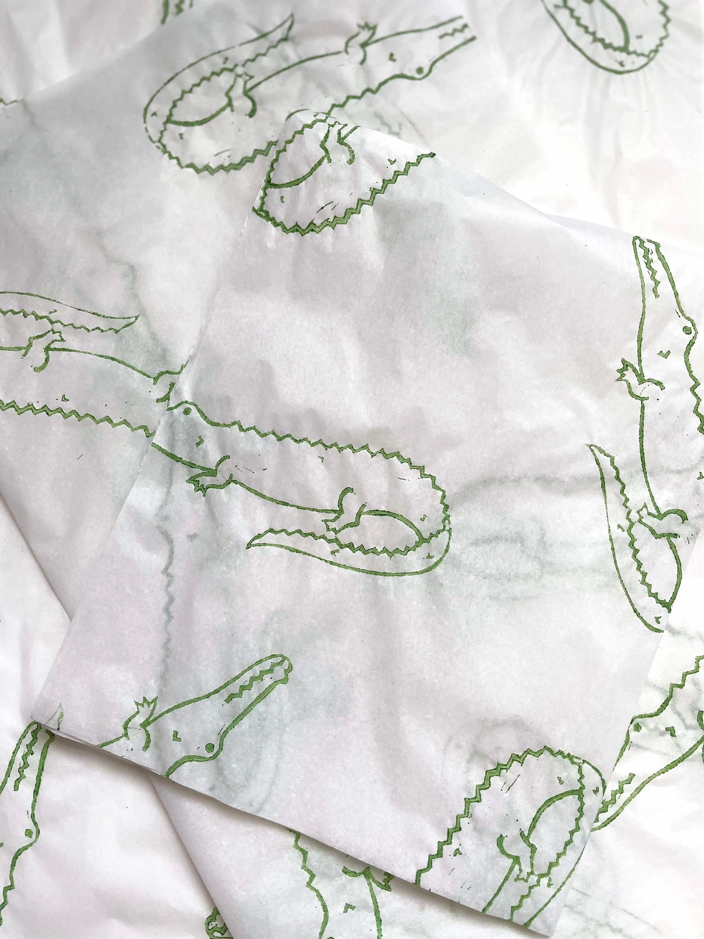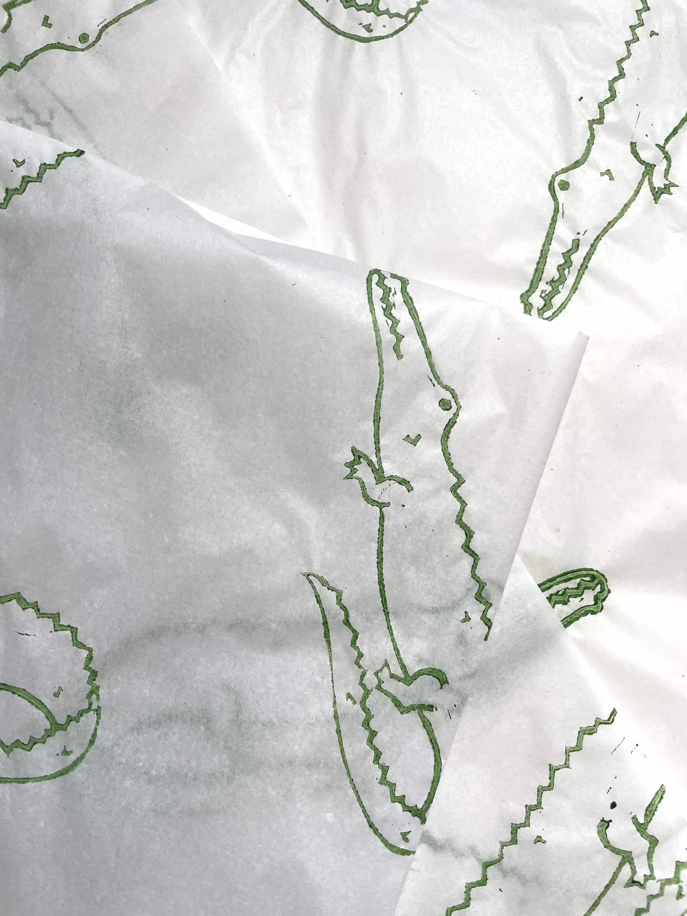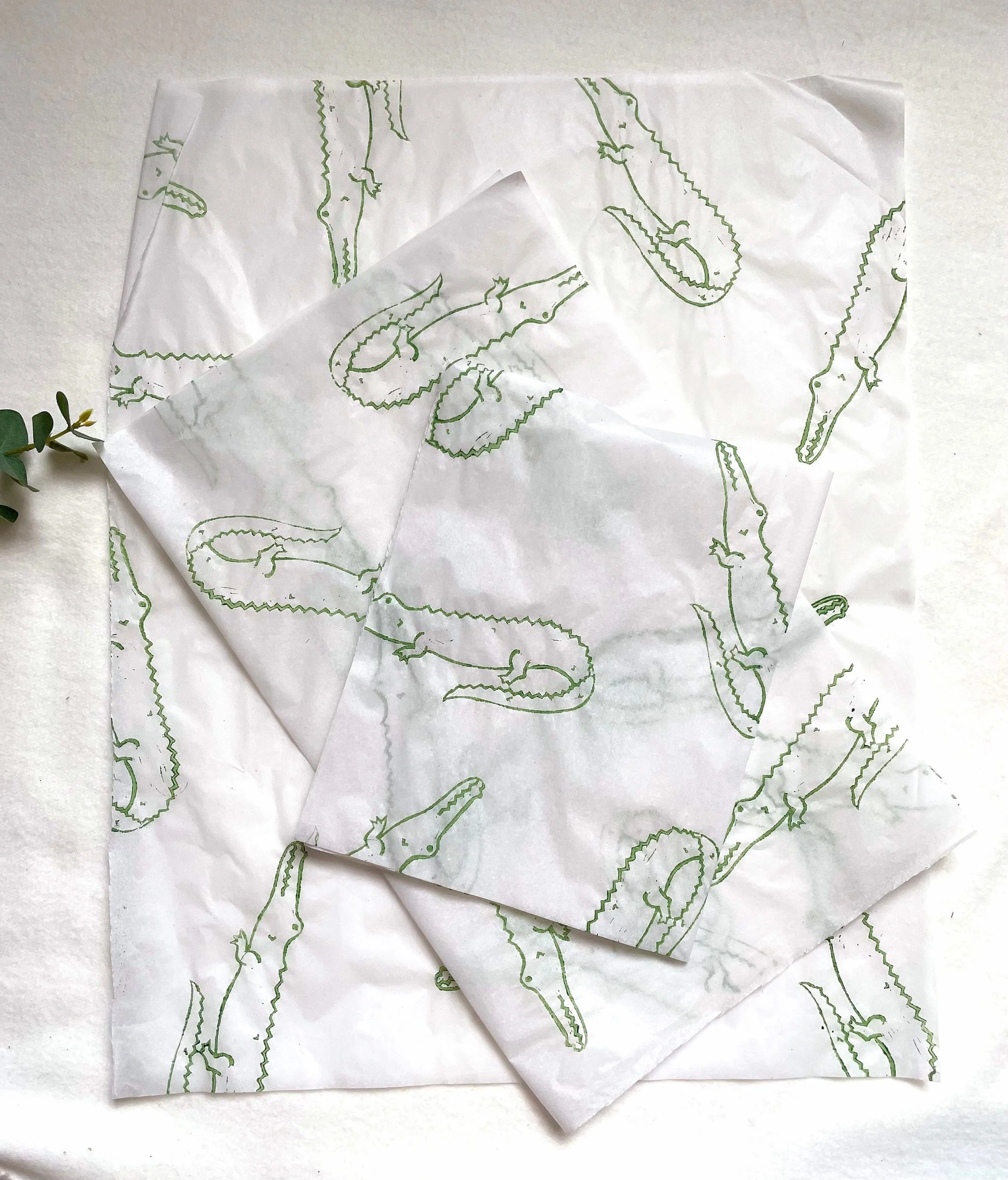 3 x Crocodile Handprinted Eco Tissue paper, tissue paper, gift wrap, packaging, pretty packaging.