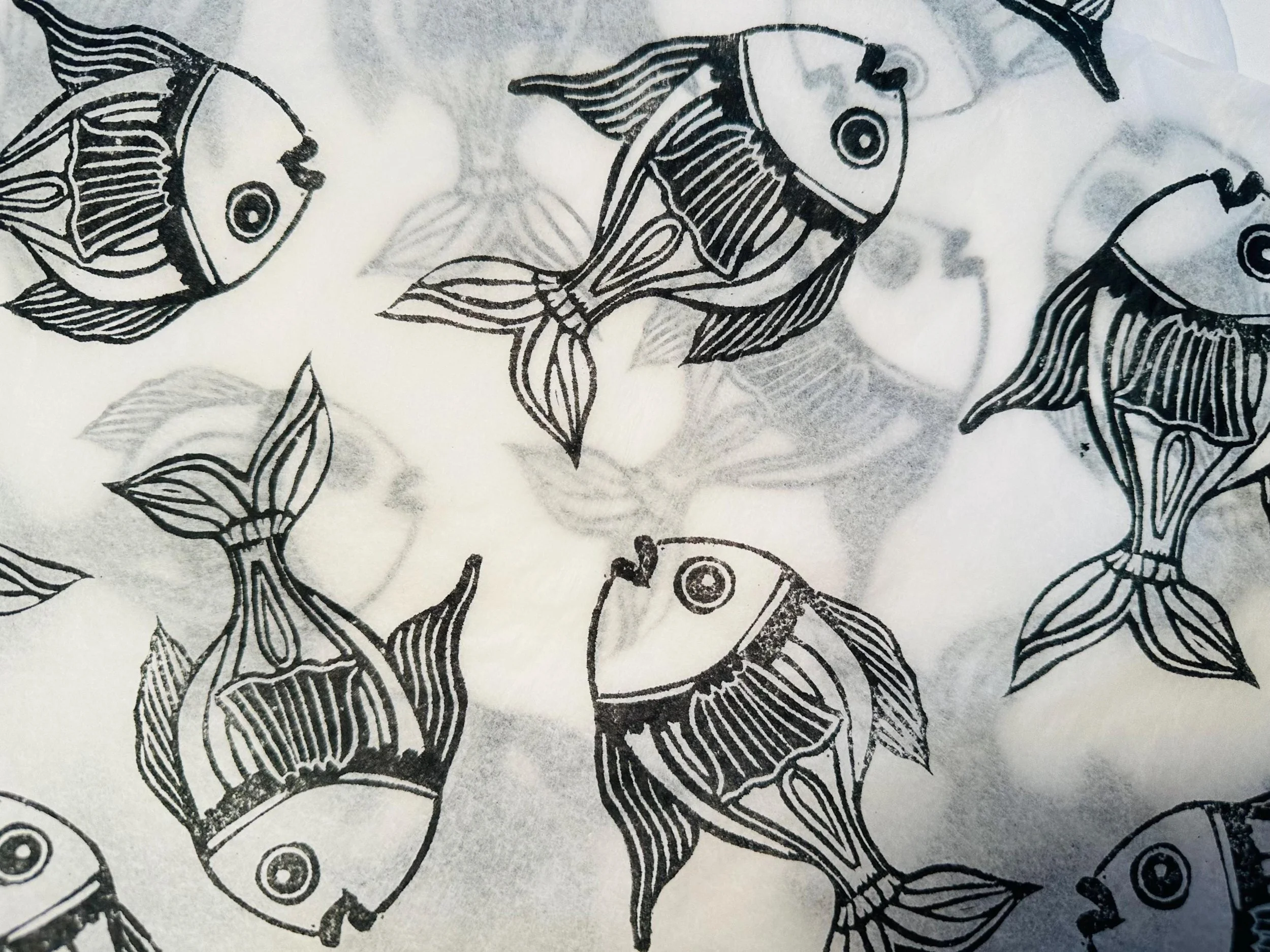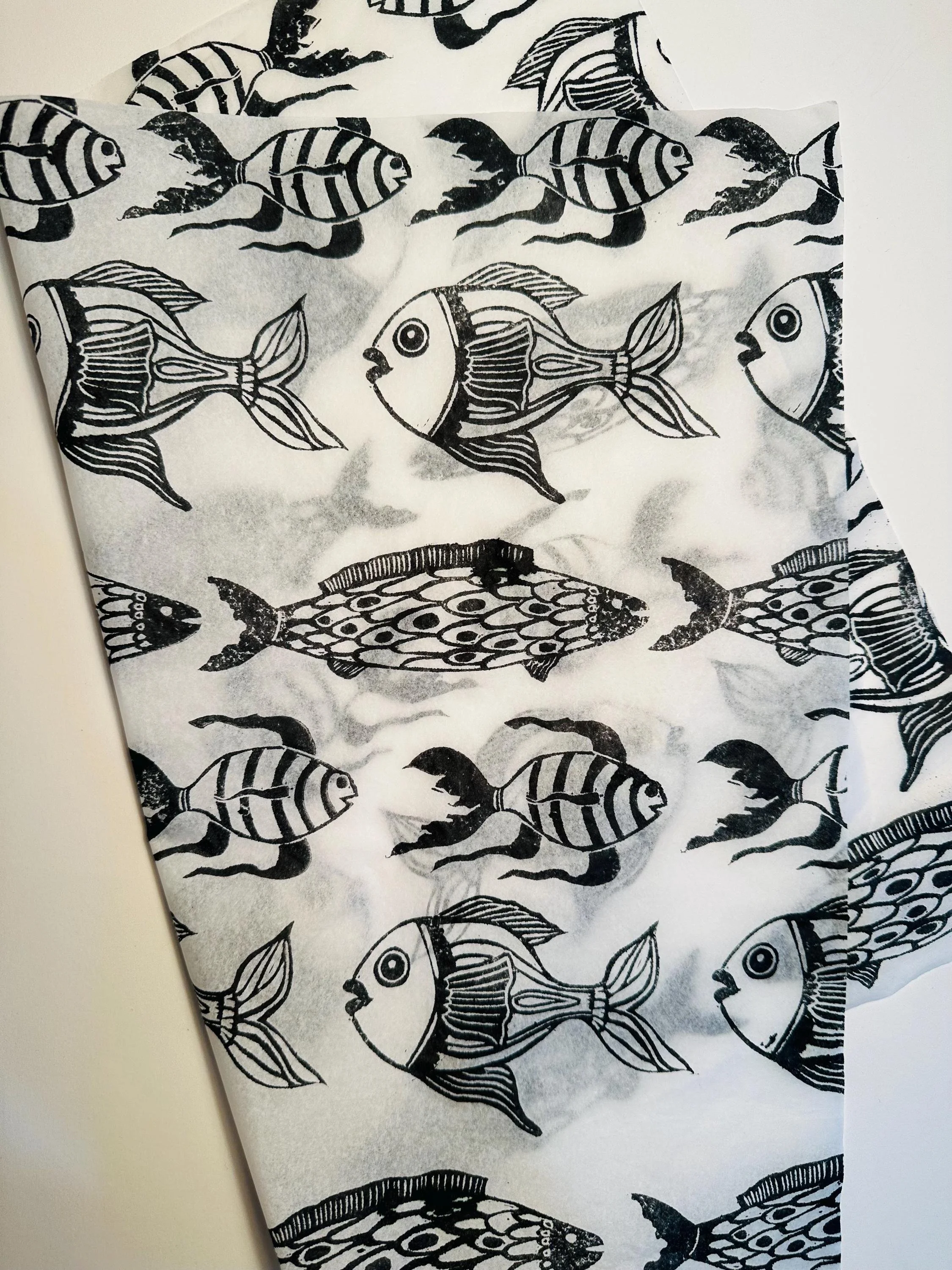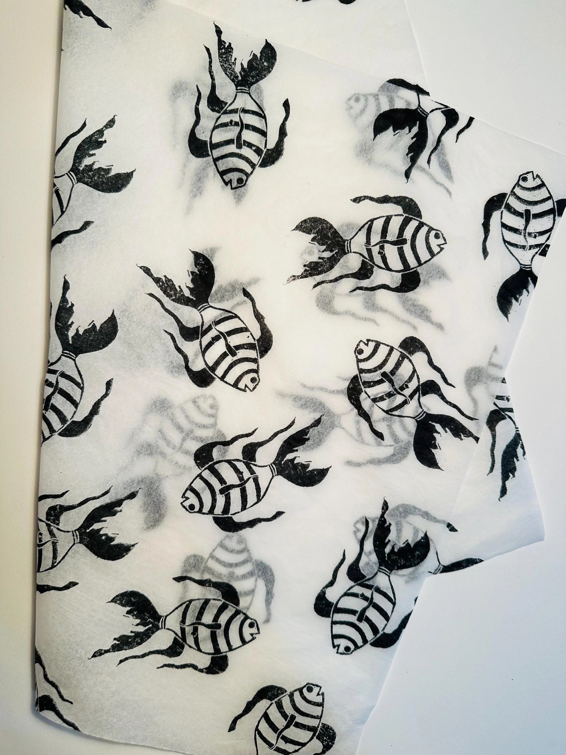 3 x fish Handprinted Eco Tissue paper, tissue paper, gift wrap, packaging, pretty packaging.
