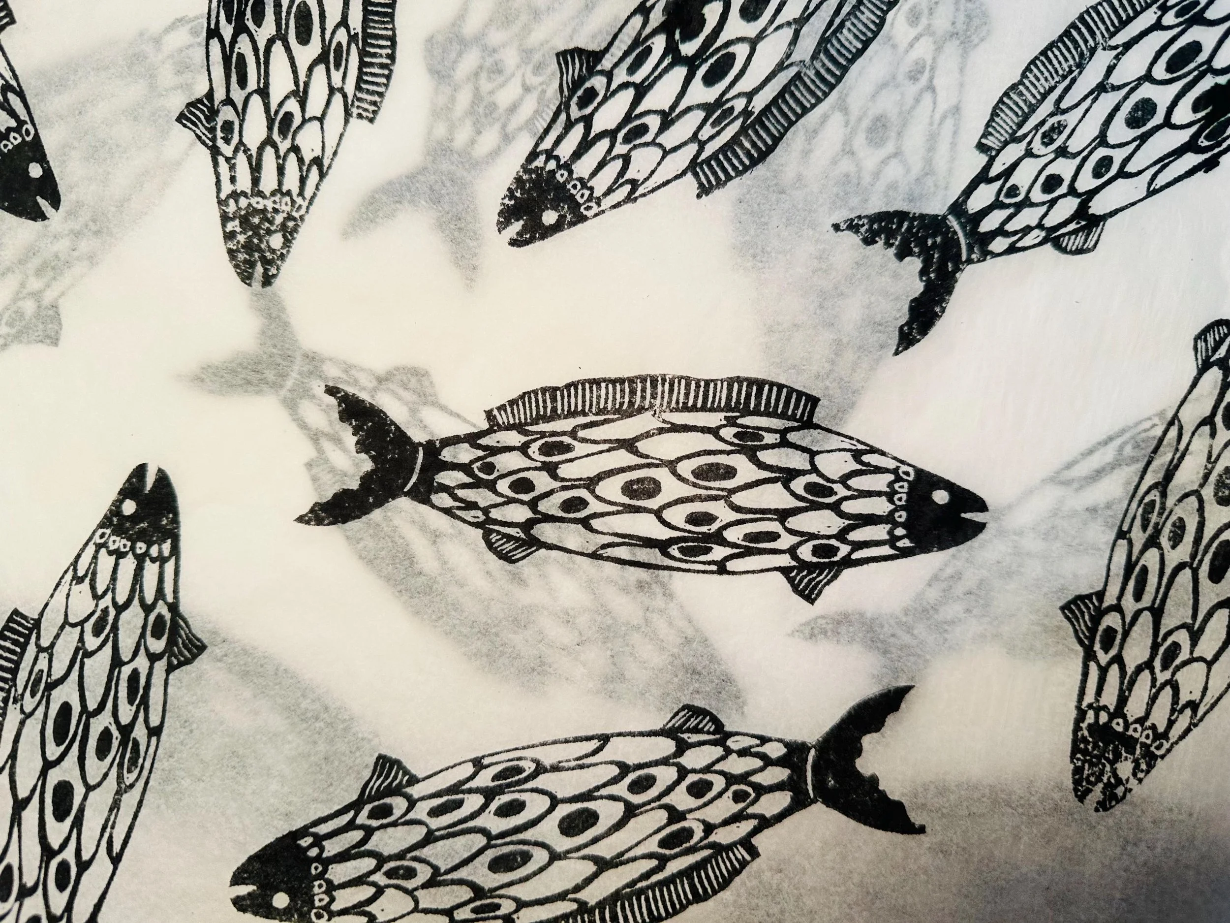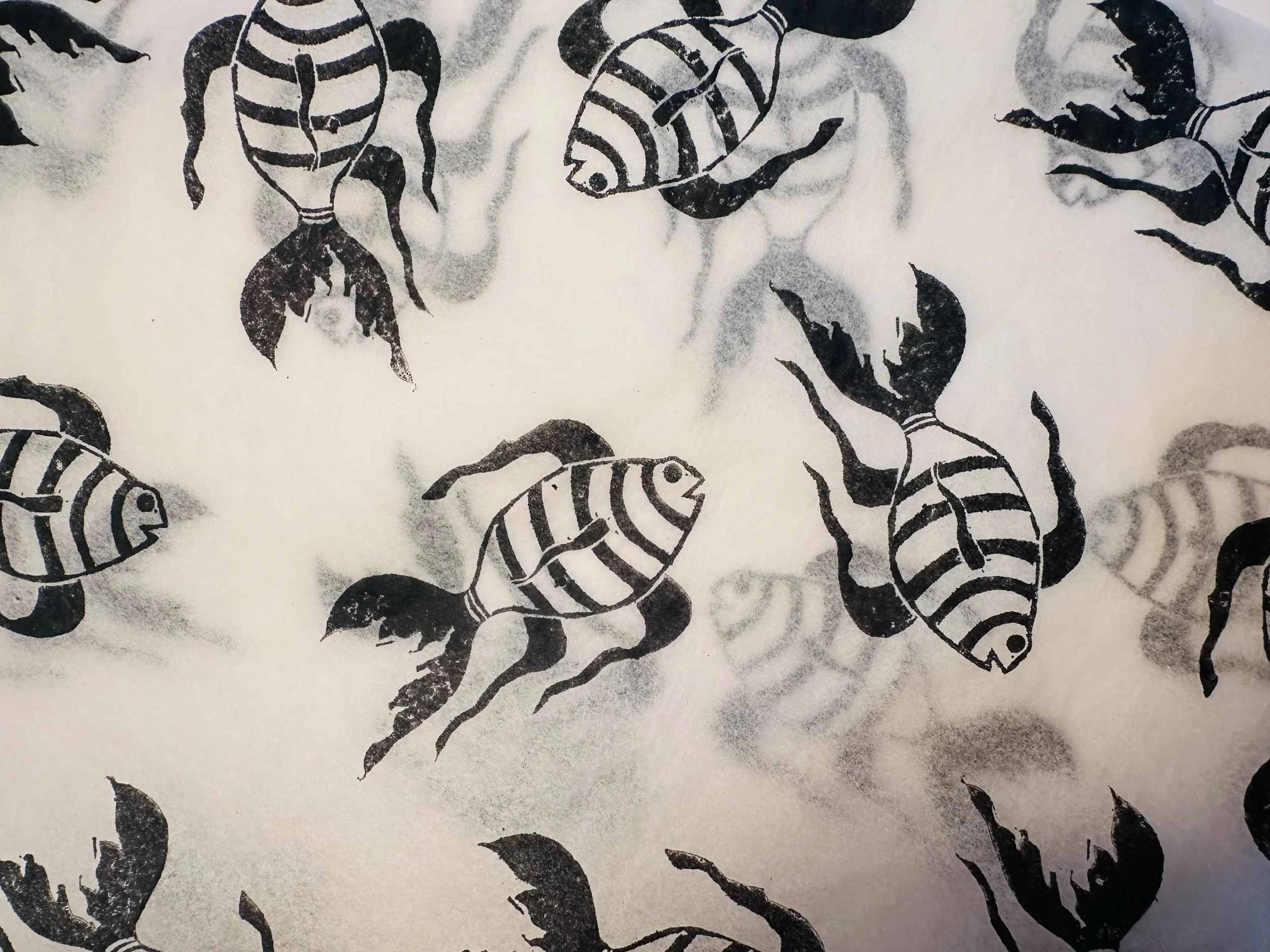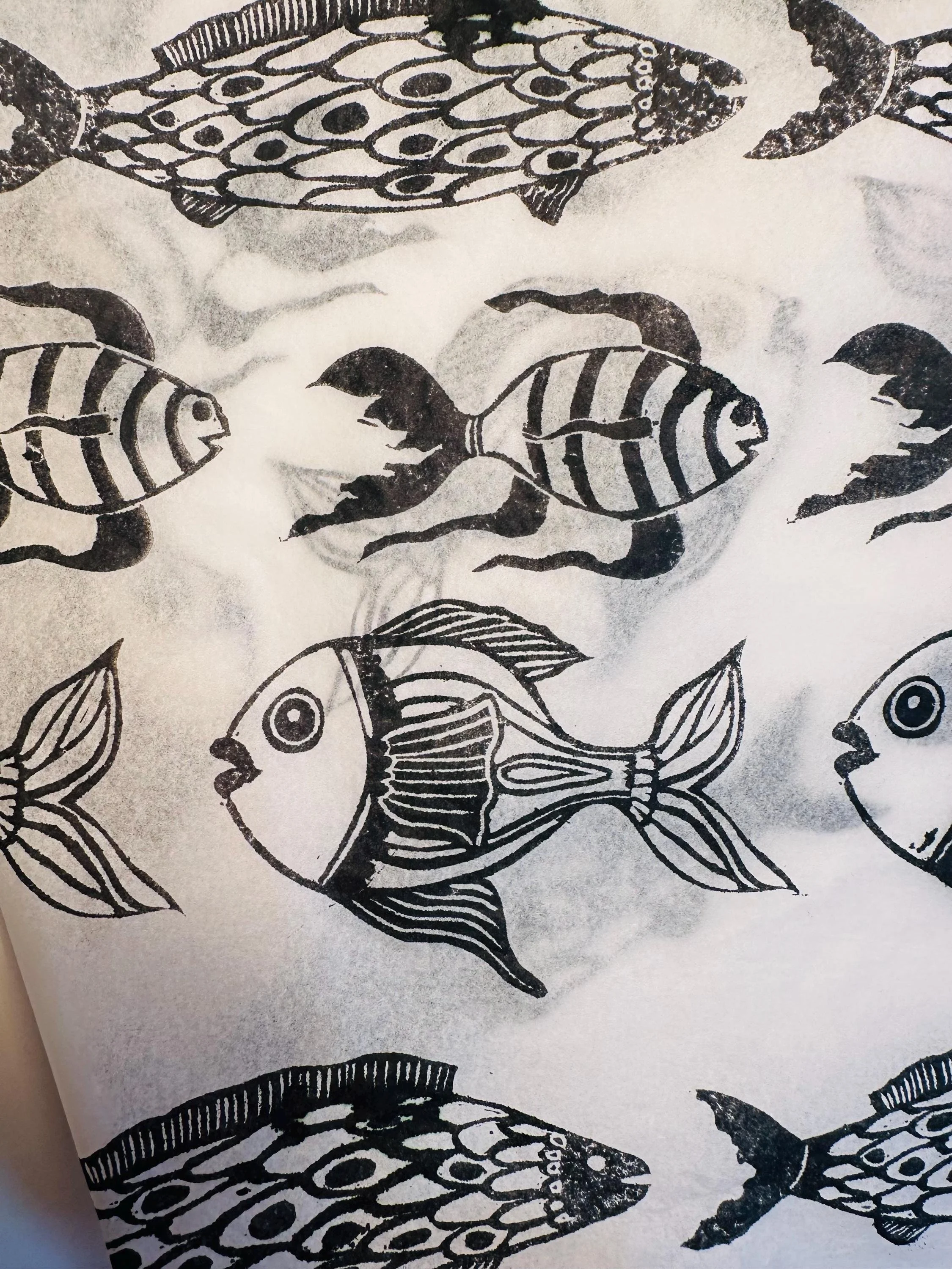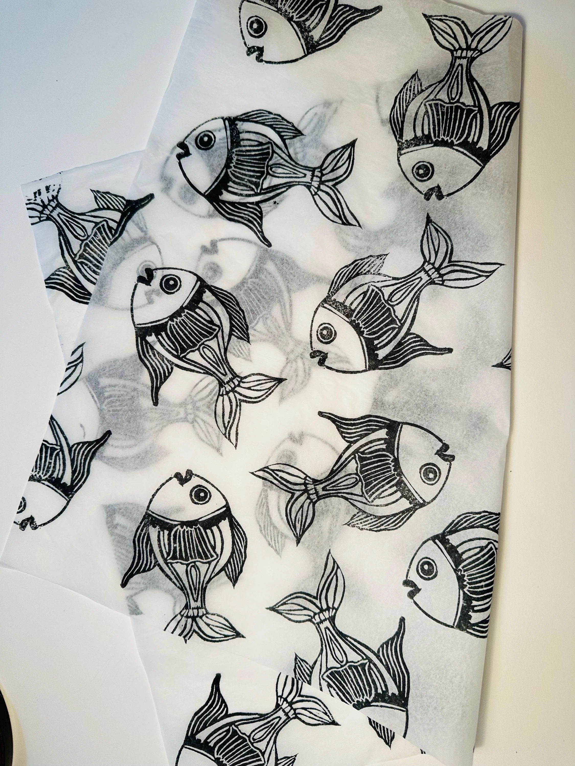 3 x fish Handprinted Eco Tissue paper, tissue paper, gift wrap, packaging, pretty packaging.