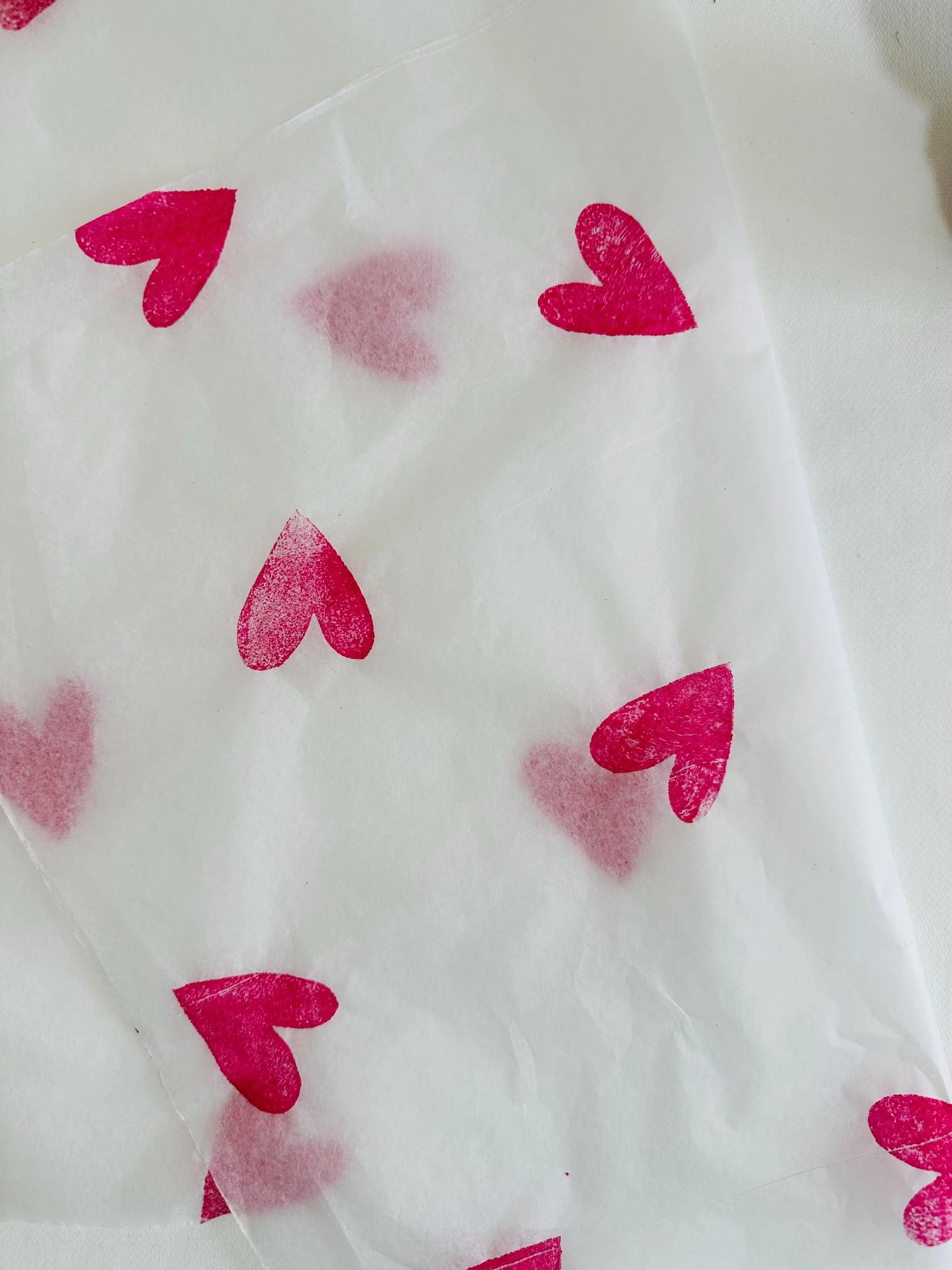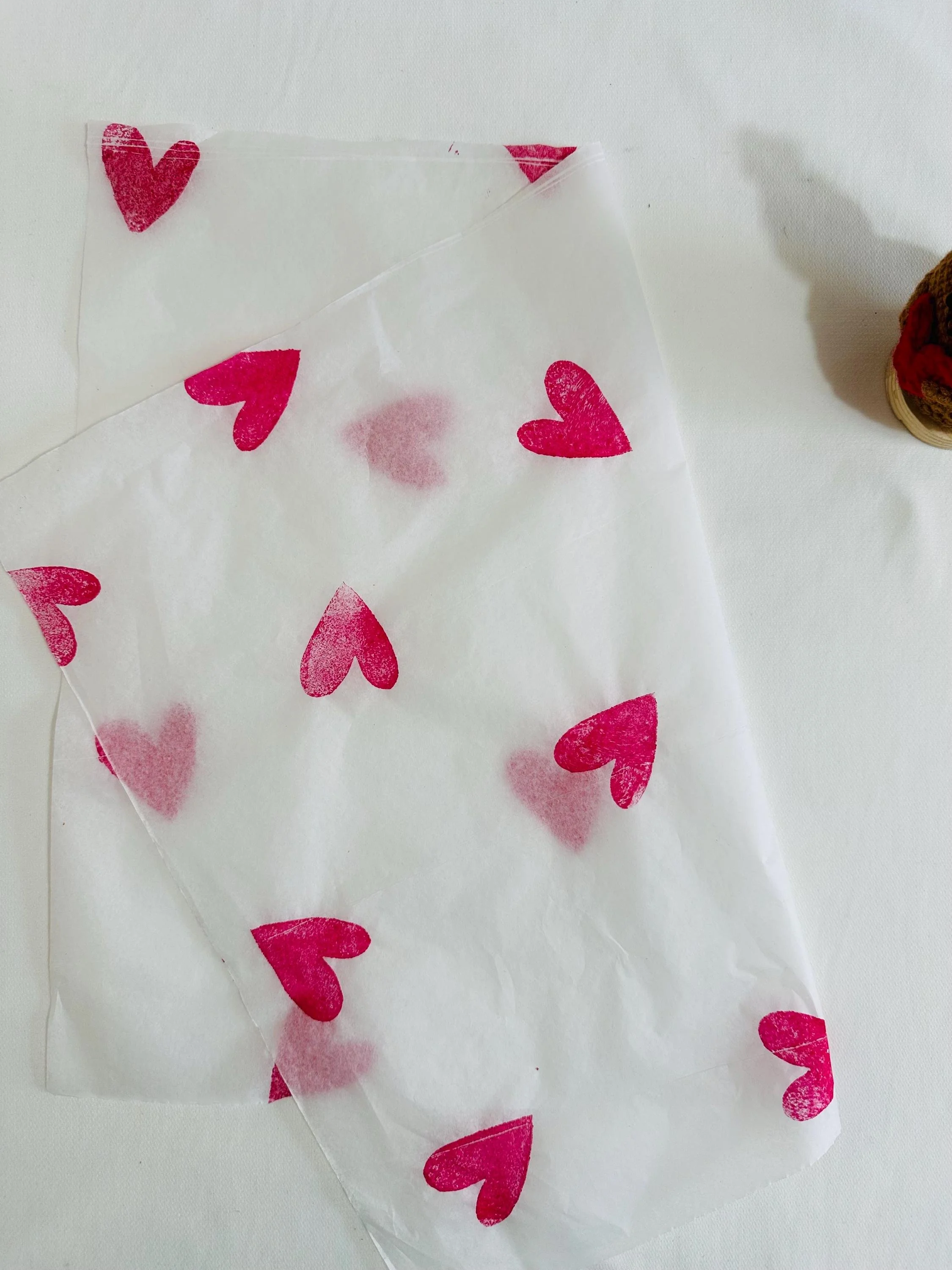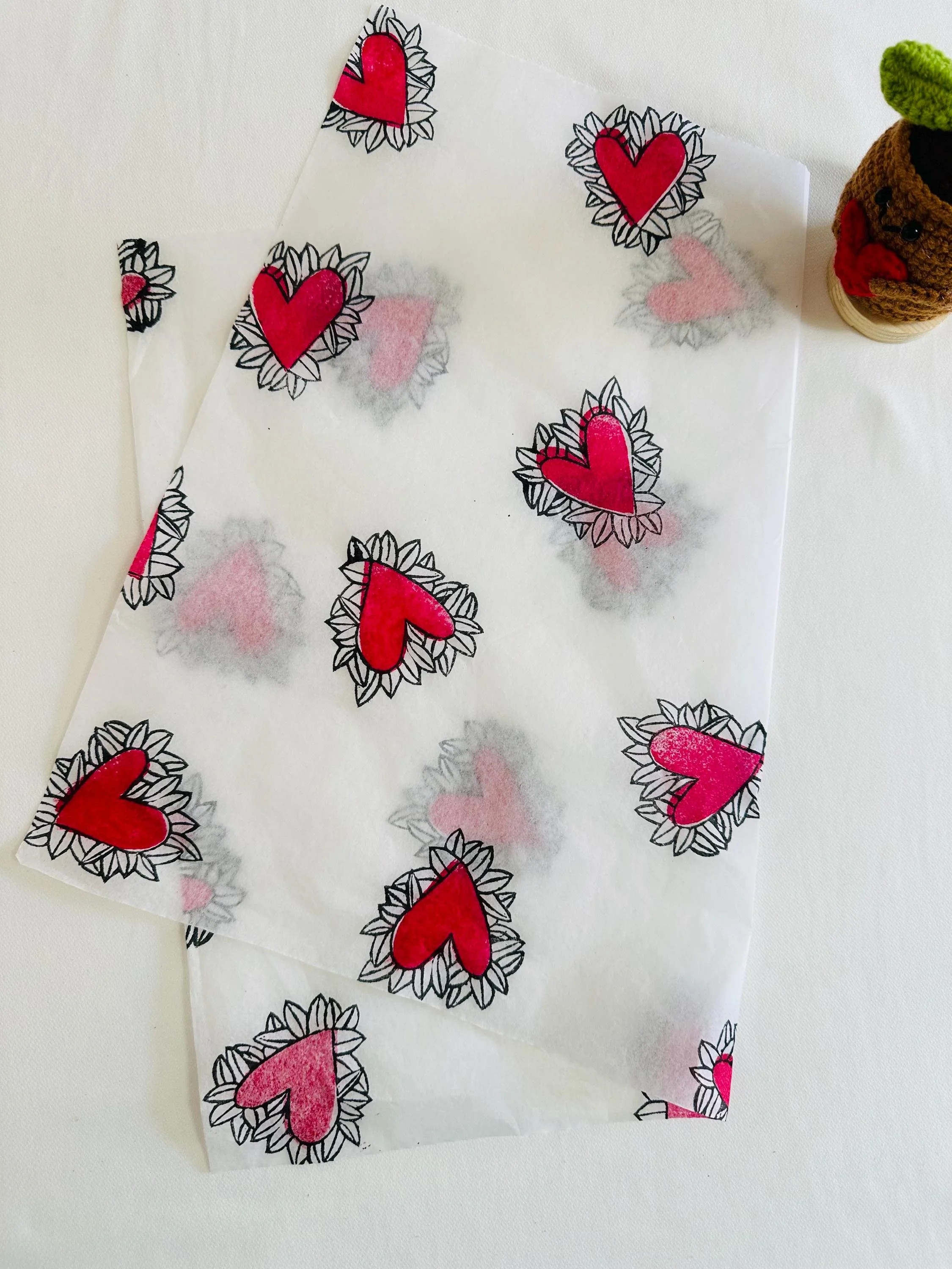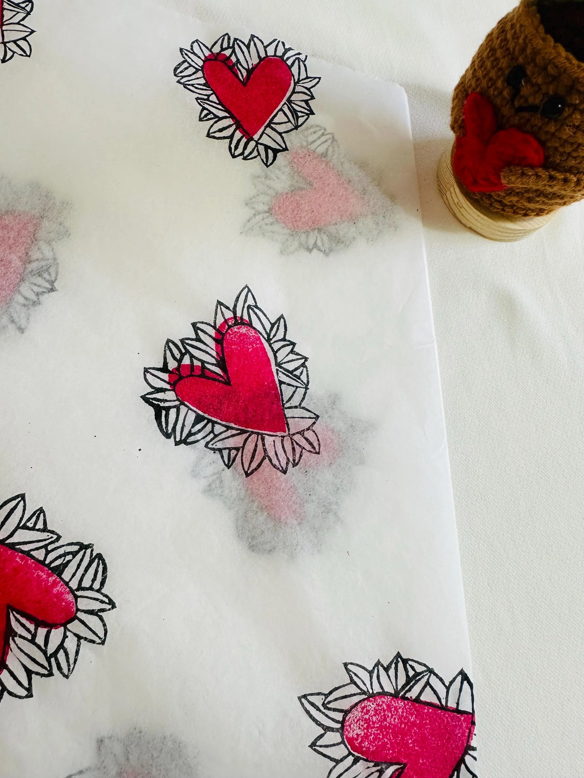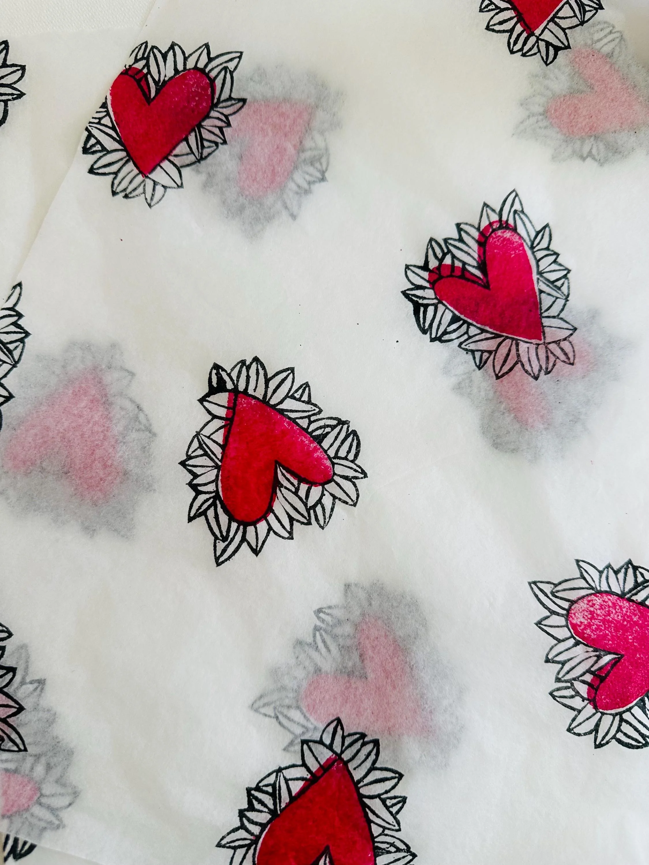 3 x Heart, Love, valentines Handprinted Eco Tissue paper, tissue paper, gift wrap, packaging, pretty packaging.