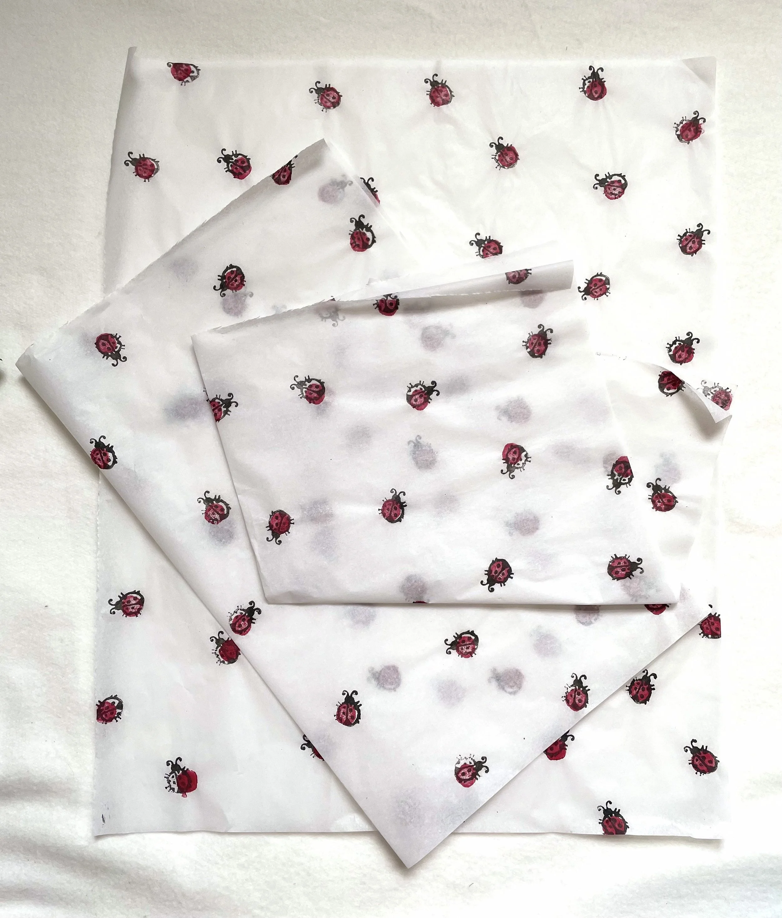 3 x Lady bird Handprinted Eco Tissue paper, tissue paper, gift wrap, packaging, pretty packaging.