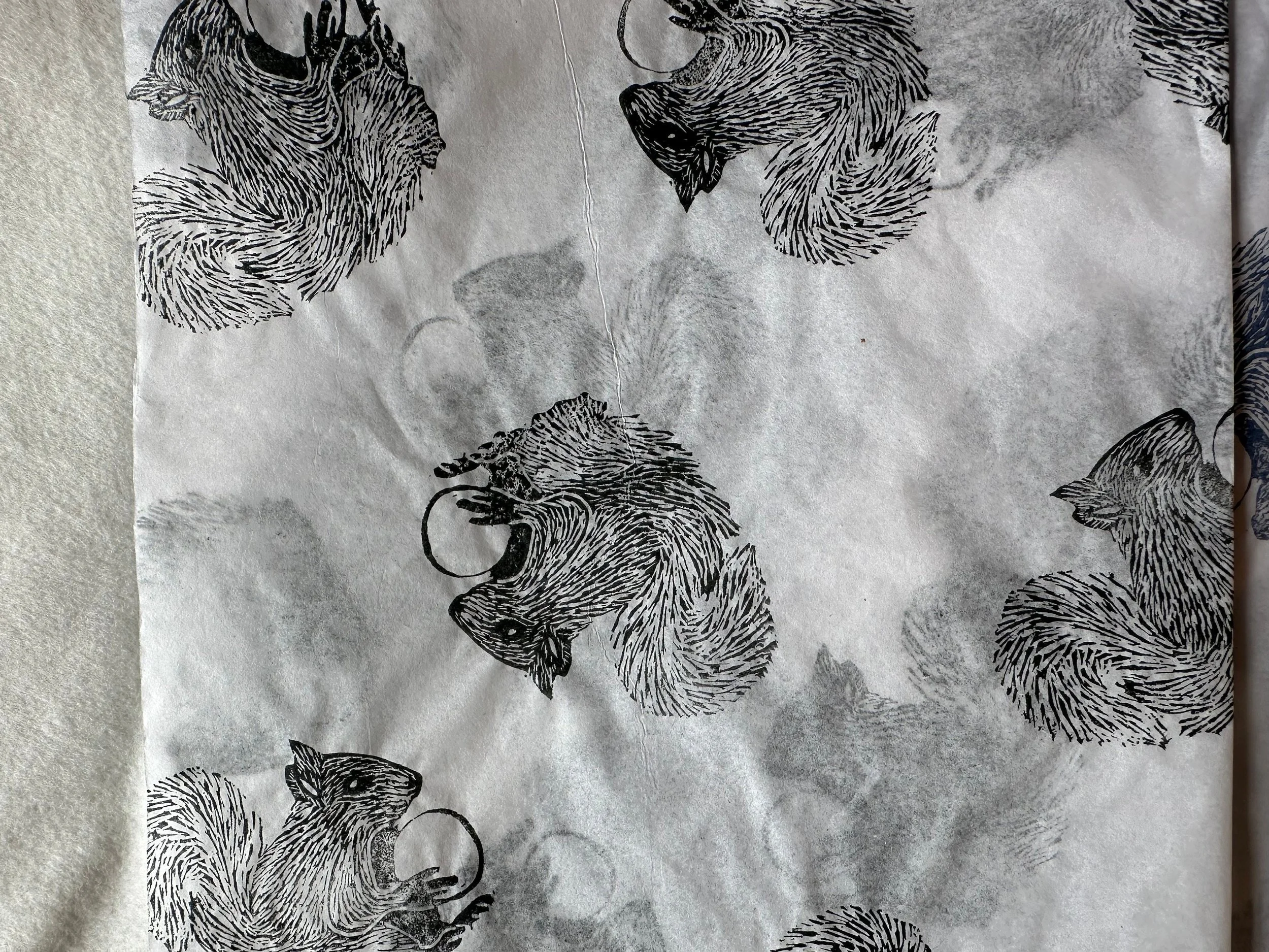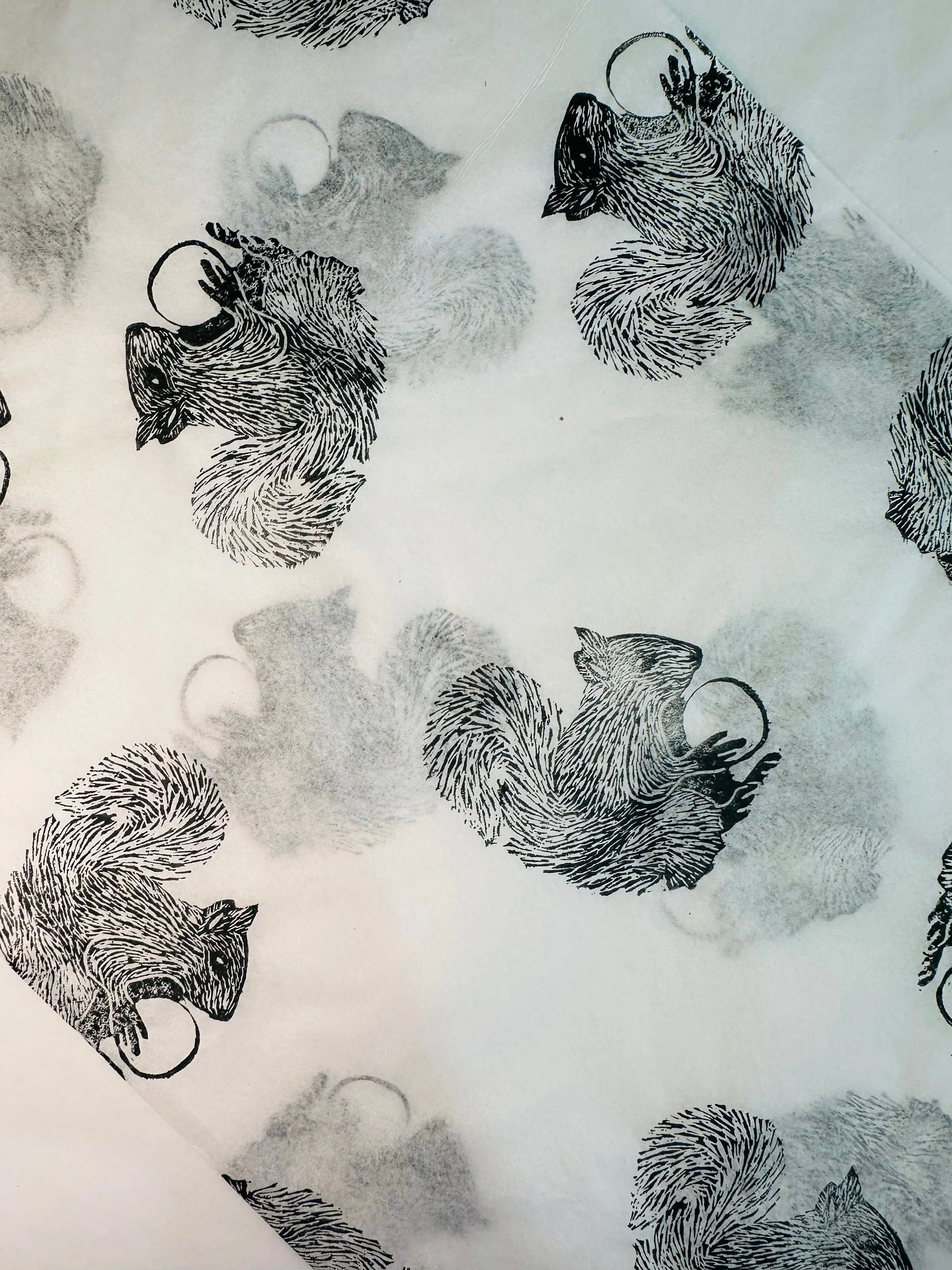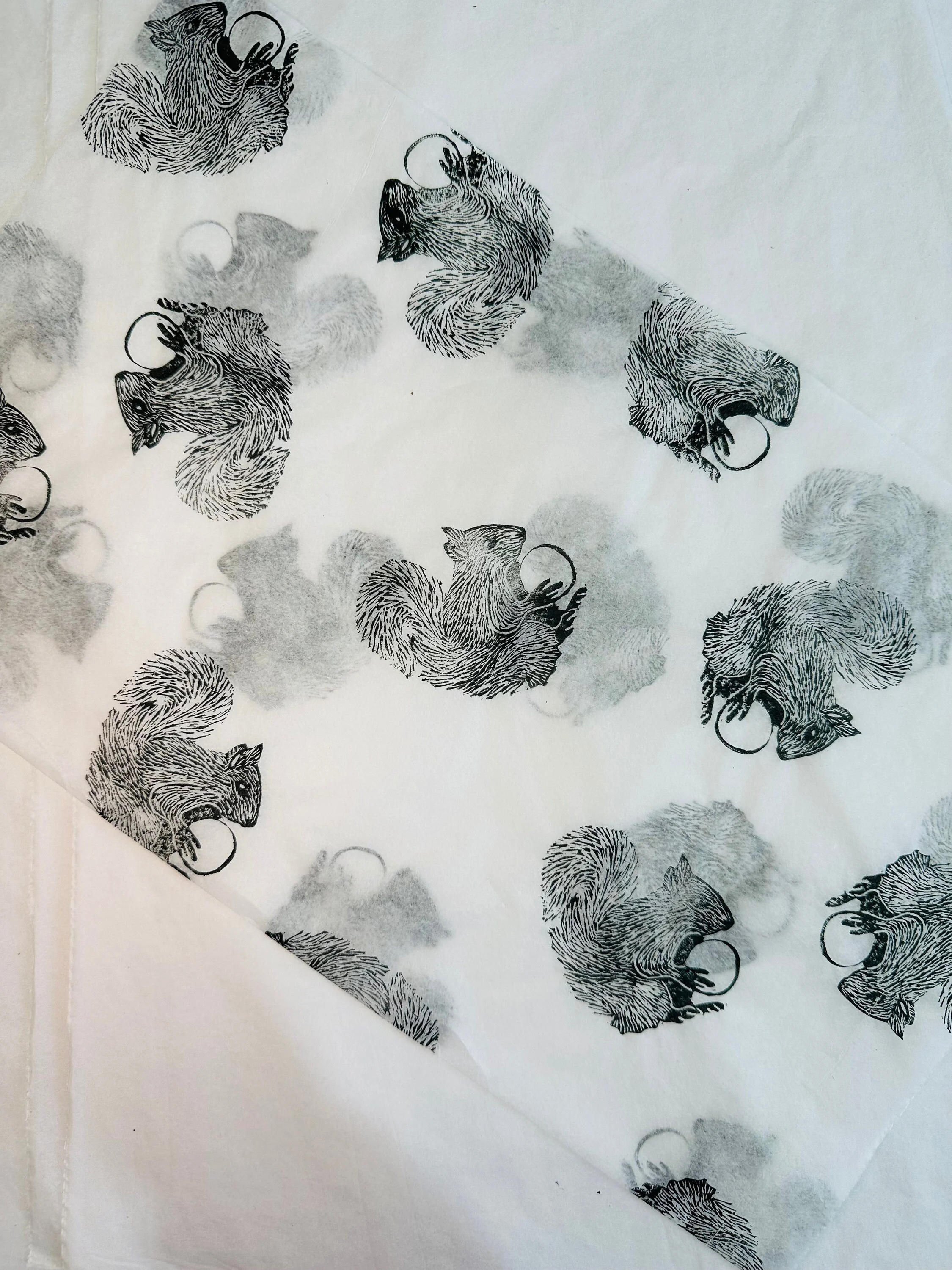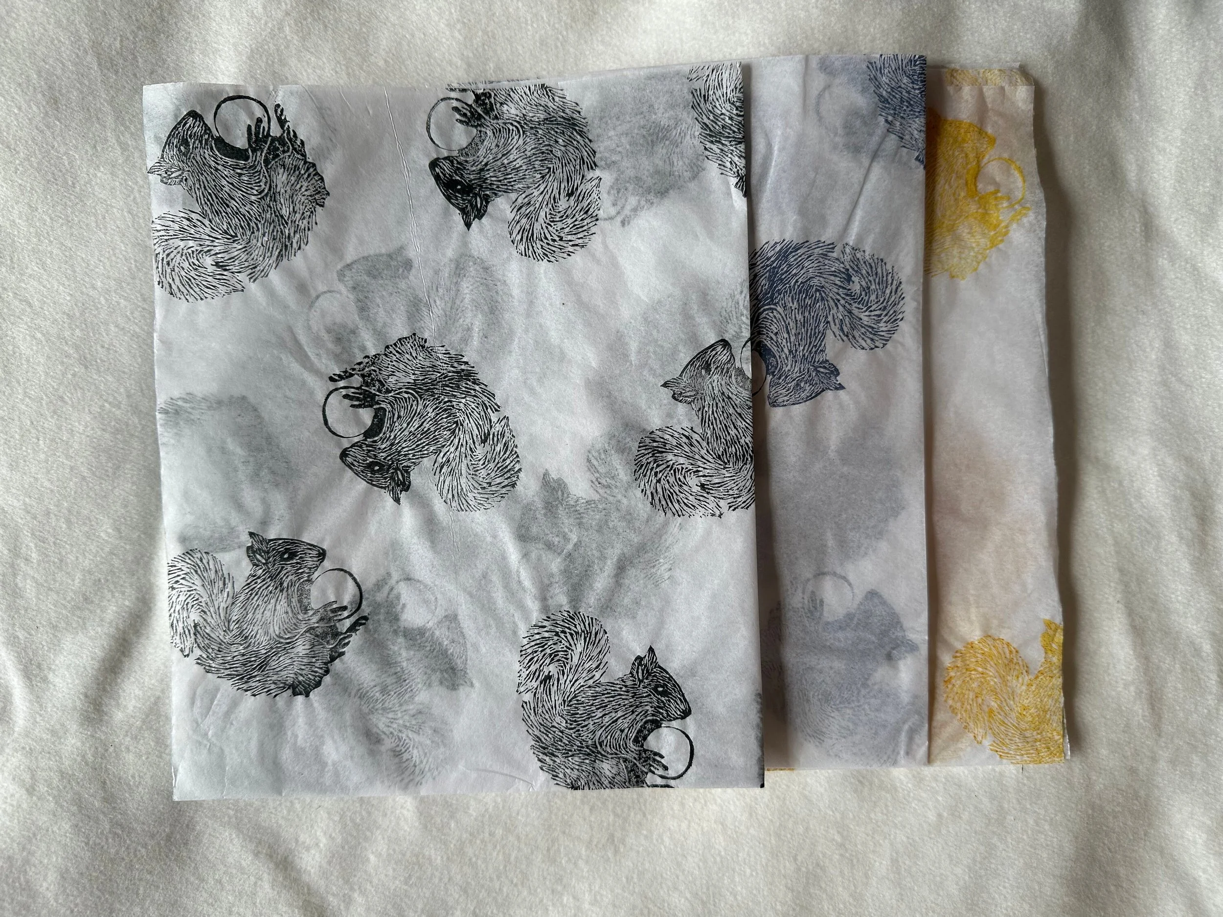 3 x squirrel Handprinted Eco Tissue paper, tissue paper, gift wrap, packaging, pretty packaging.