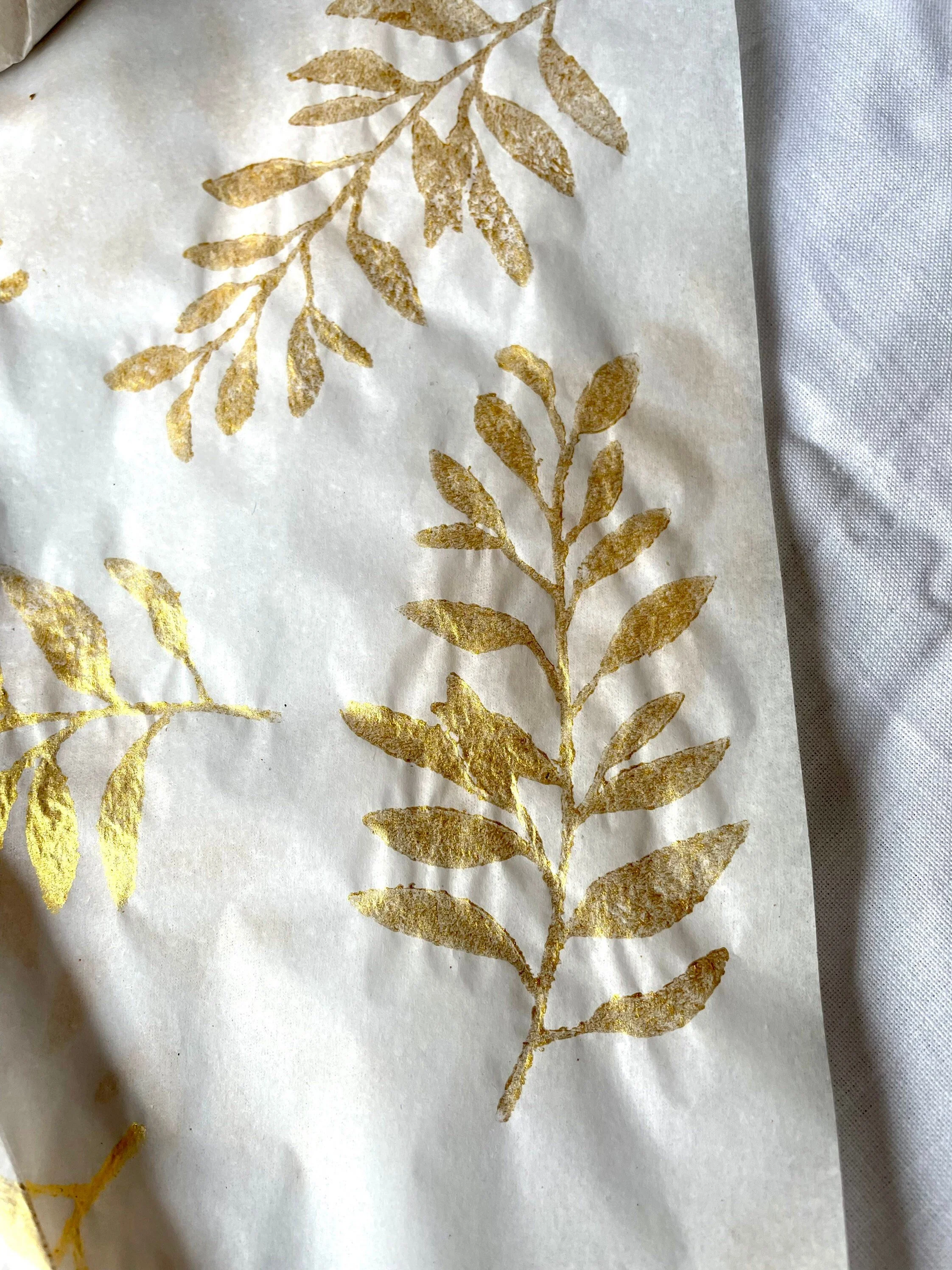Handprinted with our olive leaf stamp using the most luscious Golden ink.