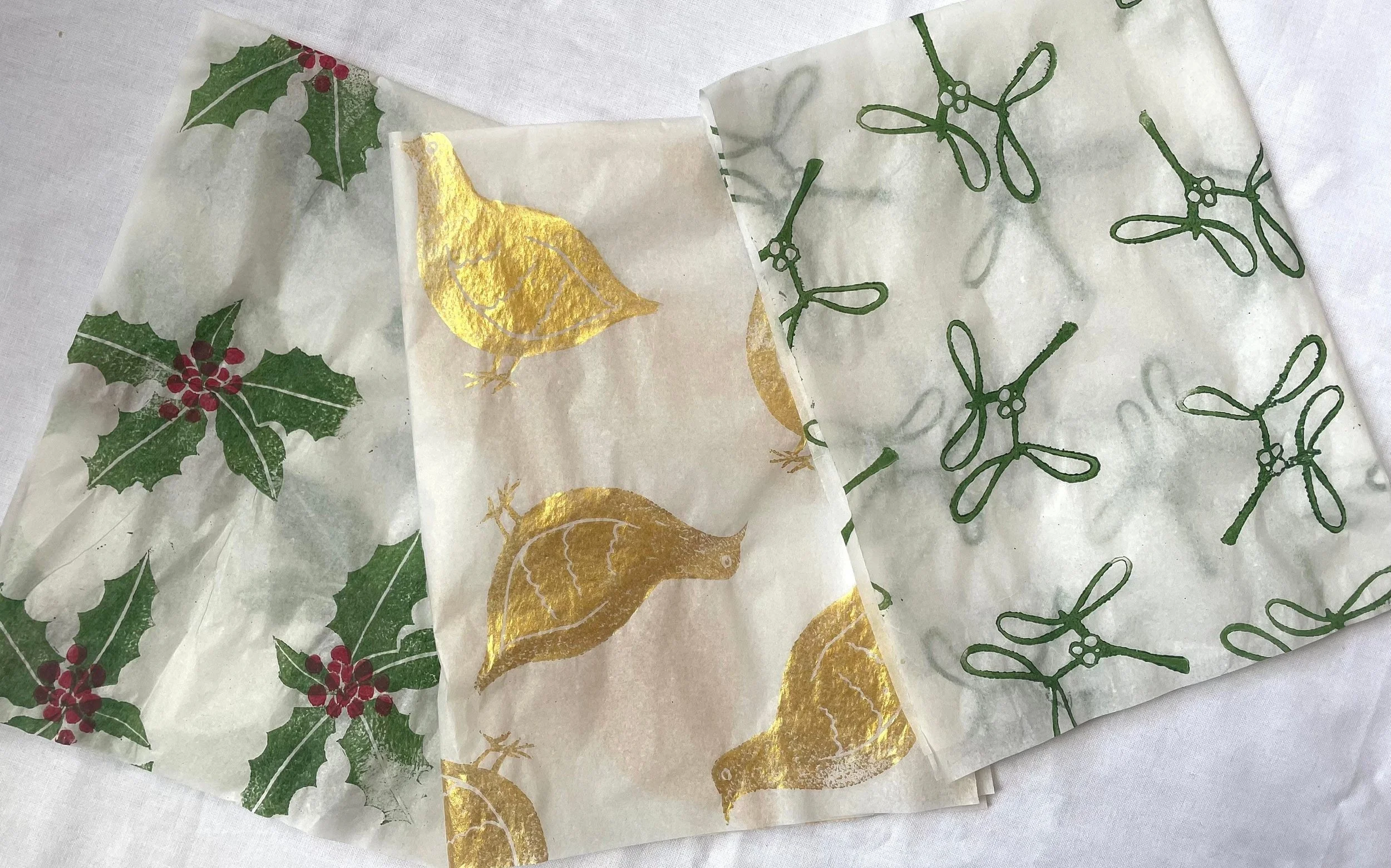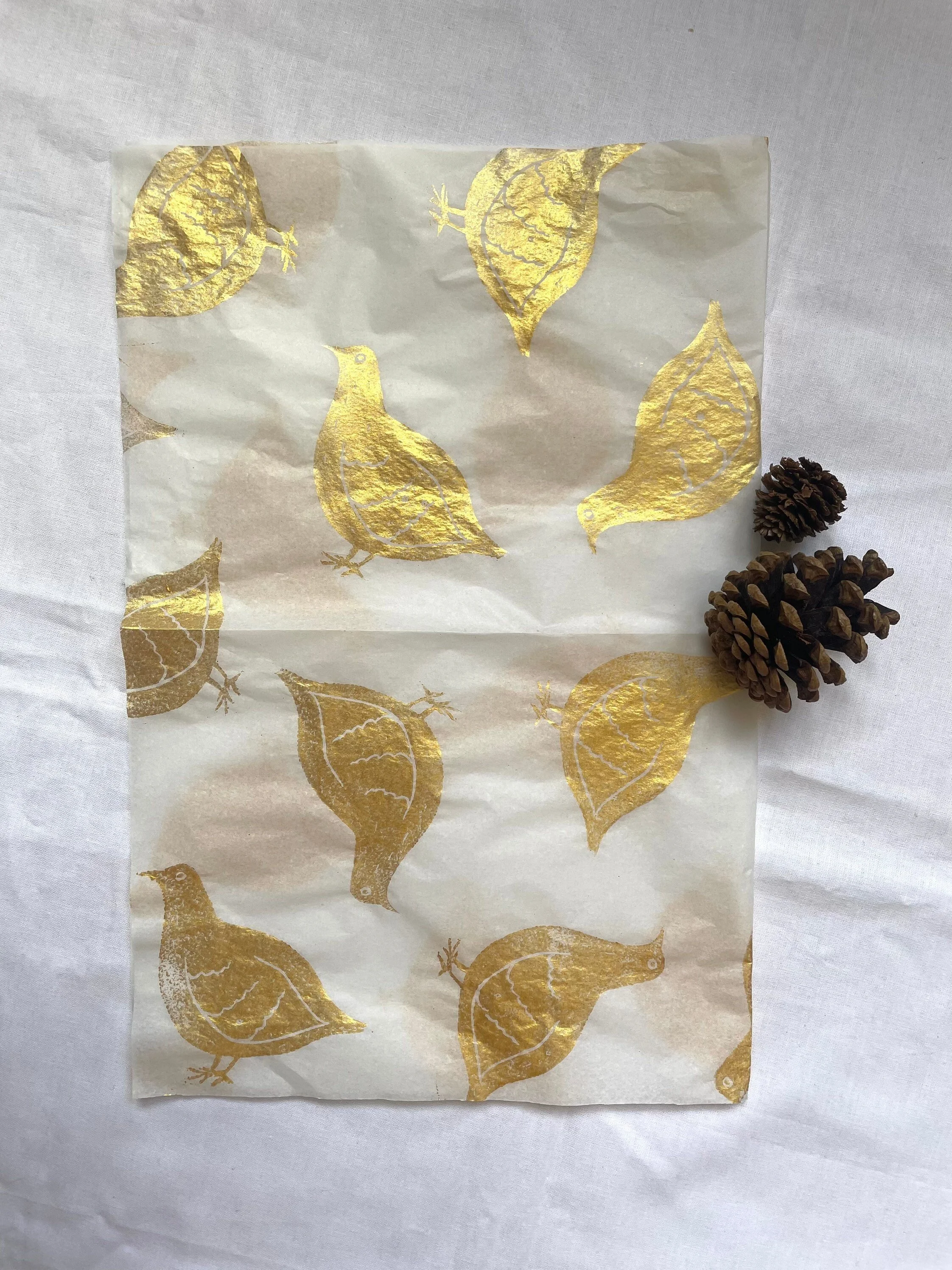 3x Golden Partrige, Handprinted Eco Tissue paper, tissue paper, gift wrap, packaging, pretty packaging. 3x sheets Christmas tissue paper,