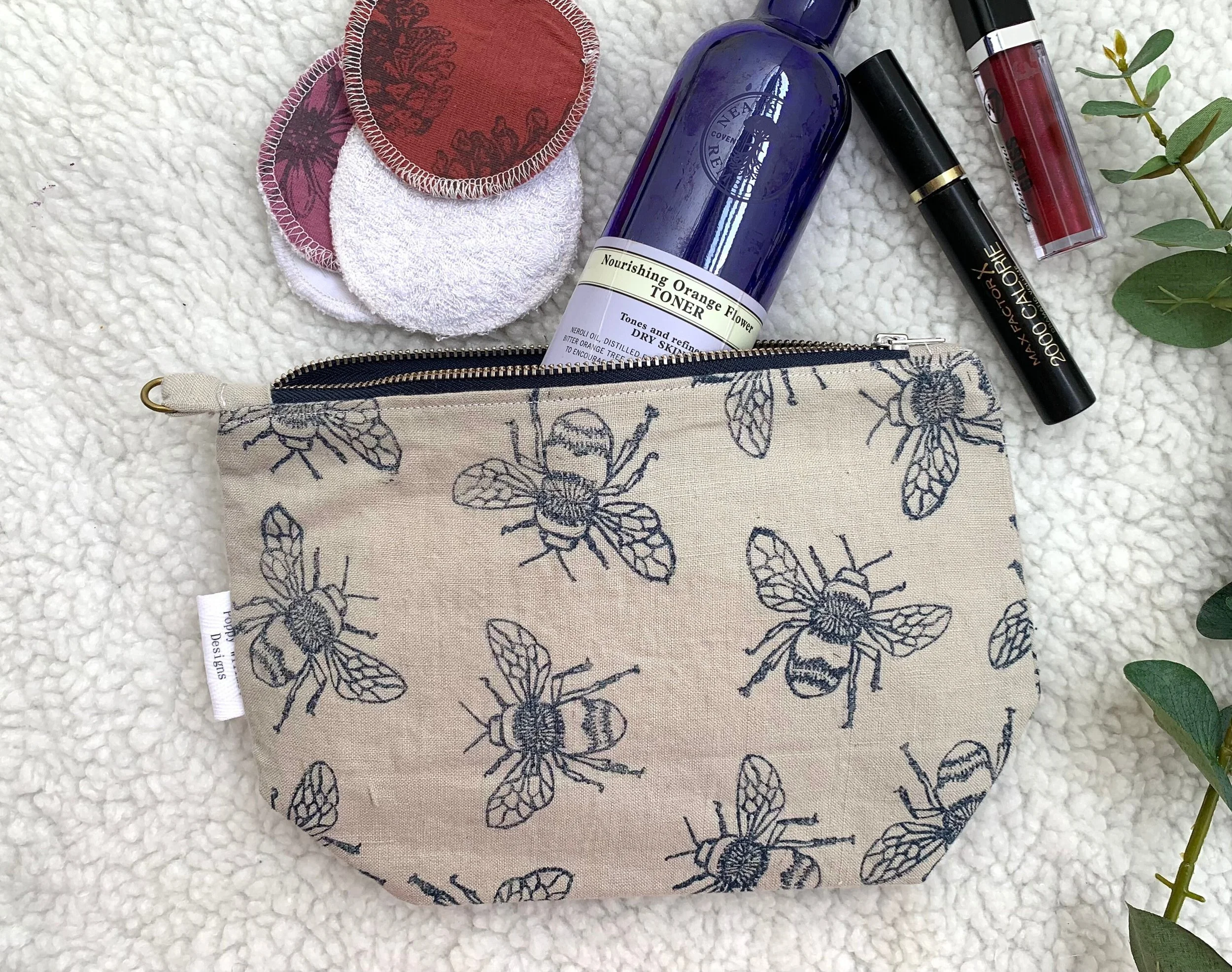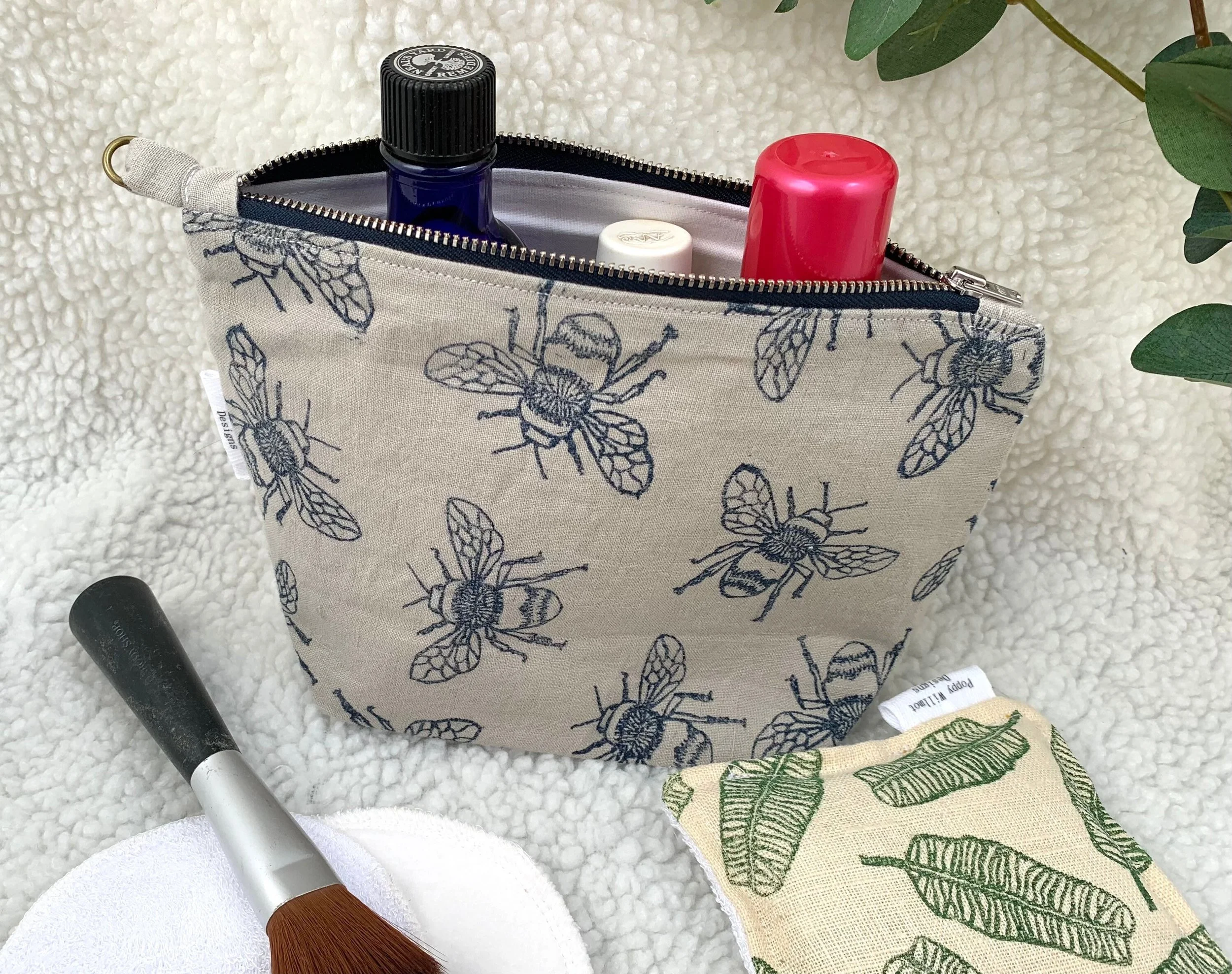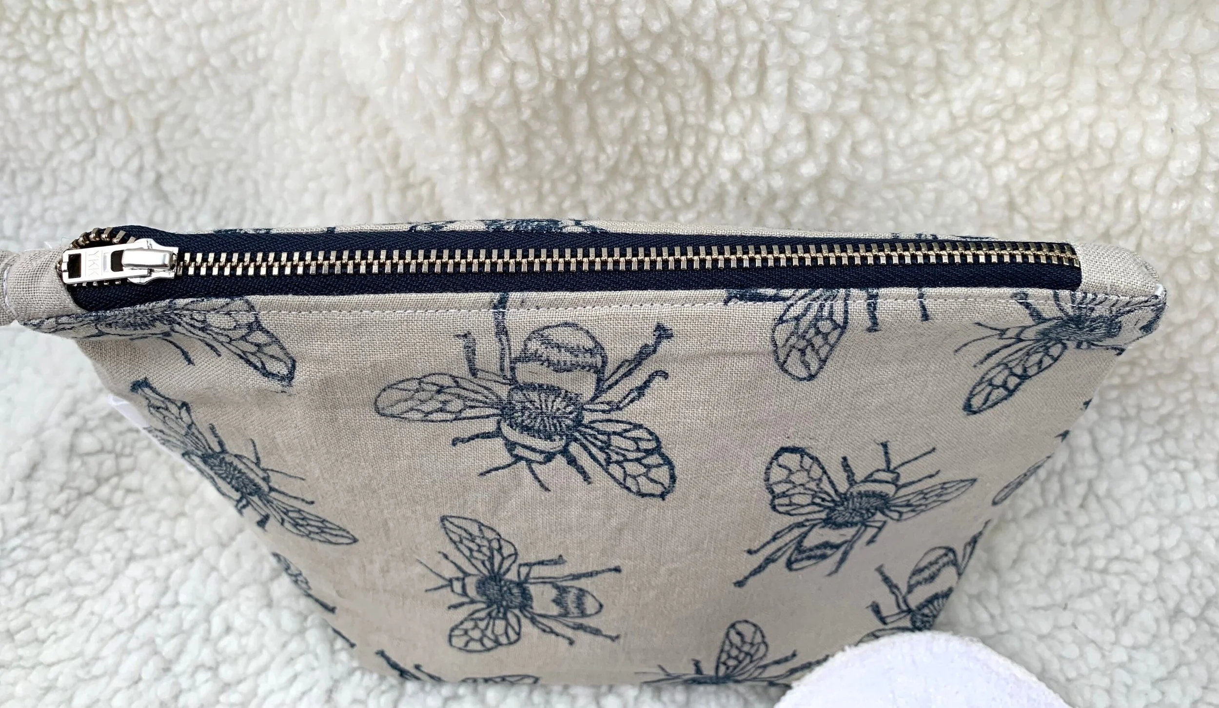 Cosmetic case, make up bag, zip up pouch, travel case, vanity bag, bees, handprinted, metal zip
