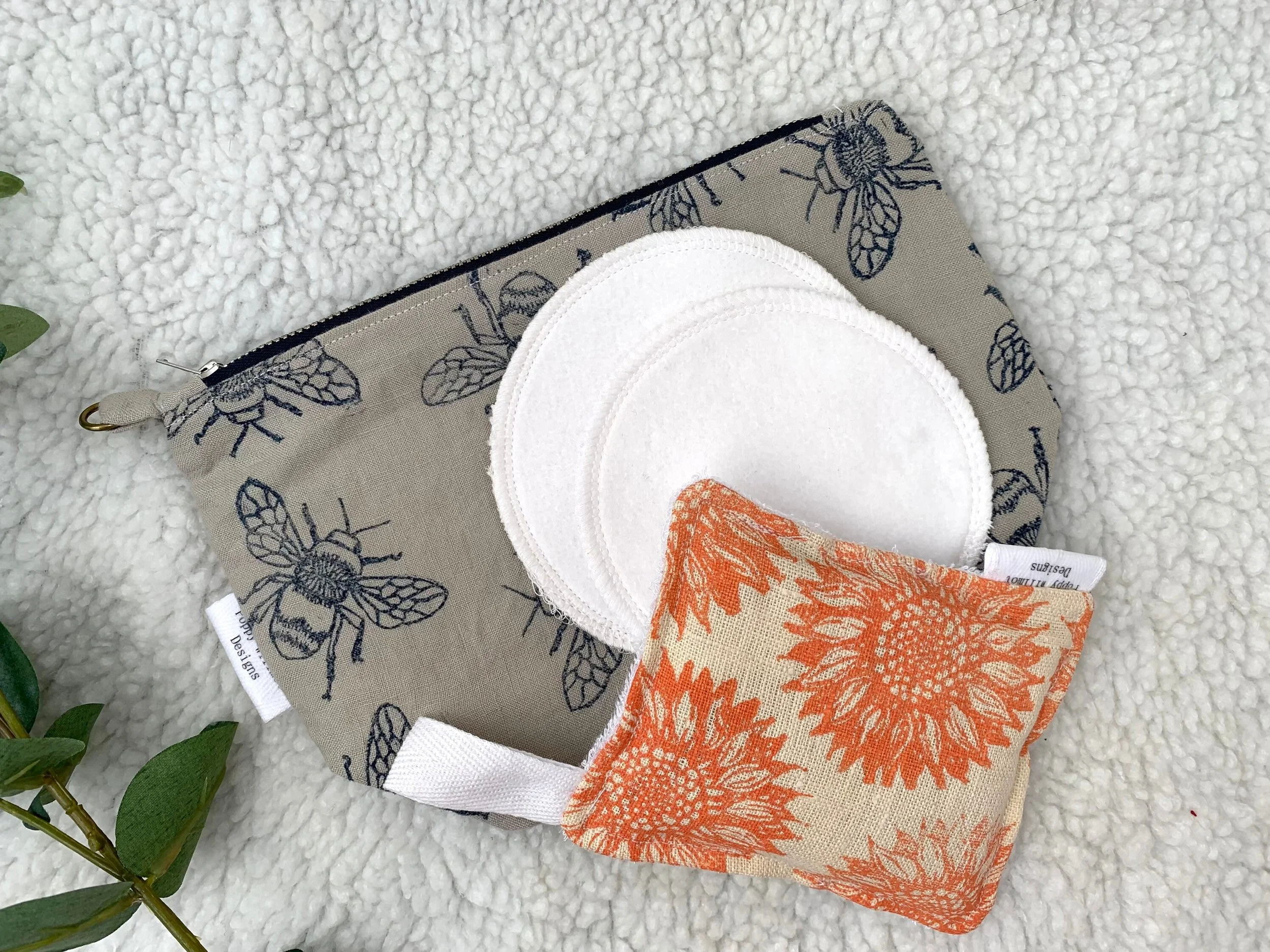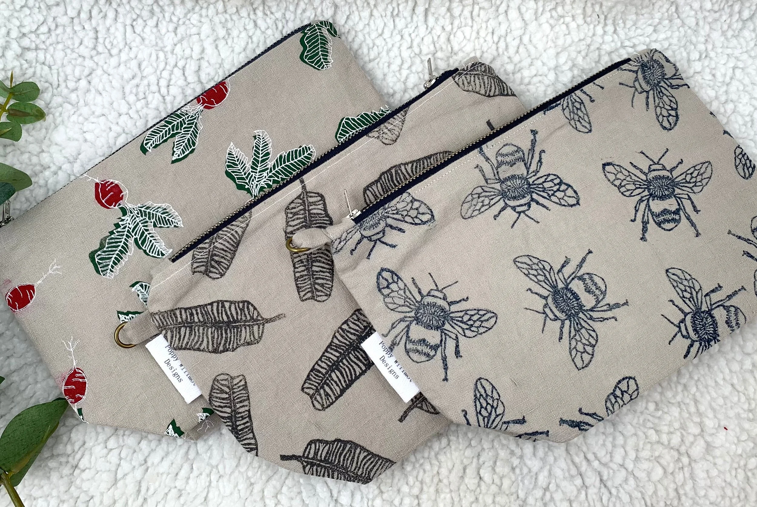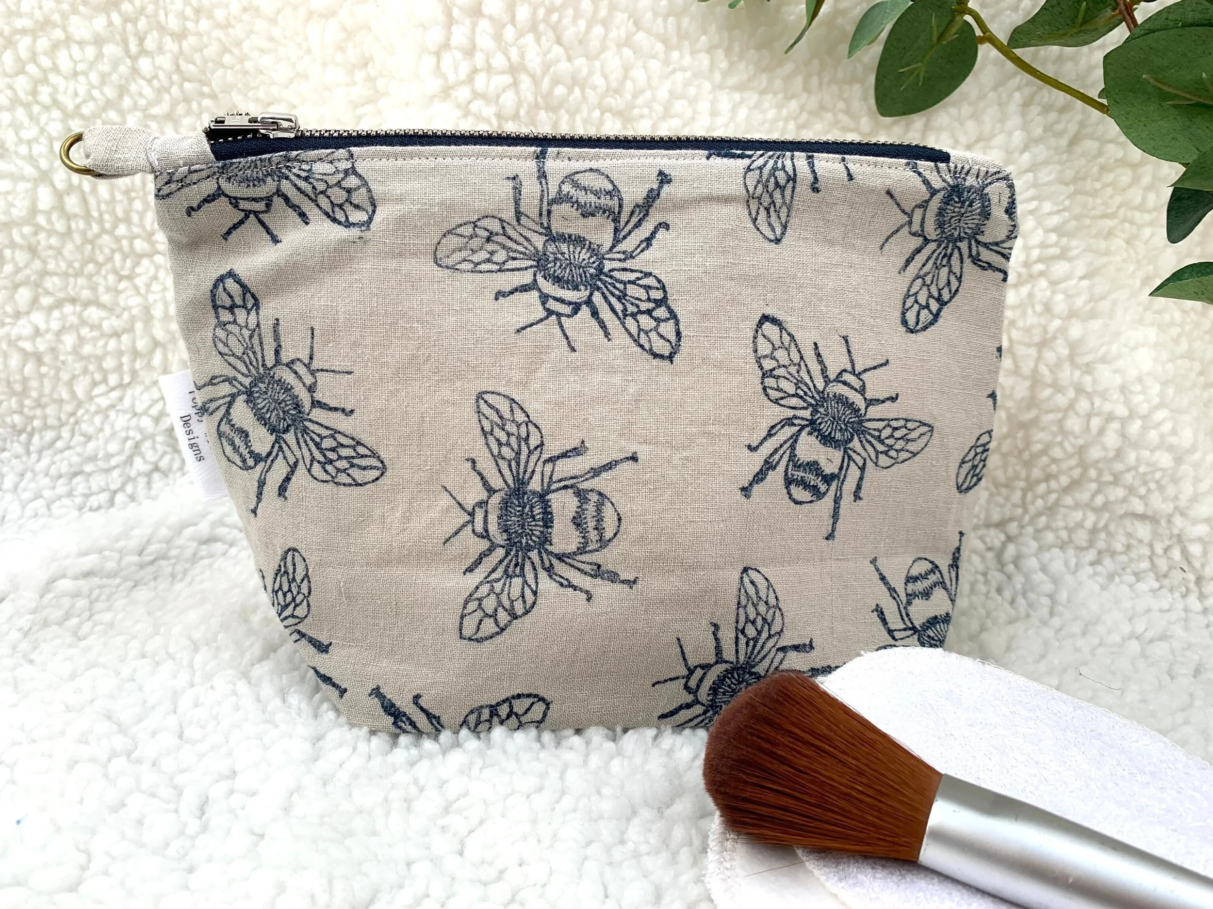 Cosmetic case, make up bag, zip up pouch, travel case, vanity bag, bees, handprinted, metal zip