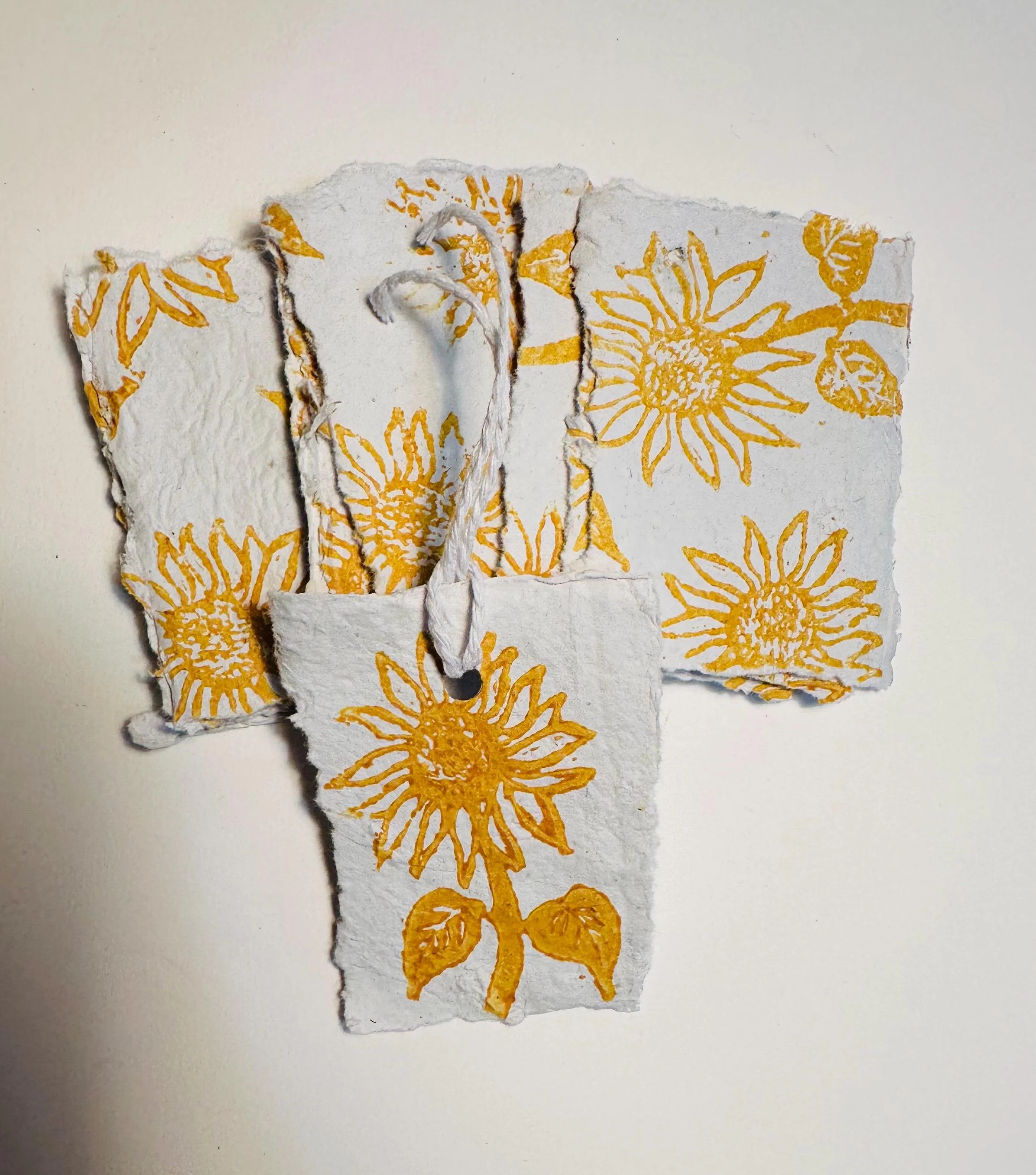 Gift tags, handmade paper tags, swing tags, recycled paper| coloured x 4 | sunflowers