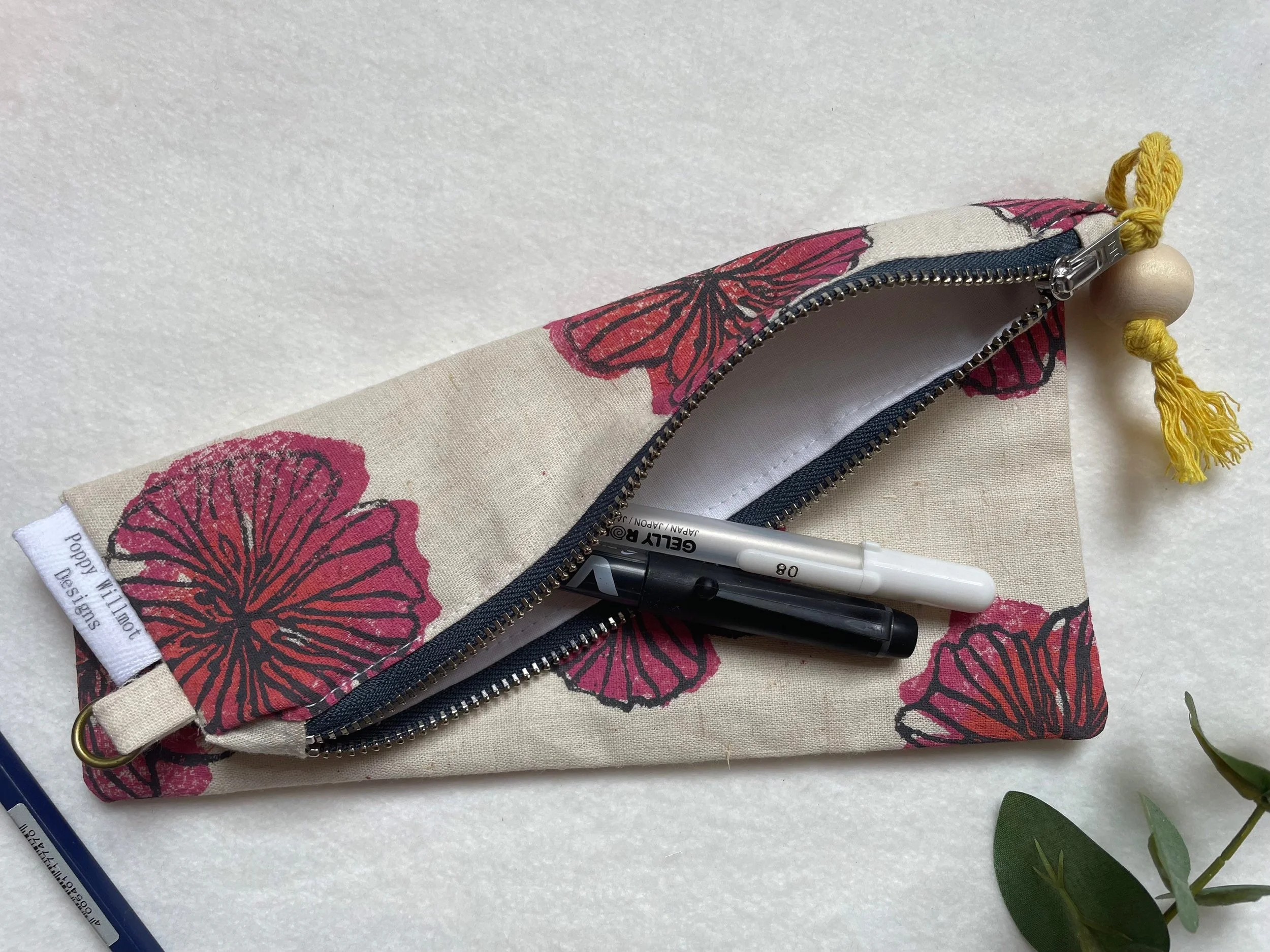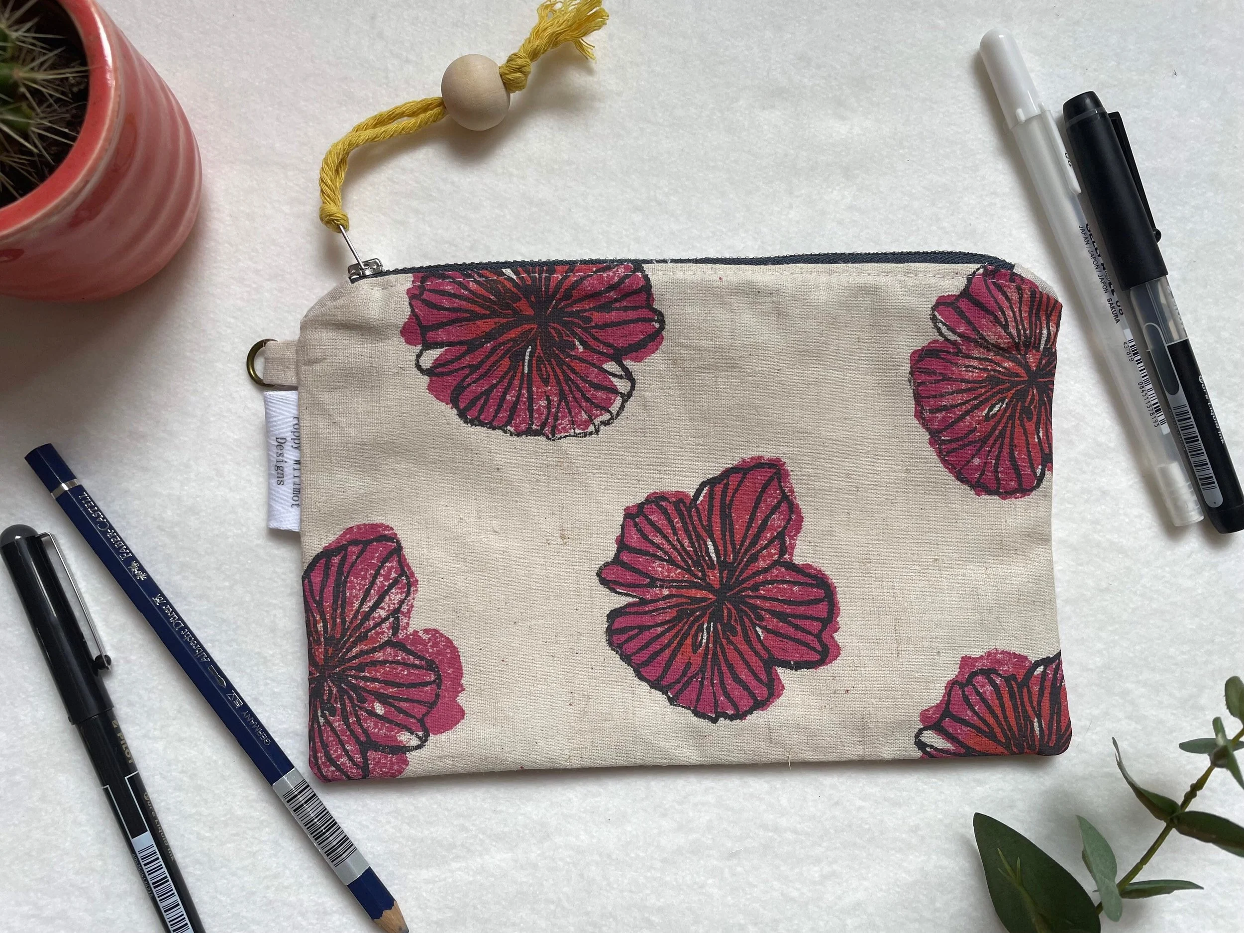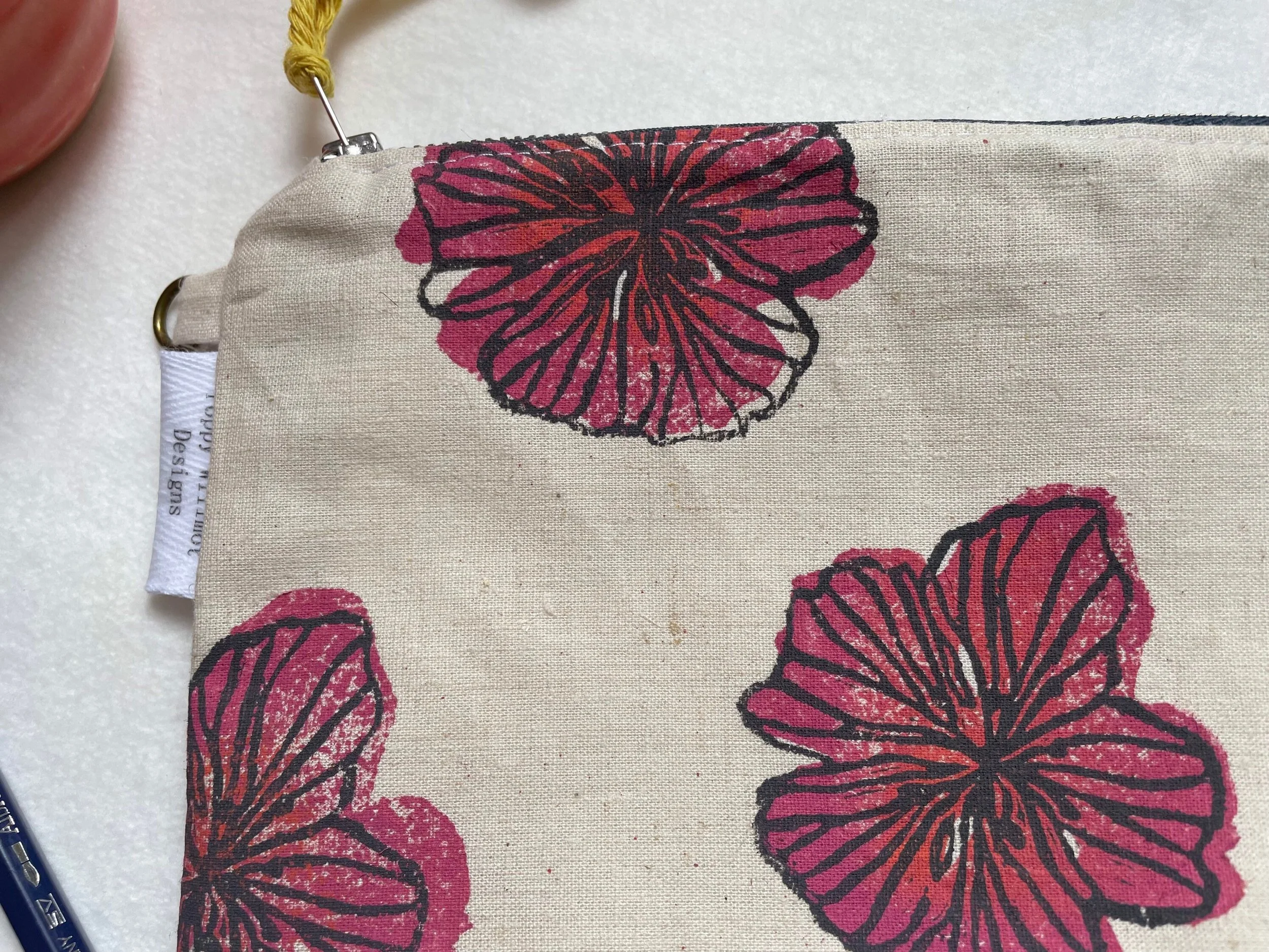 Hibiscus flat pencil case, make up bag, purse,handprinted, handmade, linen