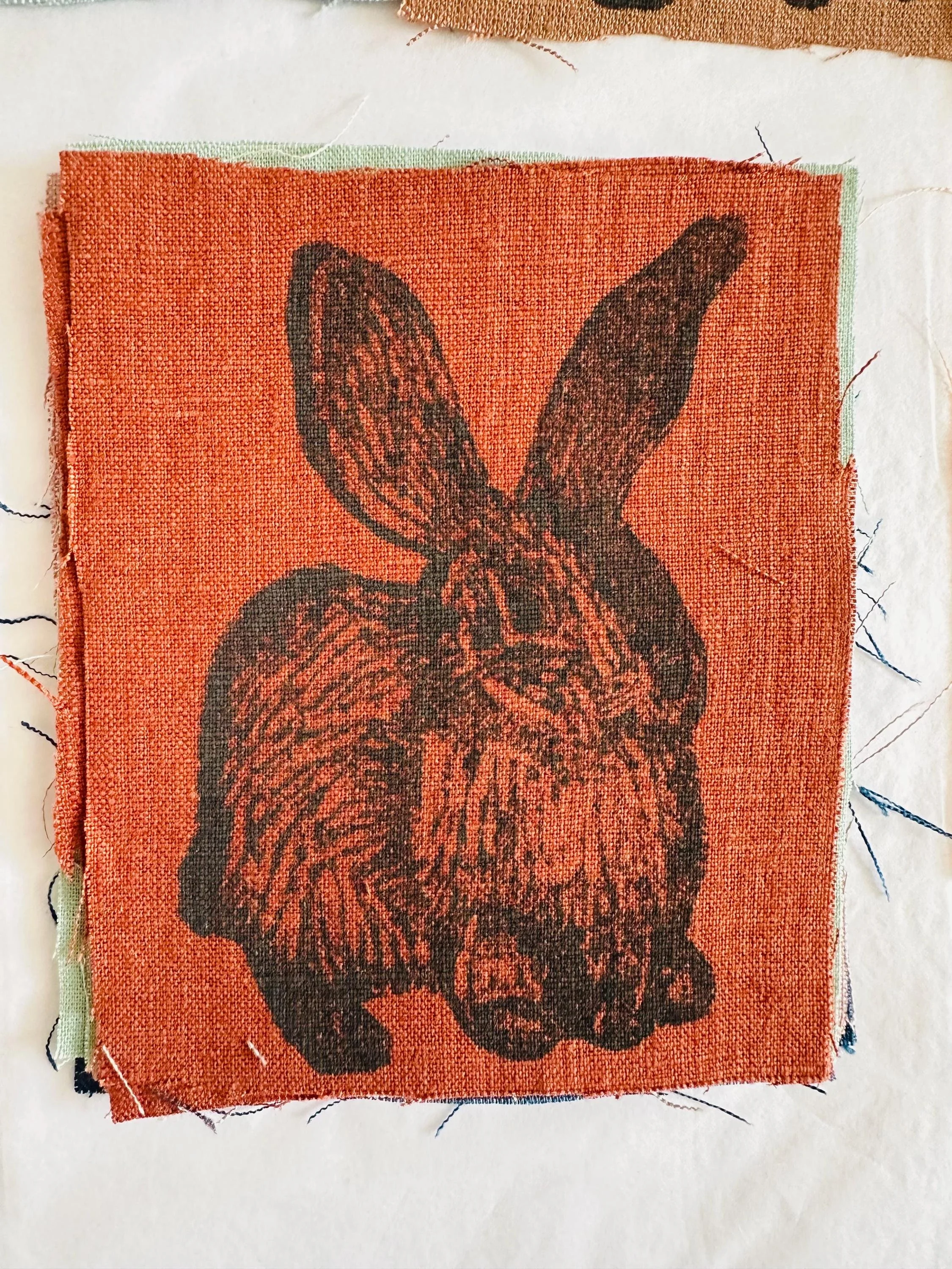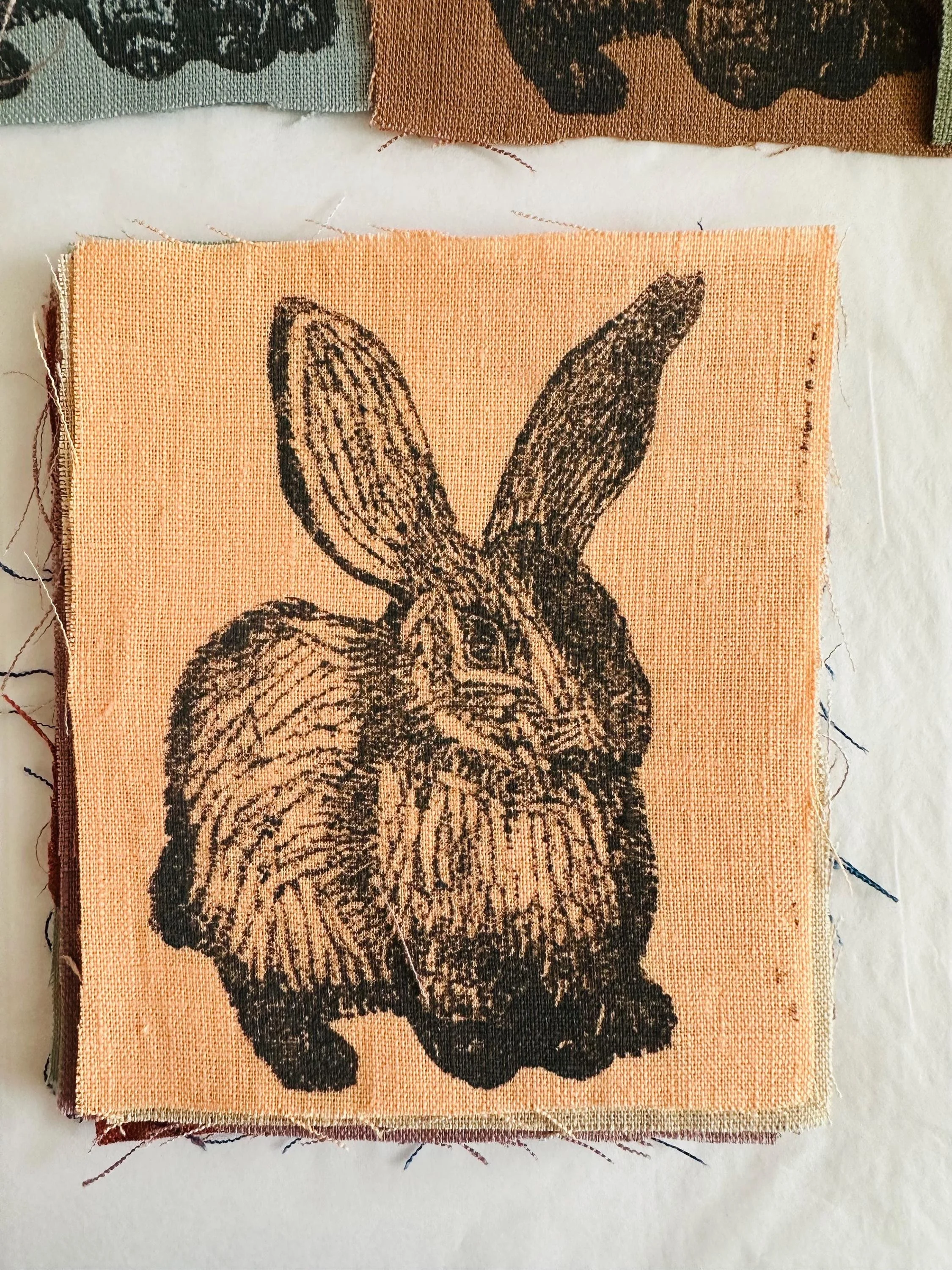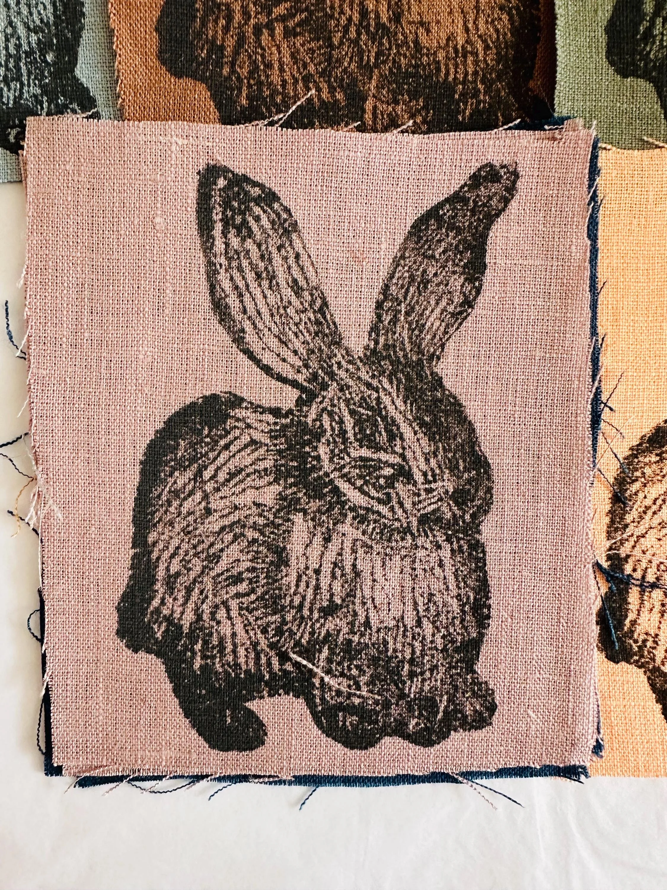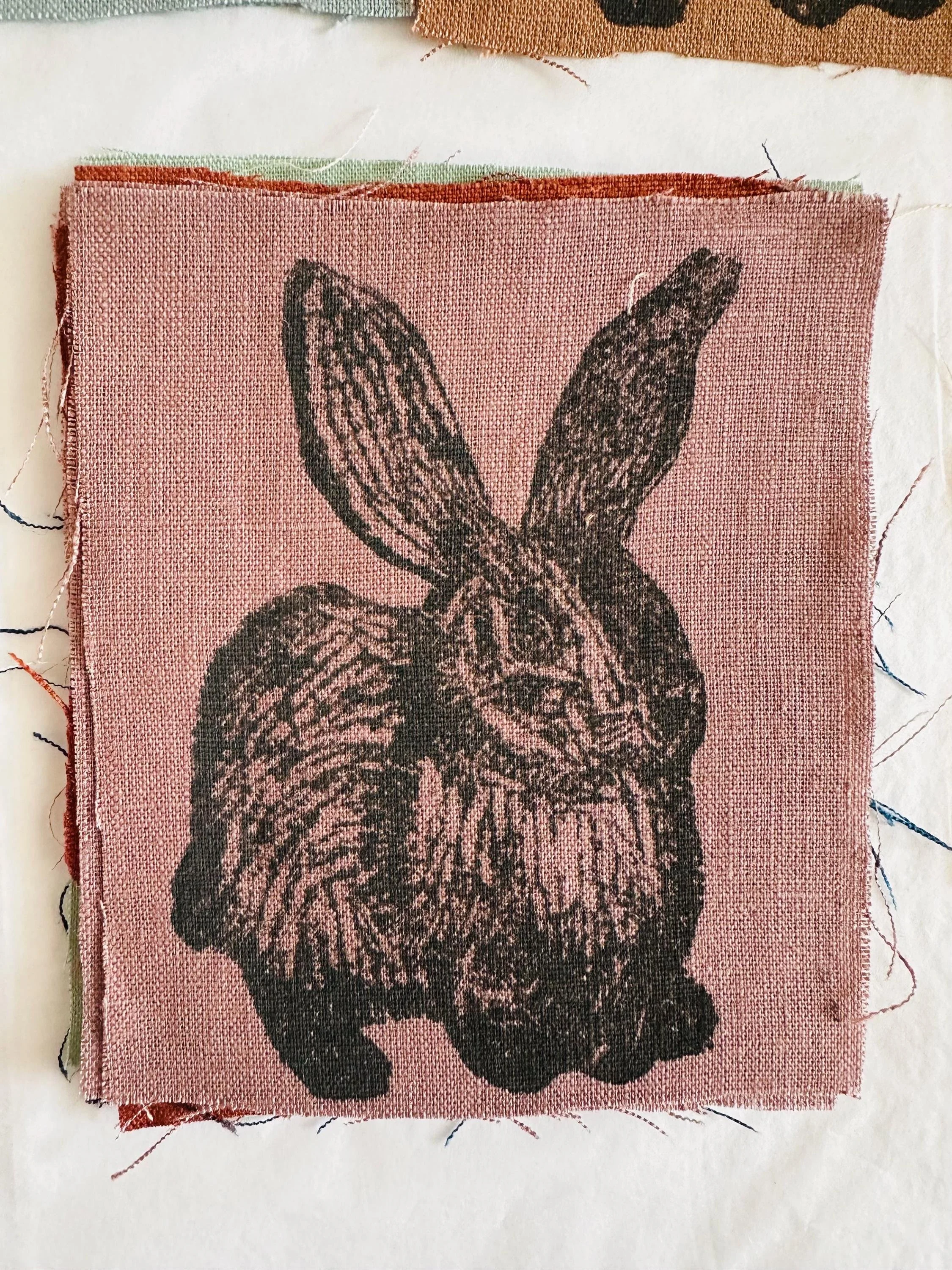 Linen patches, bunny Rabbit, Lino print patches, fabric patch, clothing patch, quilting, textile crafts, cottage core