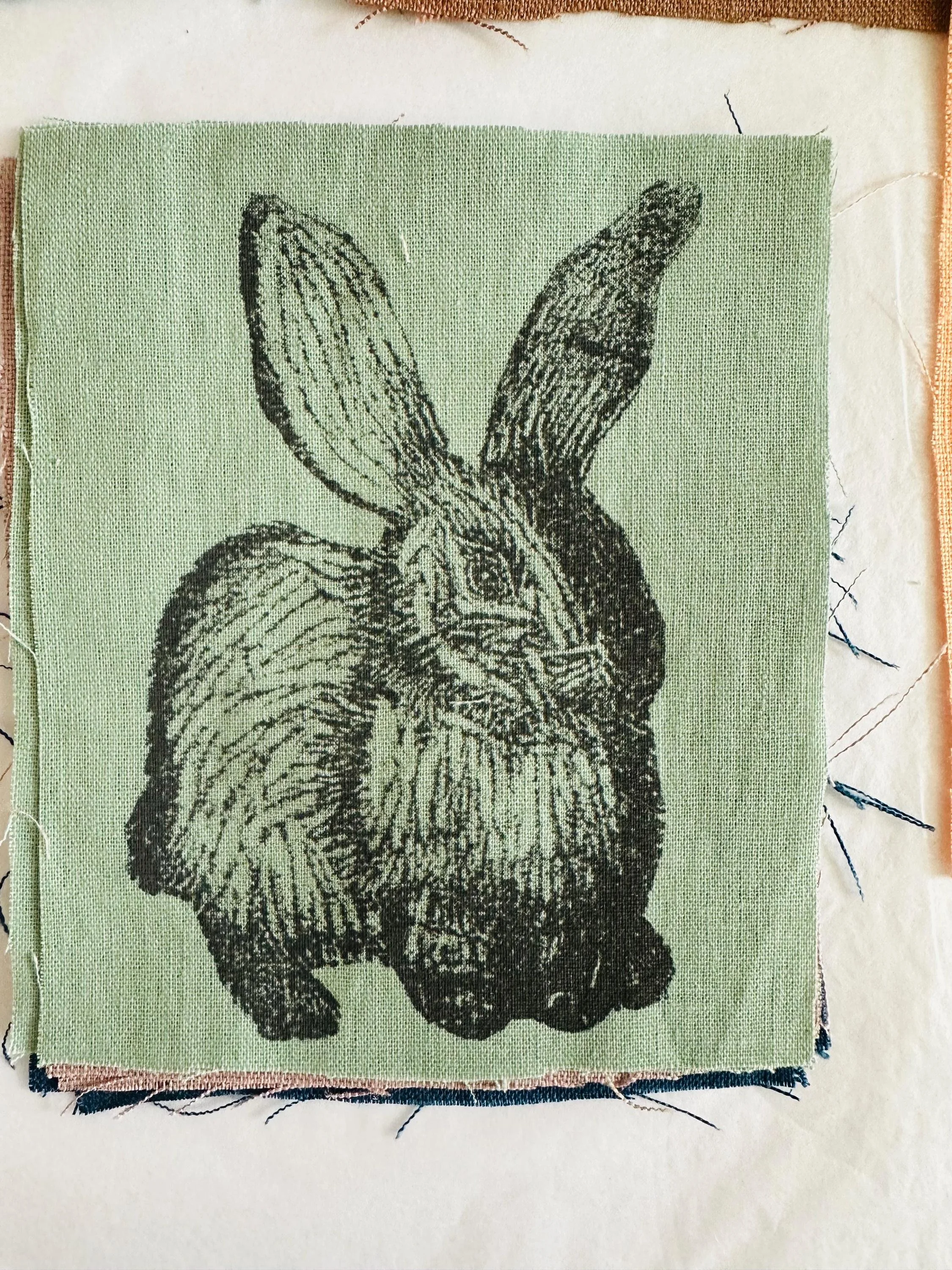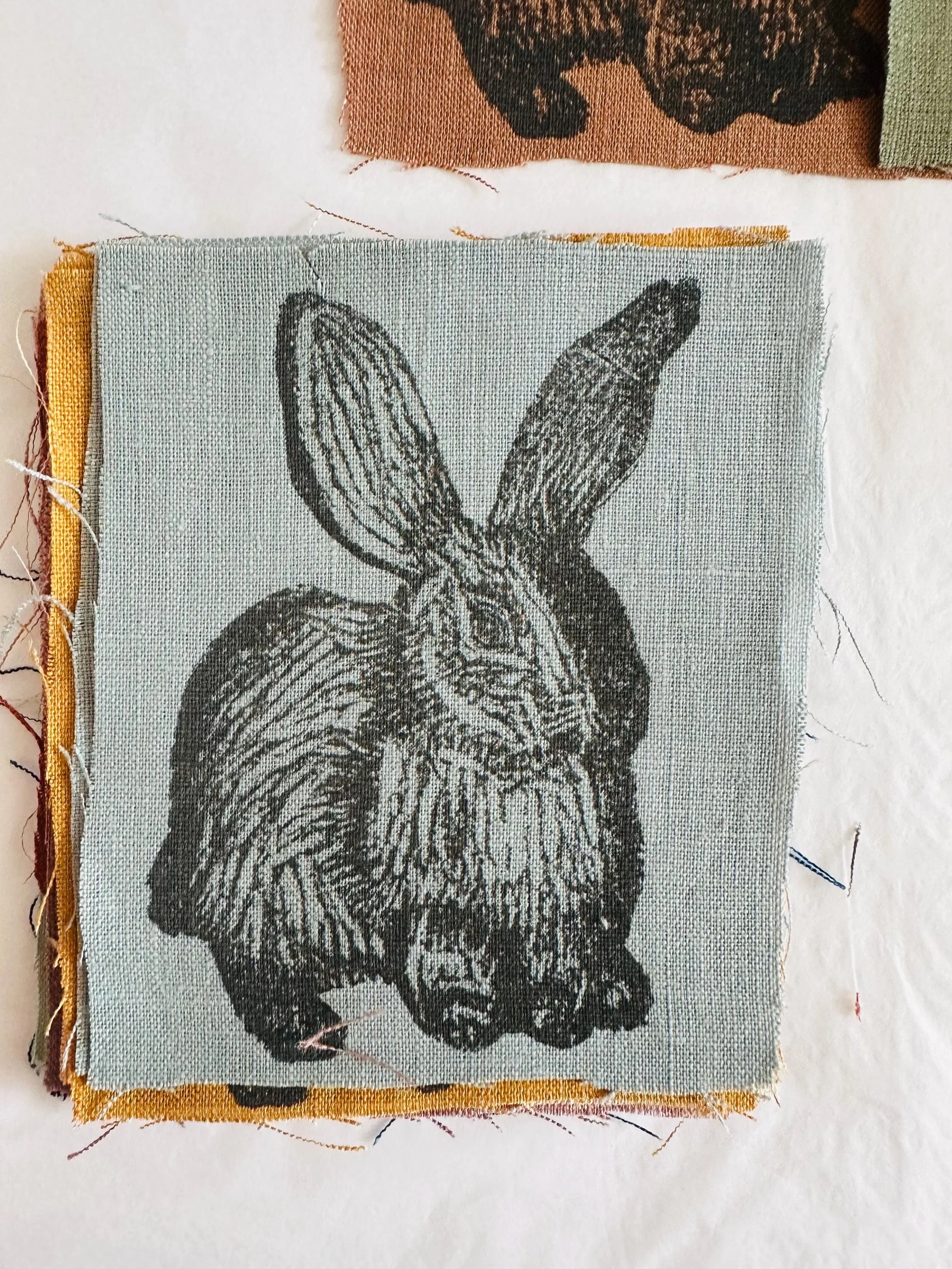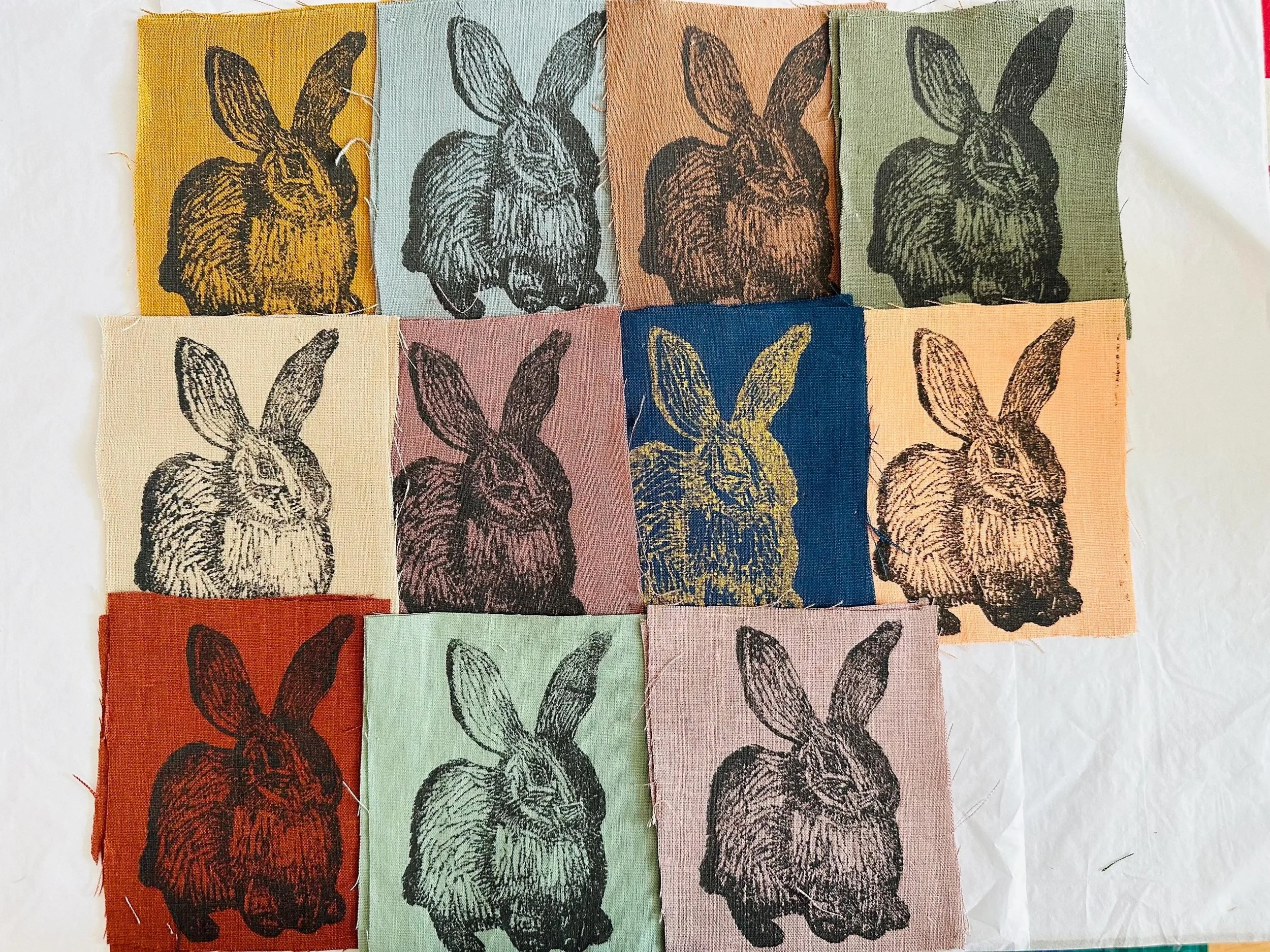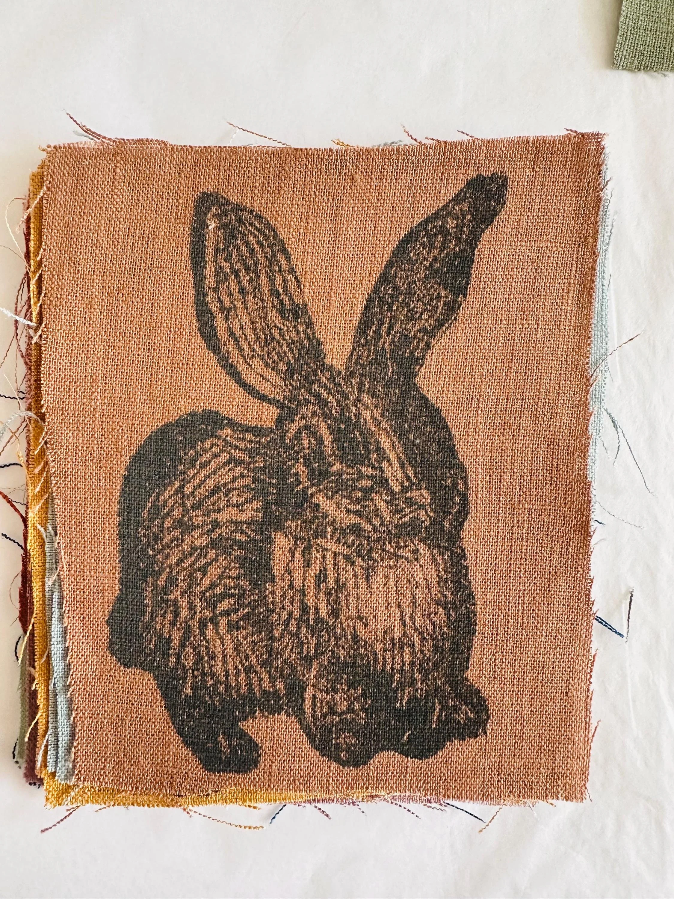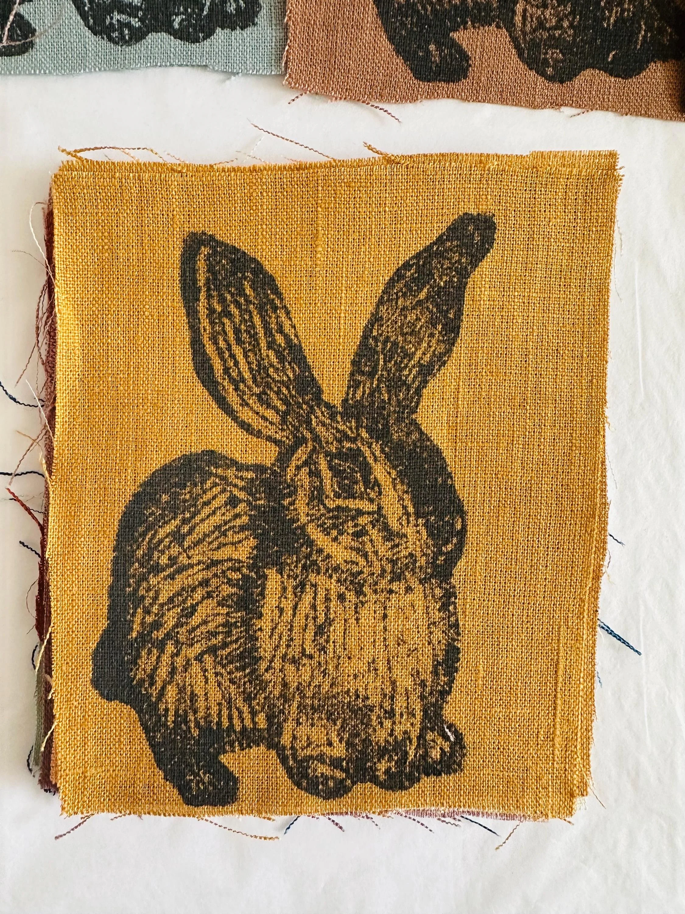 Linen patches, bunny Rabbit, Lino print patches, fabric patch, clothing patch, quilting, textile crafts, cottage core