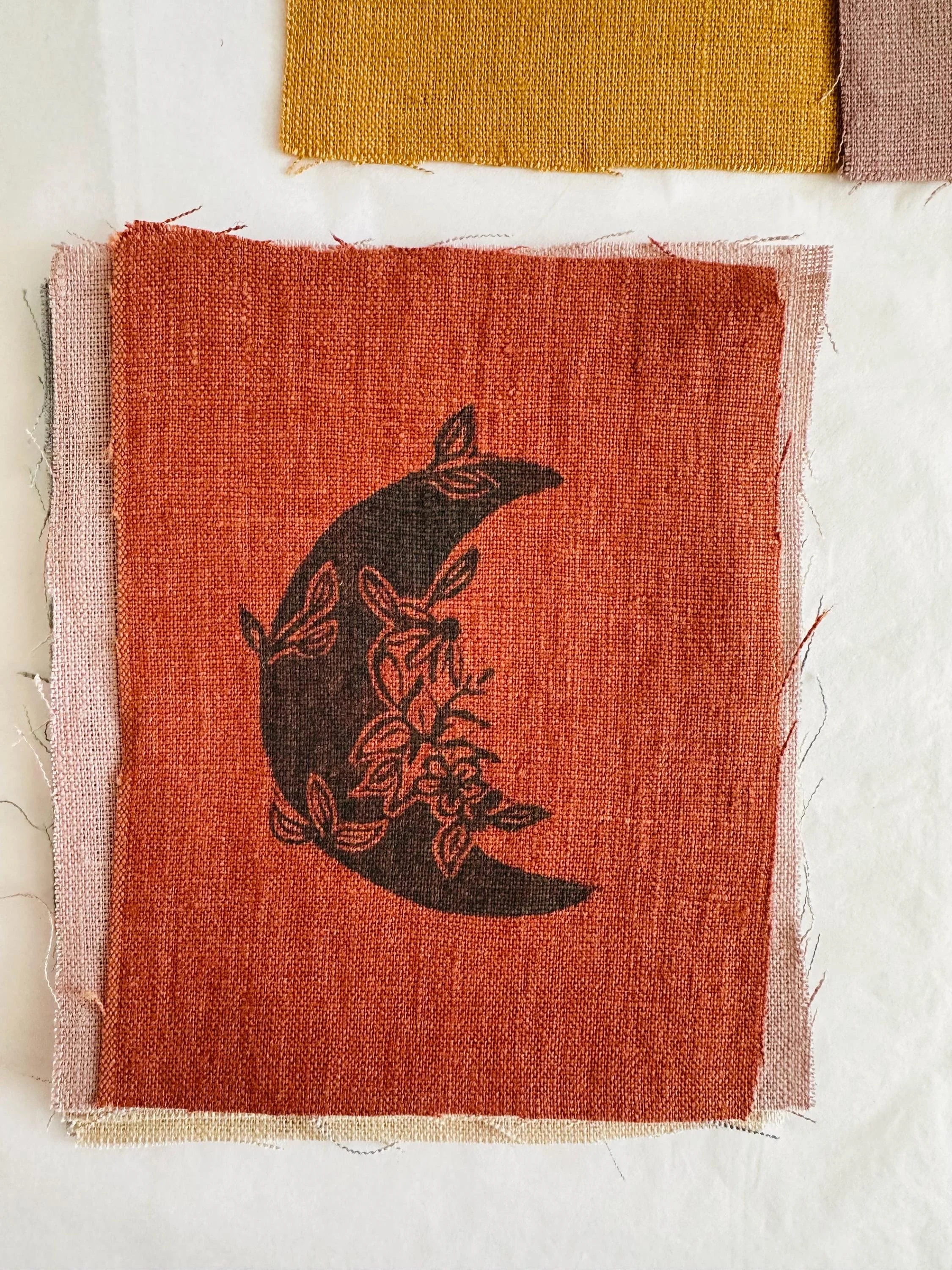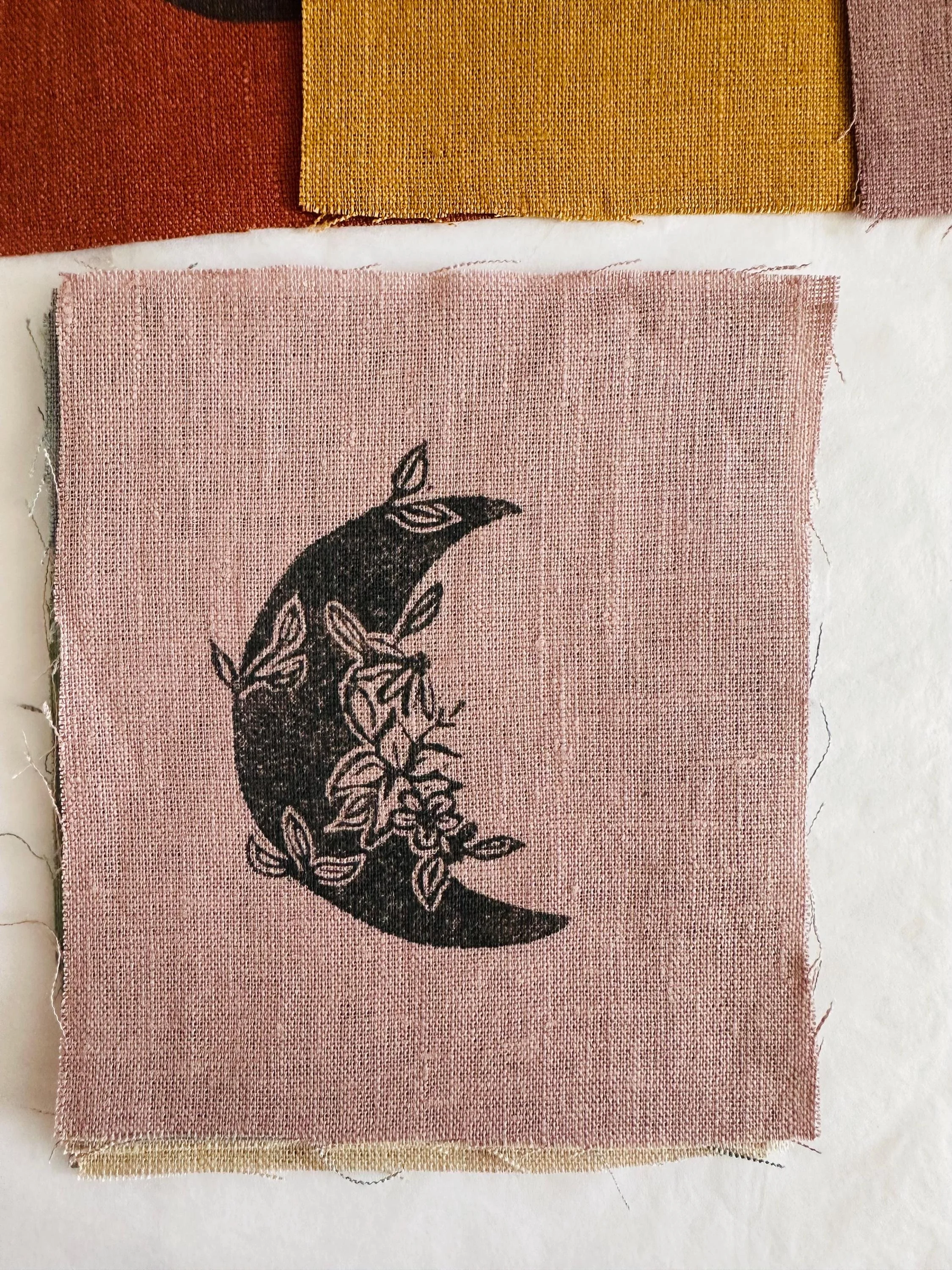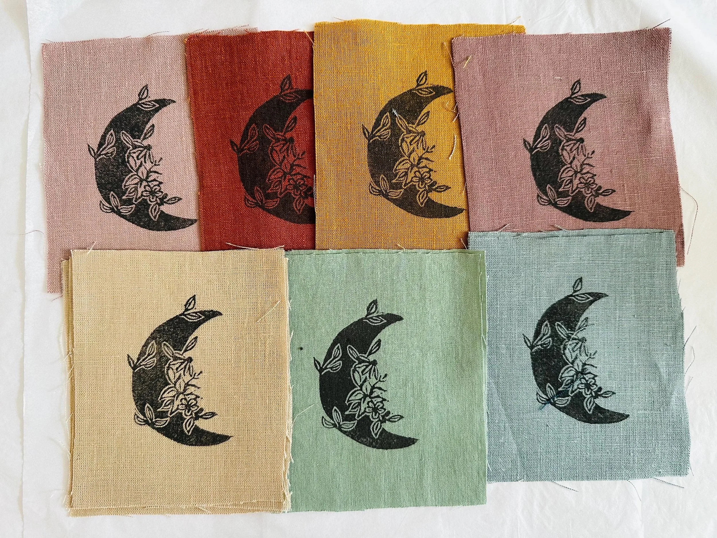 Linen patches, moon Flower, Lino print patches, fabric patch, clothing patch, quilting, textile crafts, cottage core