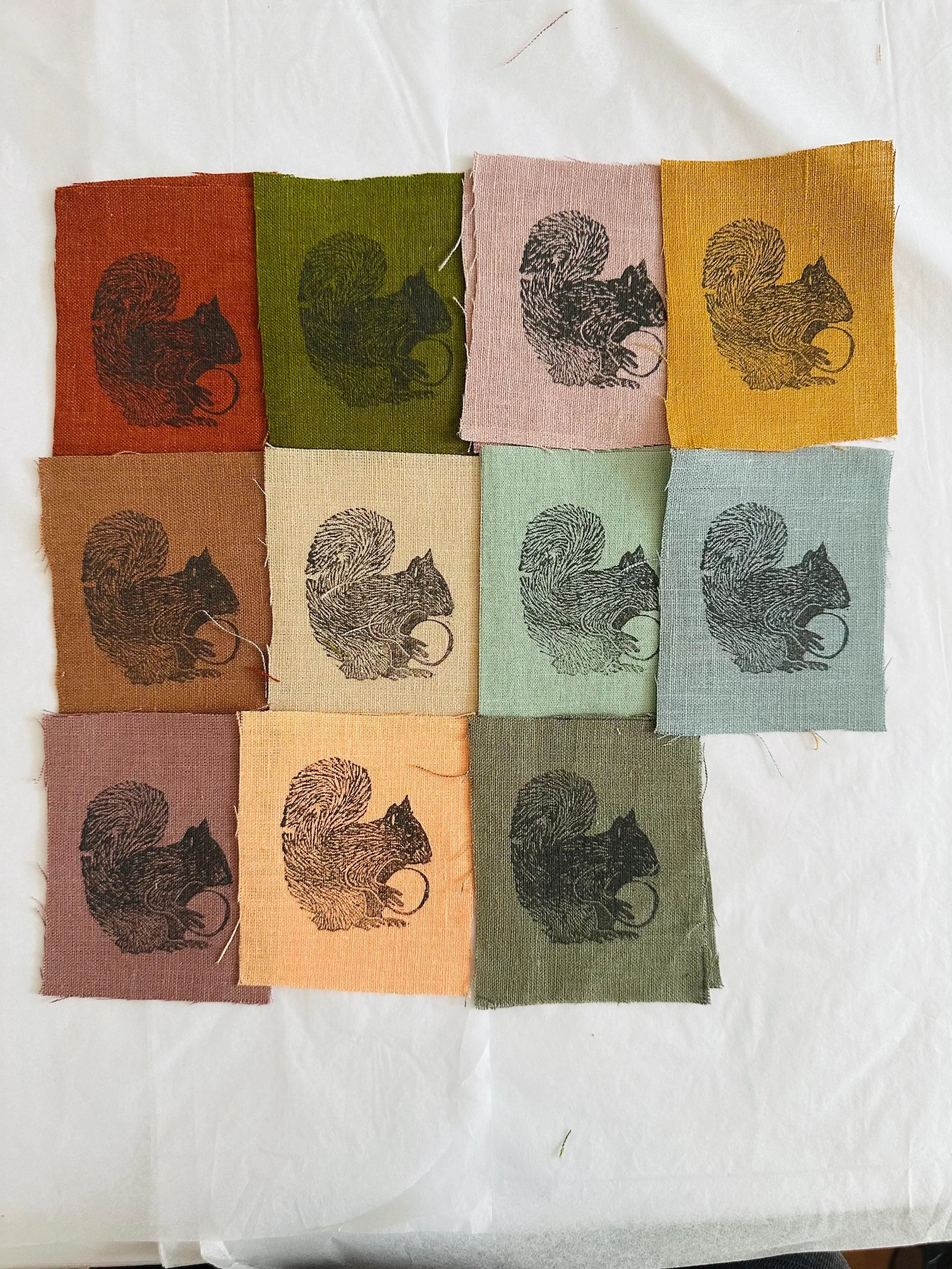 Linen patches, Squirrel , Lino print patches, fabric patch, clothing patch, quilting, textile crafts, cottage core