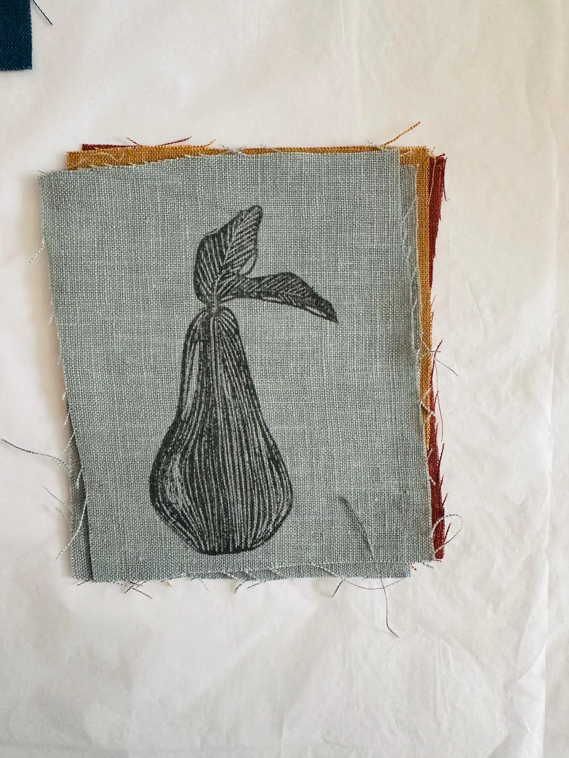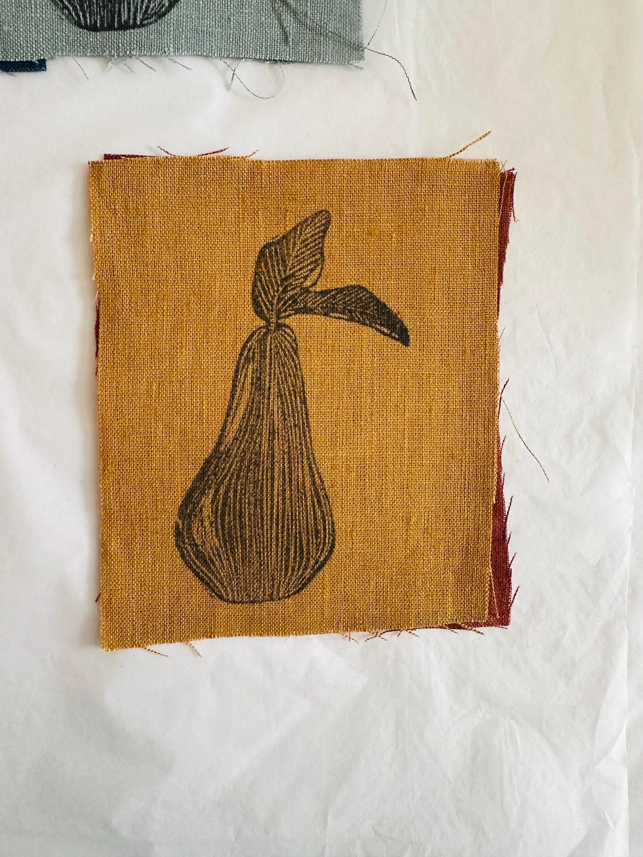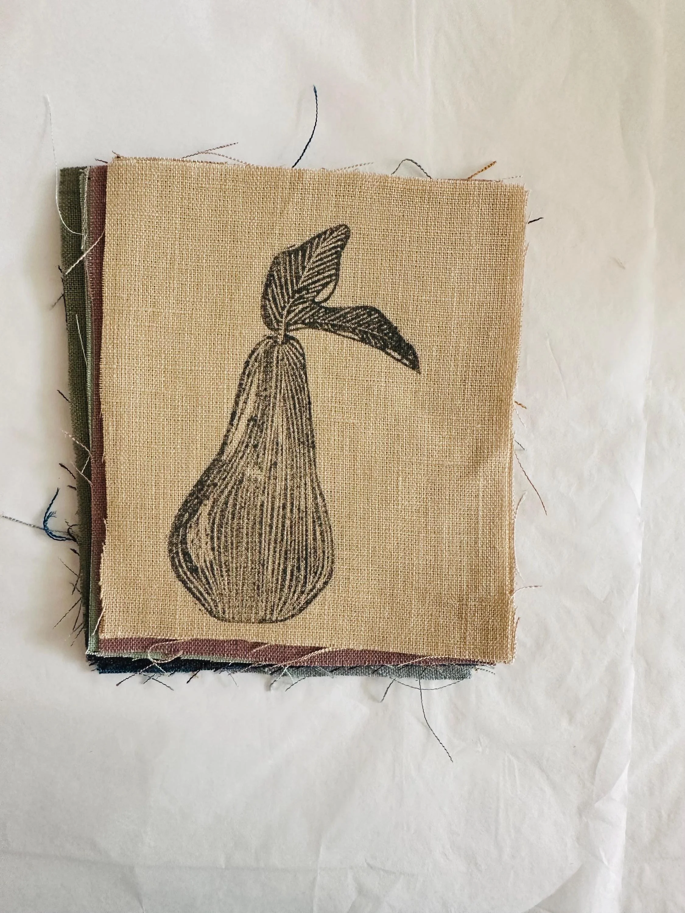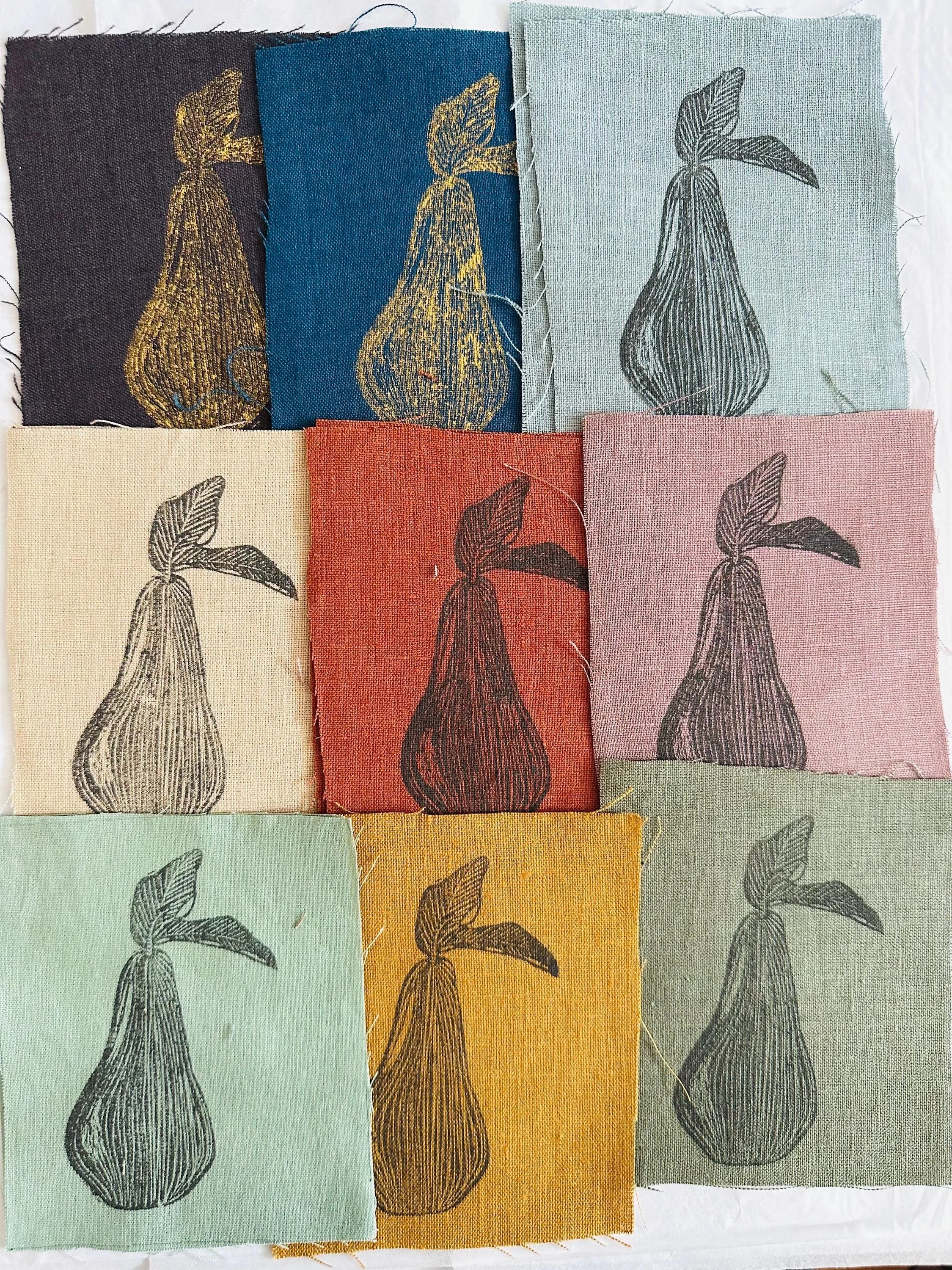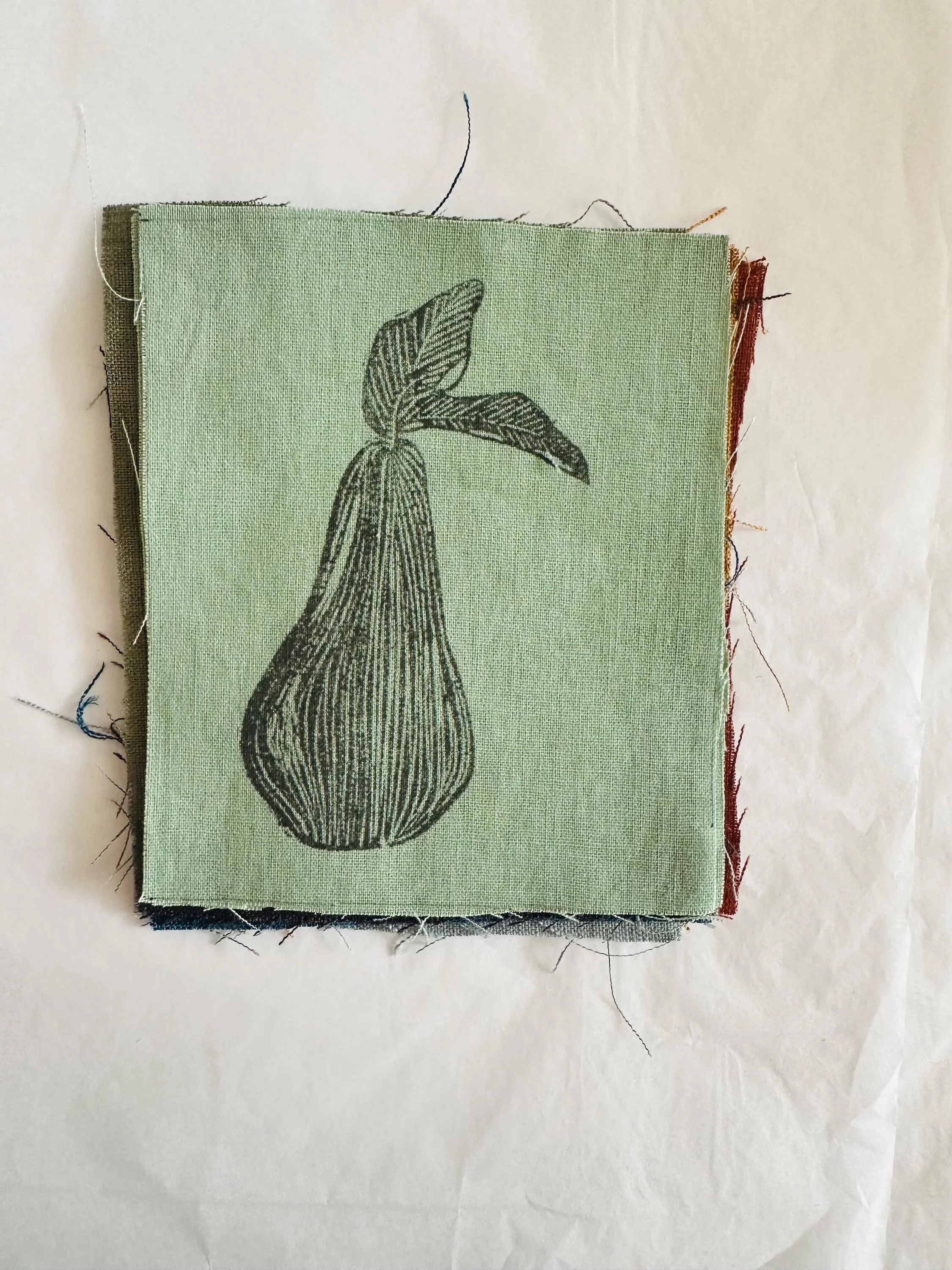 Linen patches,Pear, fruit, Lino print patches, fabric patch, clothing patch, quilting, textile crafts, cottage core