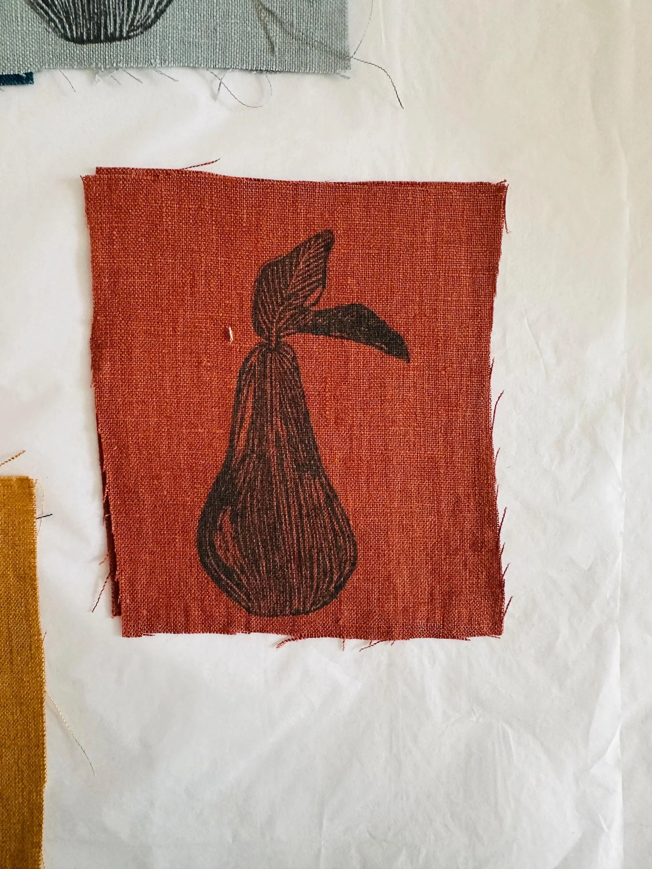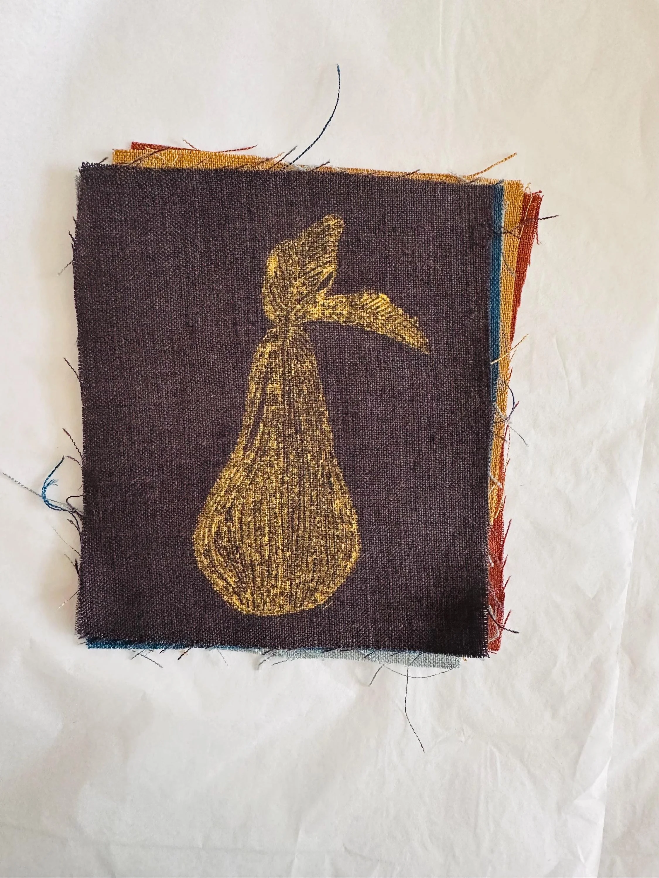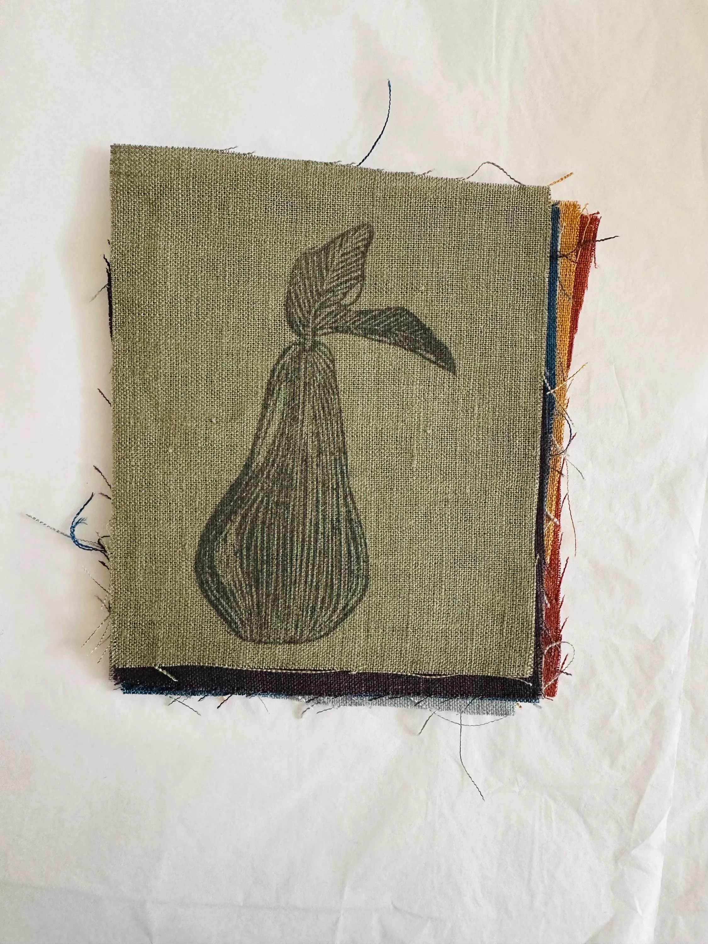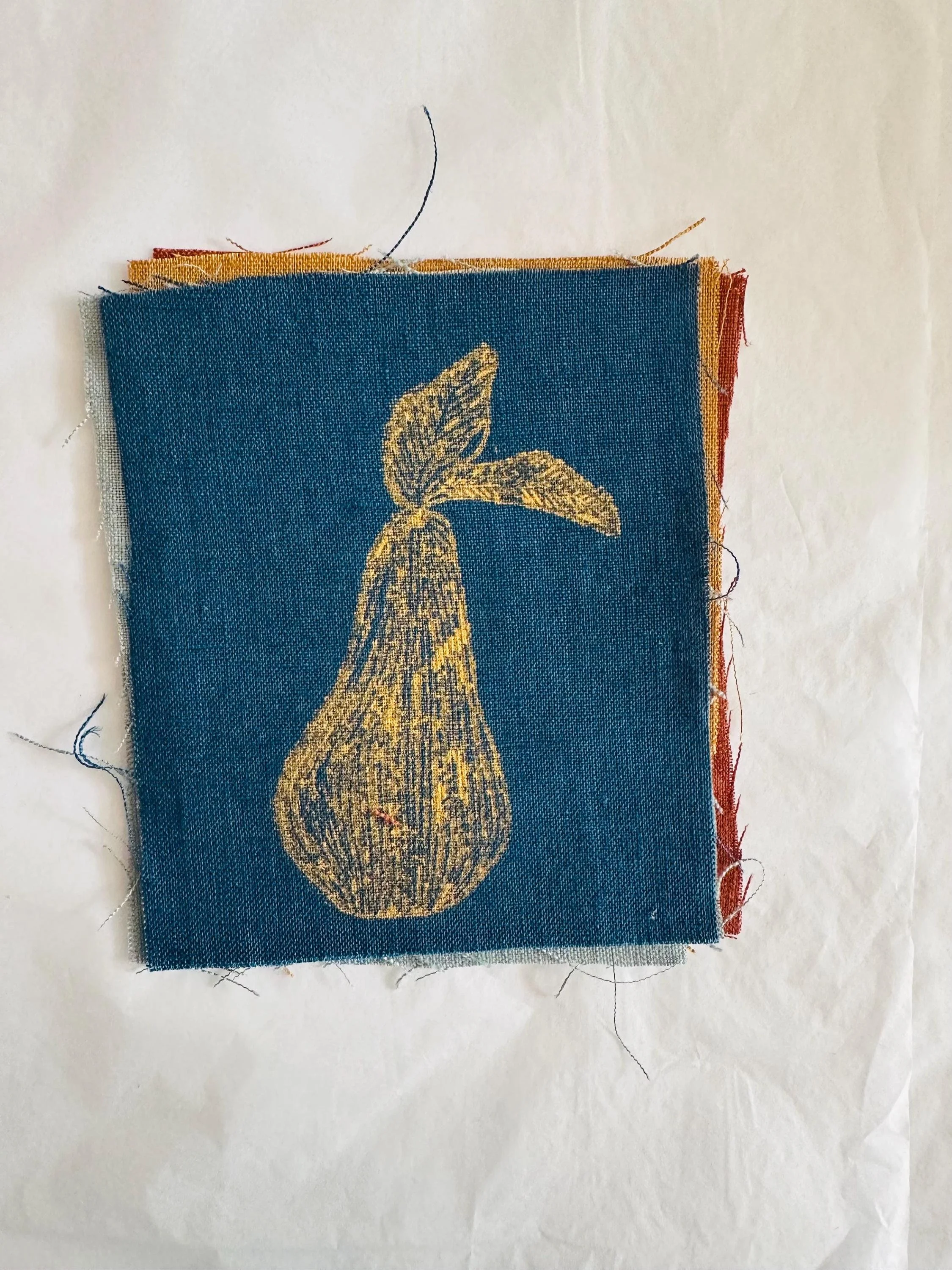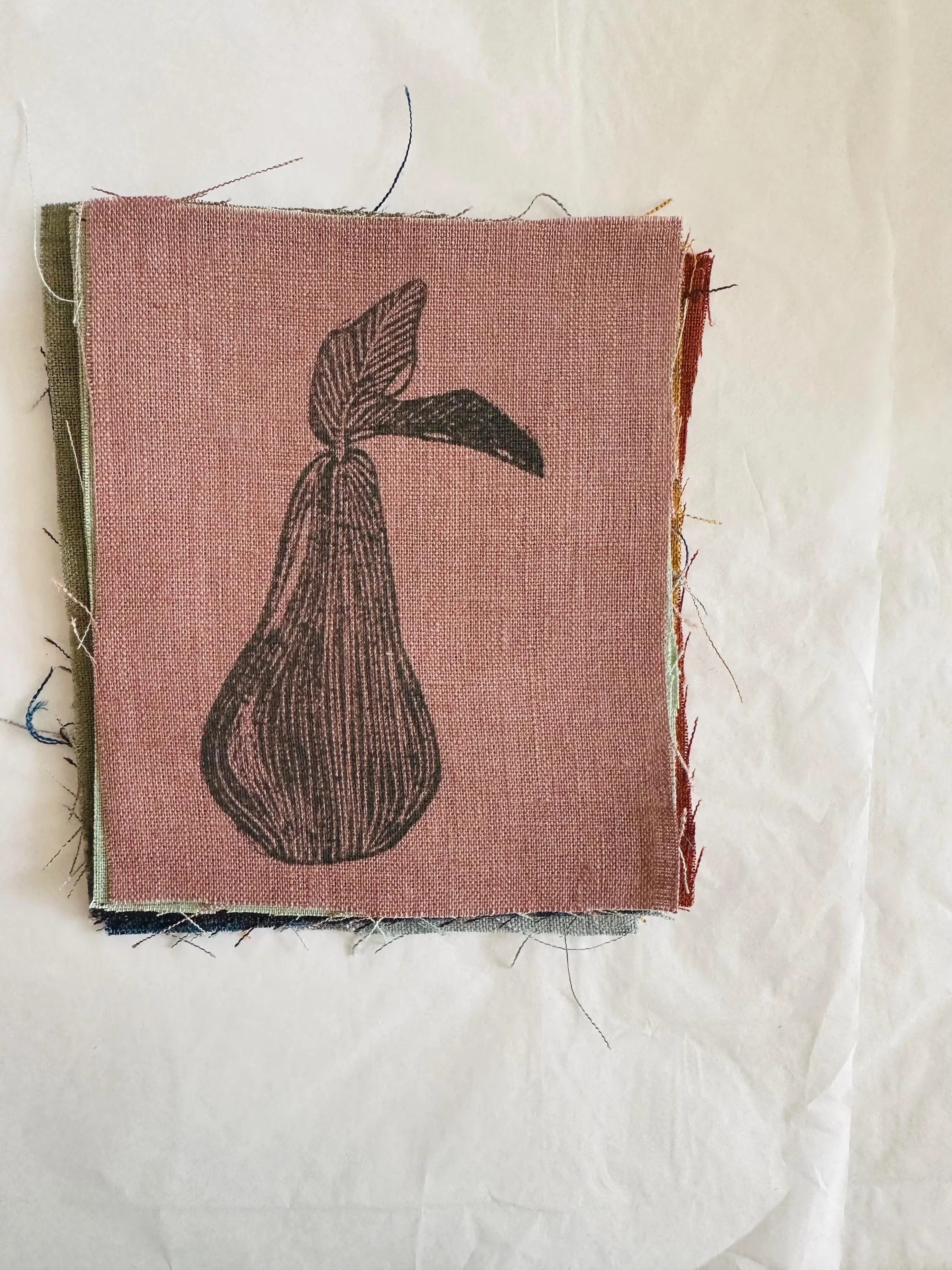 Linen patches,Pear, fruit, Lino print patches, fabric patch, clothing patch, quilting, textile crafts, cottage core