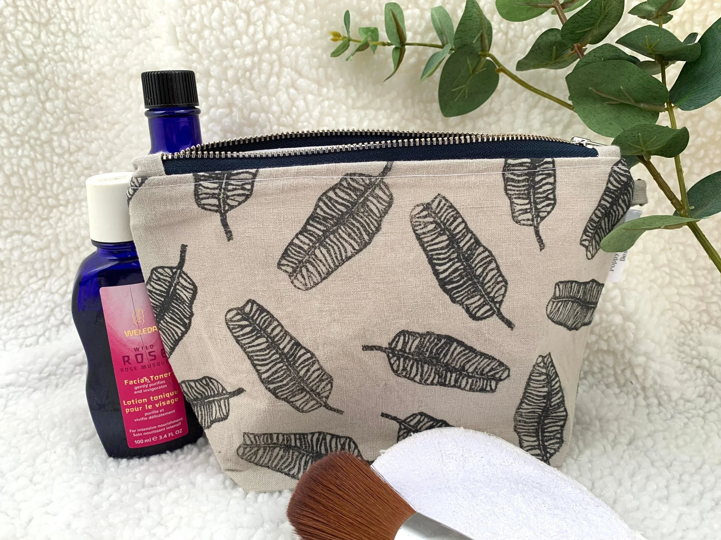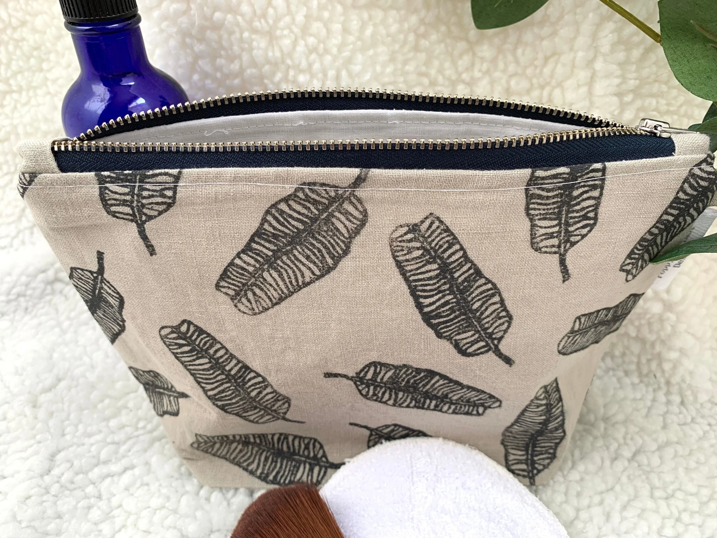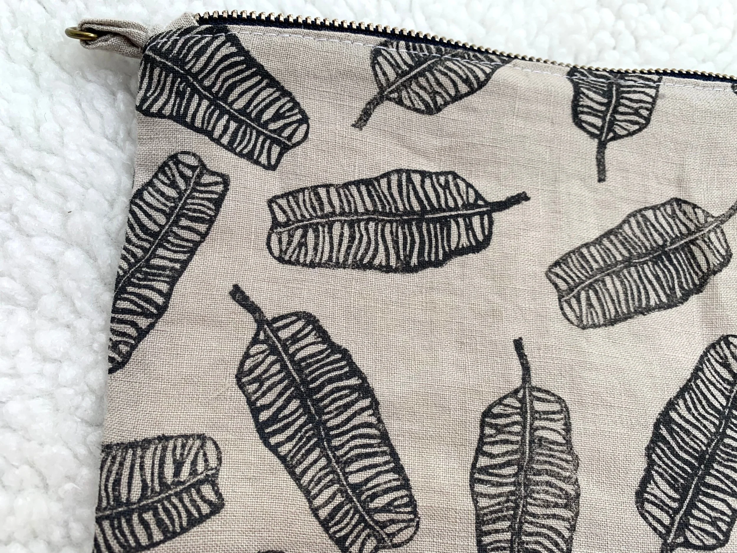 Make up case, make up bag, cosmetic case, zip up pouch, travel bag, handprinted banana leaf, metal zip