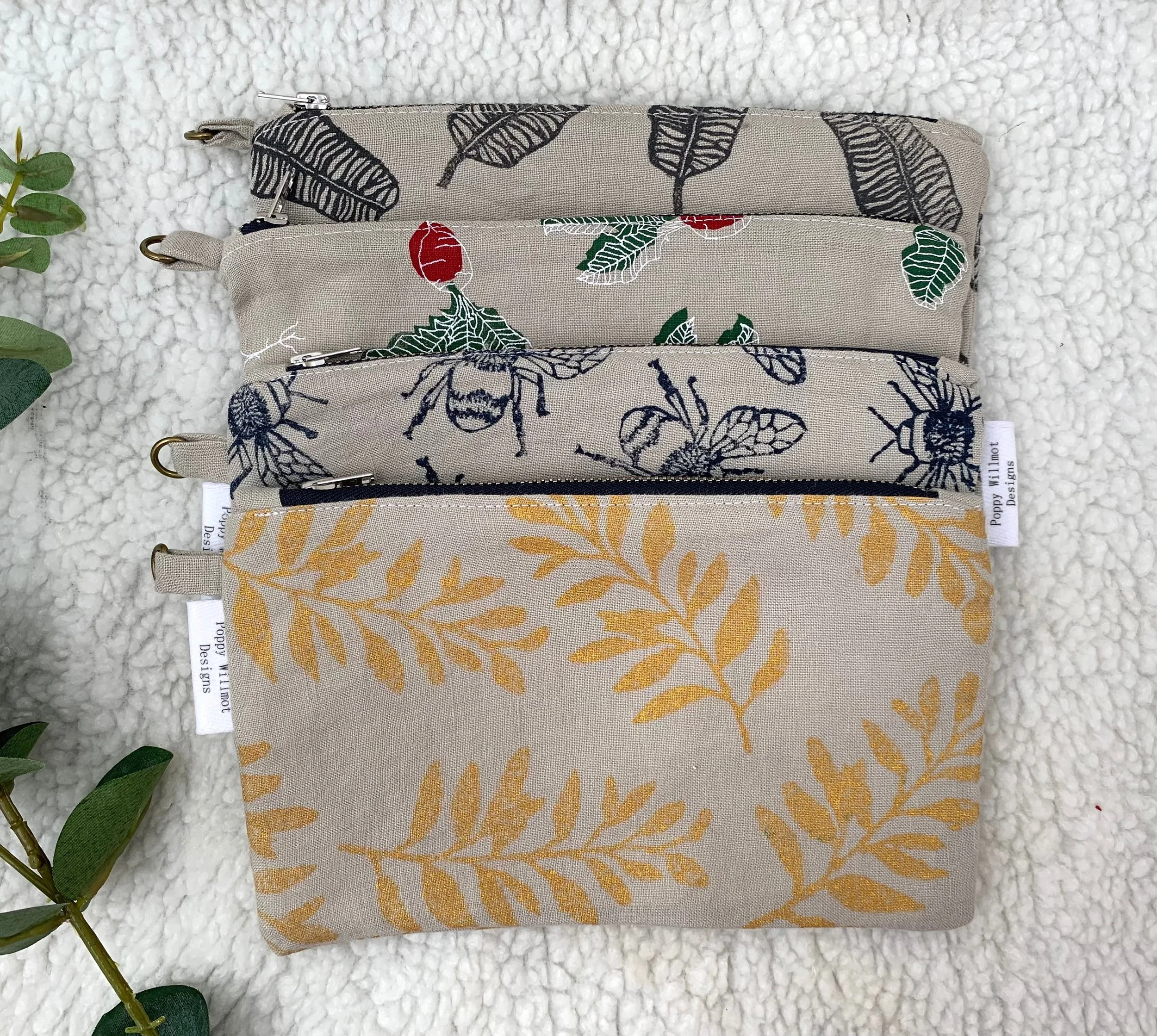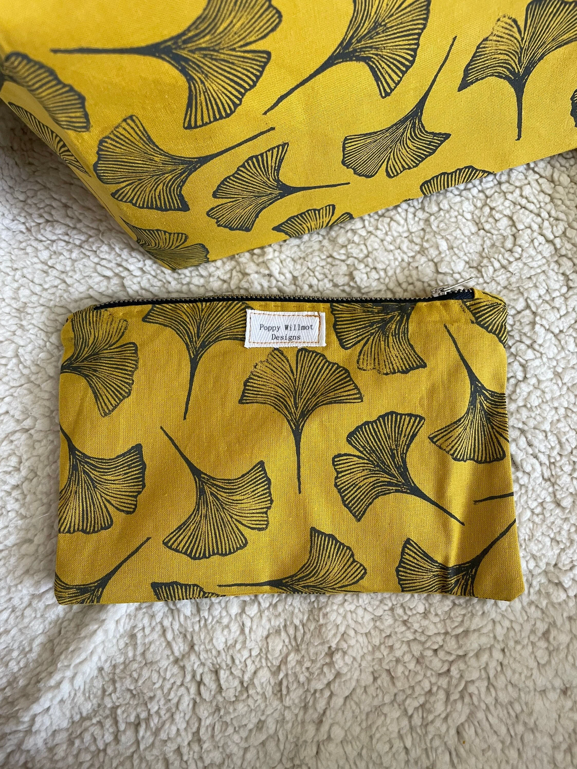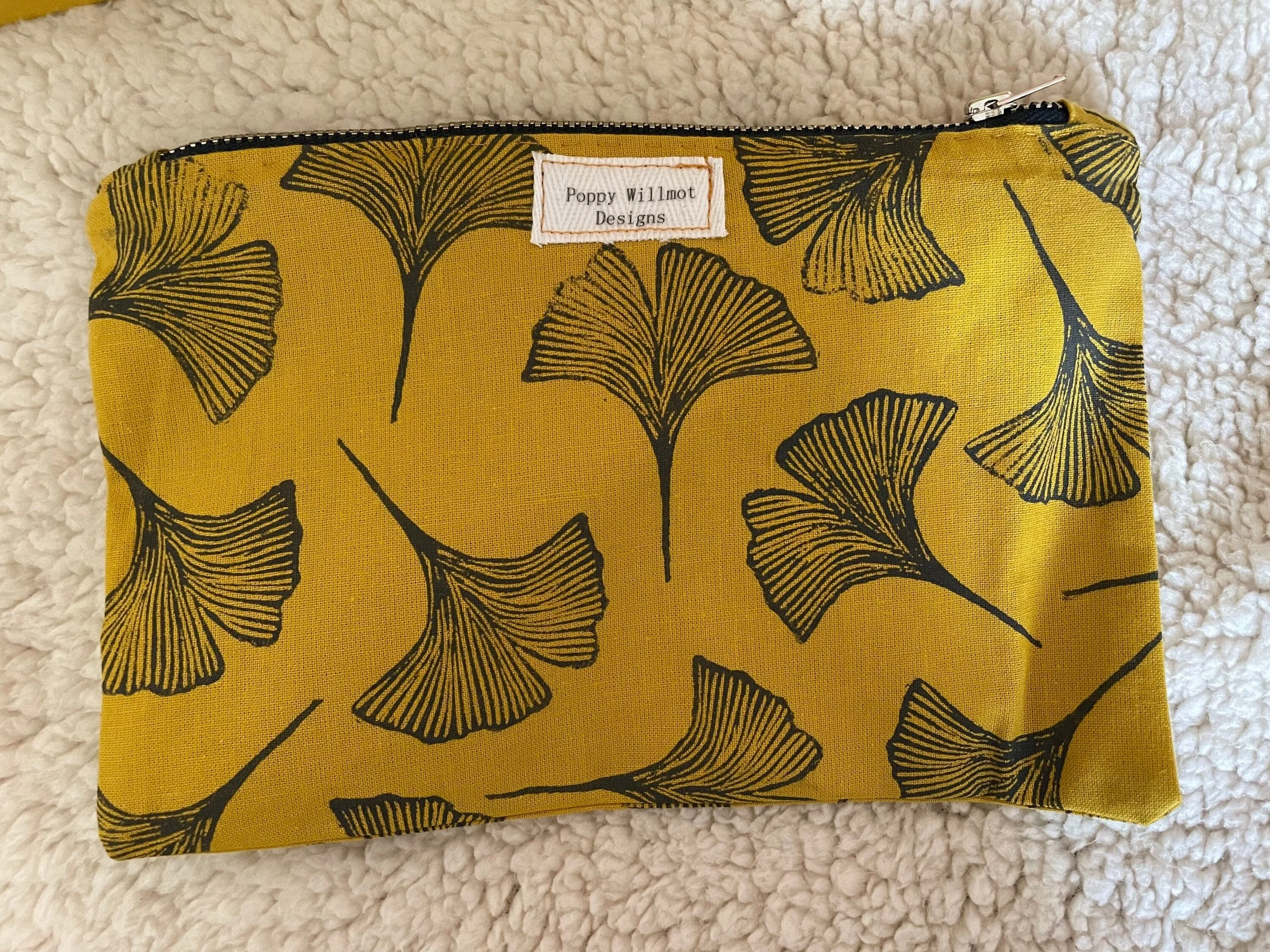 Mustard Gingko zip up case. Perfect for organising those all important handbag essentials or for using as a large purse. This useful pouch is made from pure, soft washed linen and features a hand printed design from our collection.