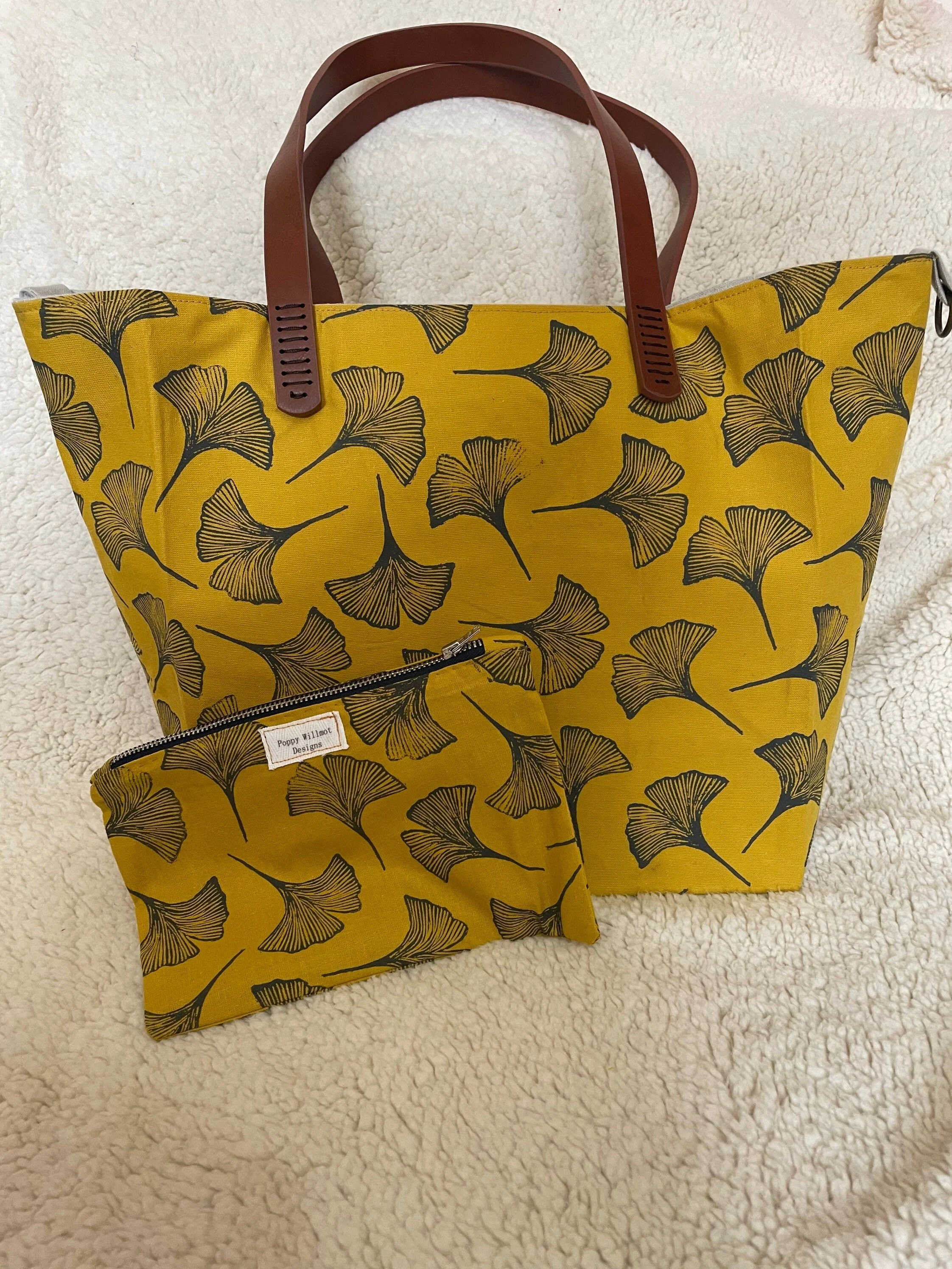Mustard Gingko leaf pencil case, make up bag, purse,handprinted, handmade, linen
