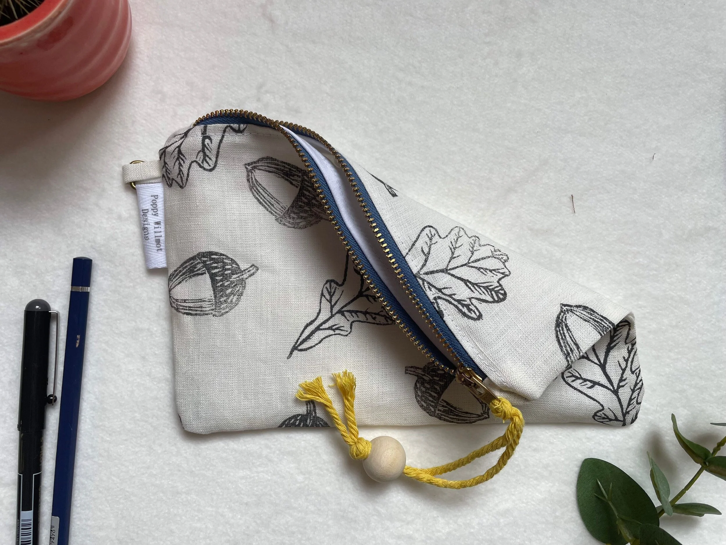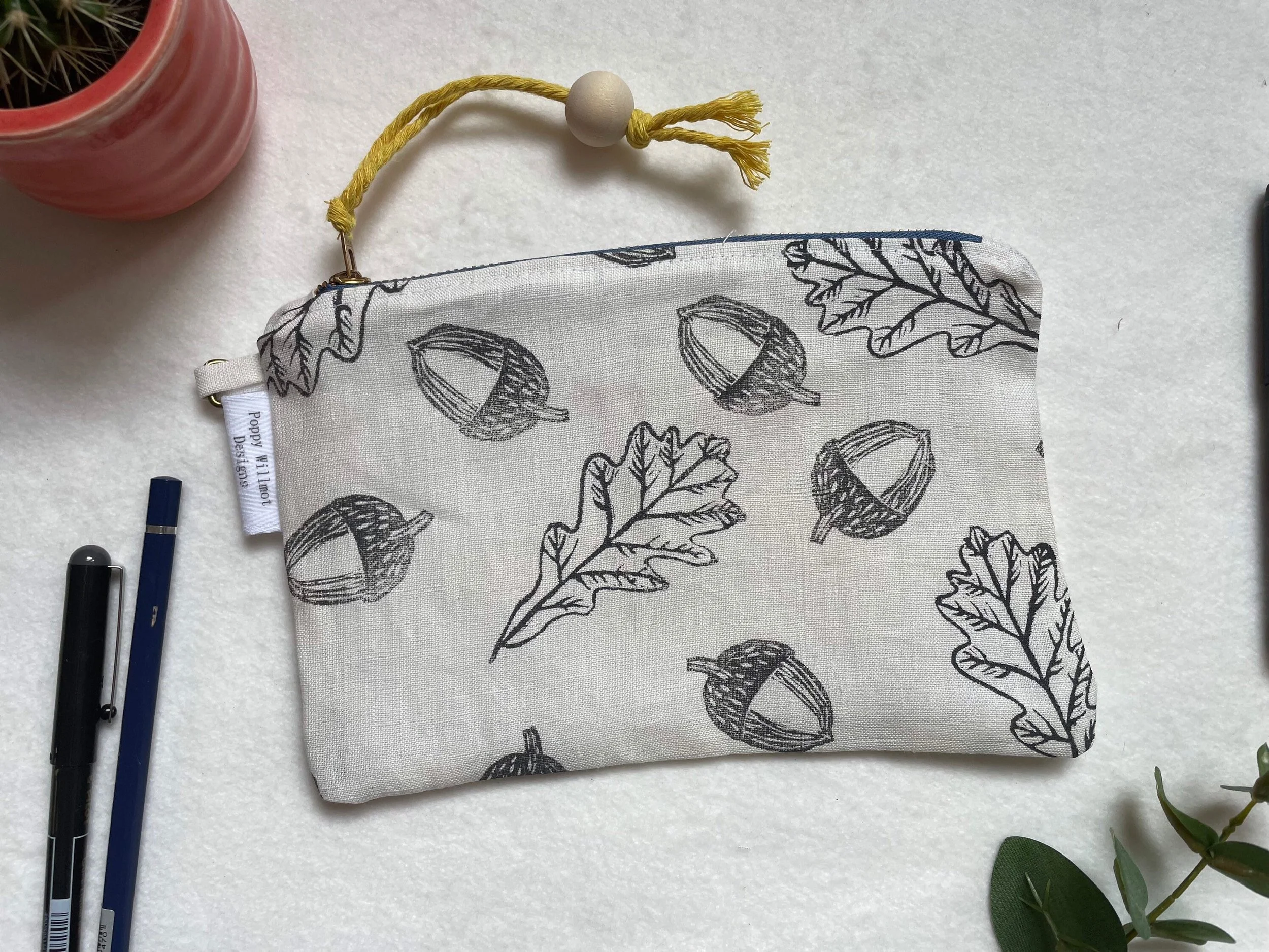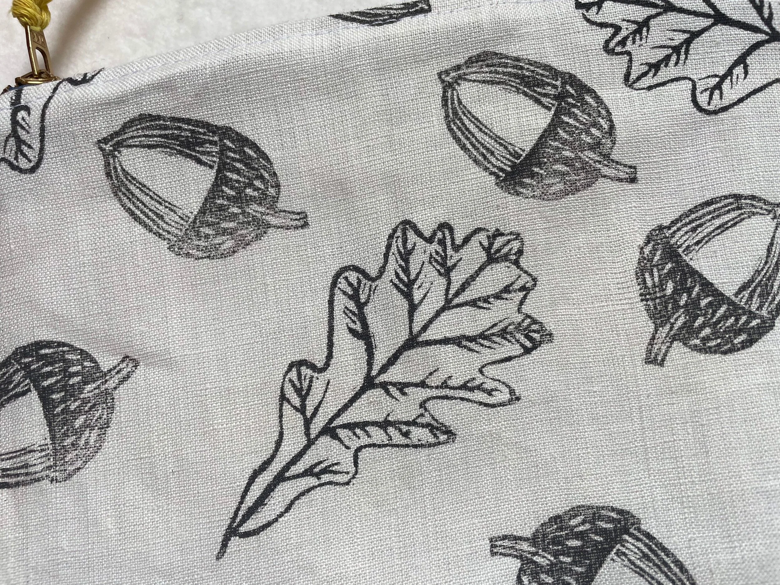 Oak leaf zip up case. Perfect for organising those all important handbag essentials or for using as a large purse. This useful pouch is made from pure, soft washed linen and features a hand printed design from our collection.