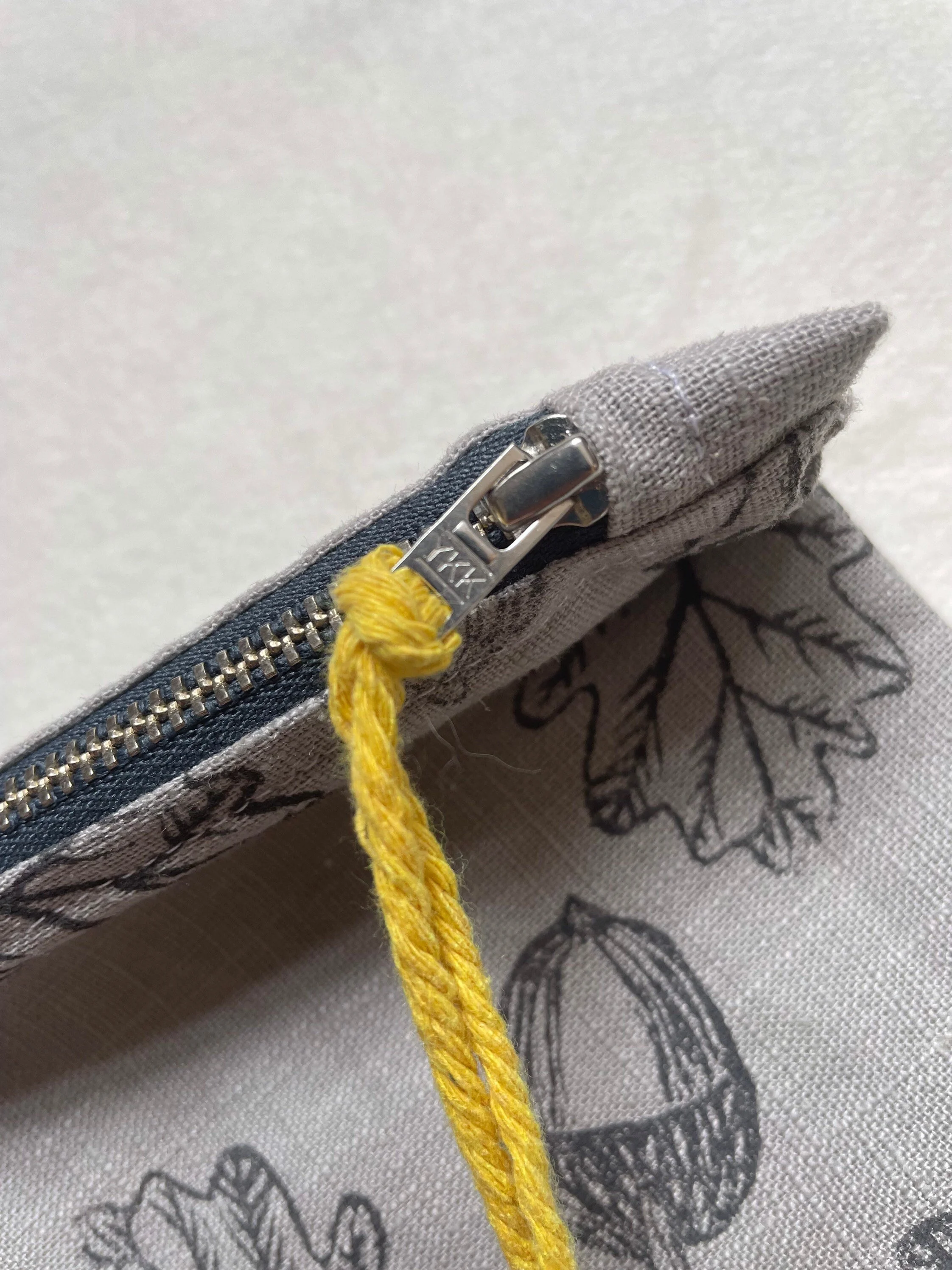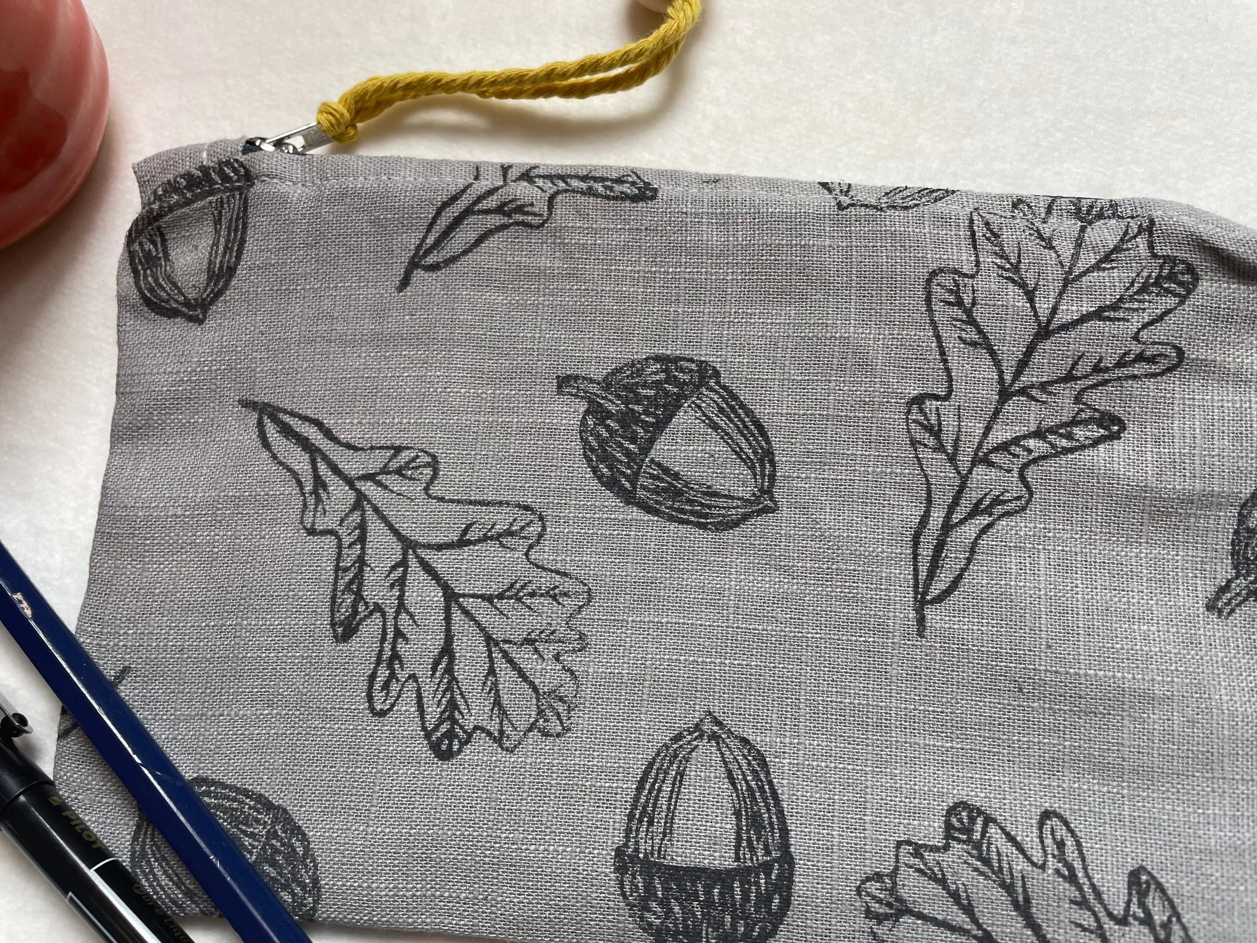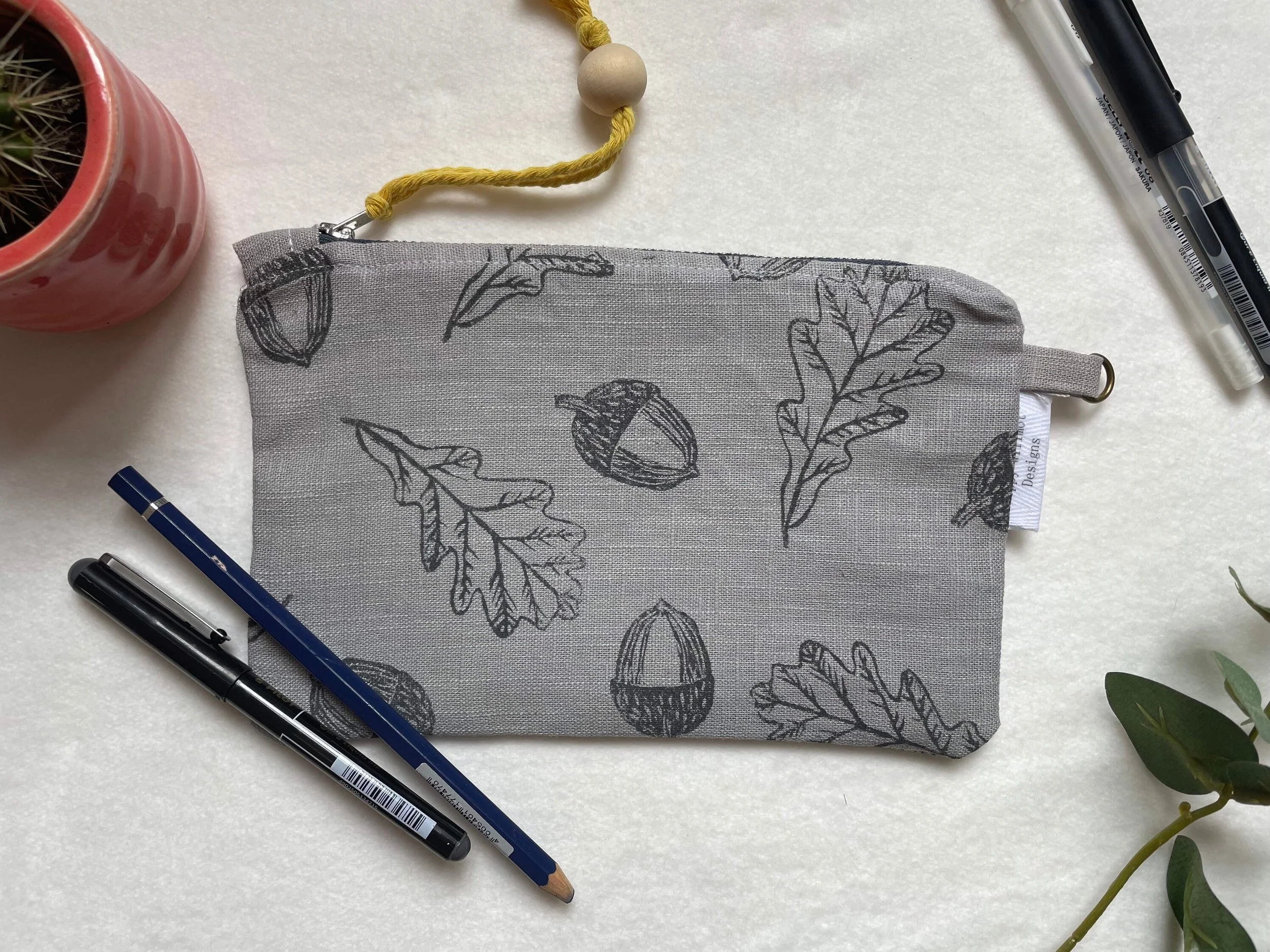Oak leaf zip up case. Perfect for organising those all important handbag essentials or for using as a large purse. This useful pouch is made from pure, soft washed linen and features a hand printed design from our collection.