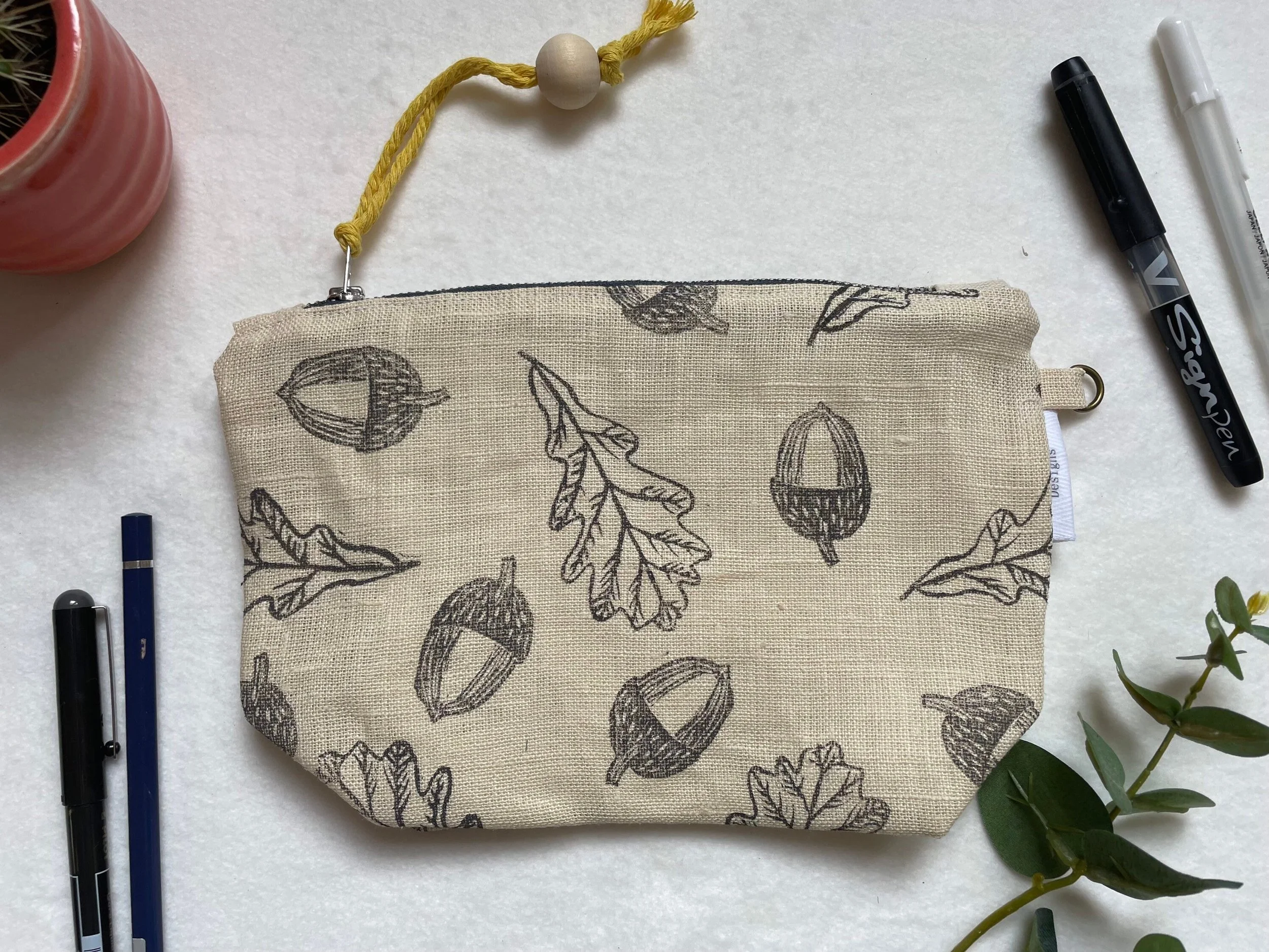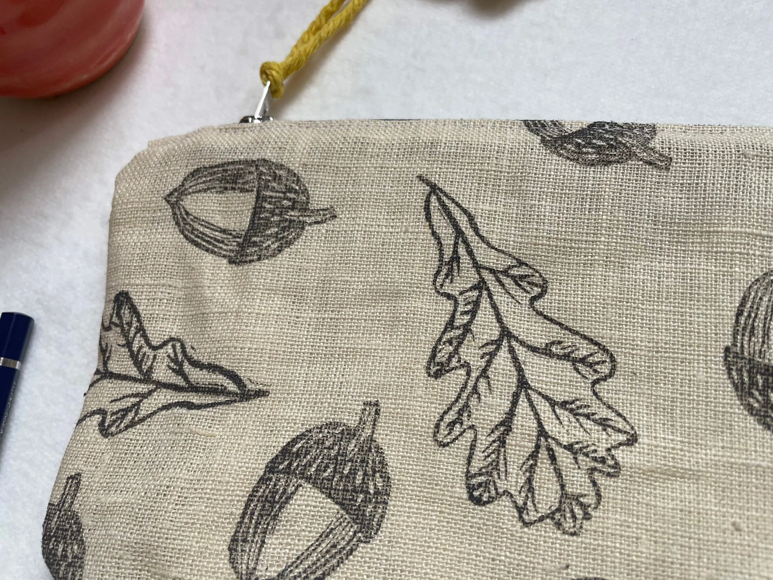 Oak leaf zip up case. Perfect for organising those all important handbag essentials or for using as a large purse. This useful pouch is made from pure, soft washed linen and features a hand printed design from our collection.