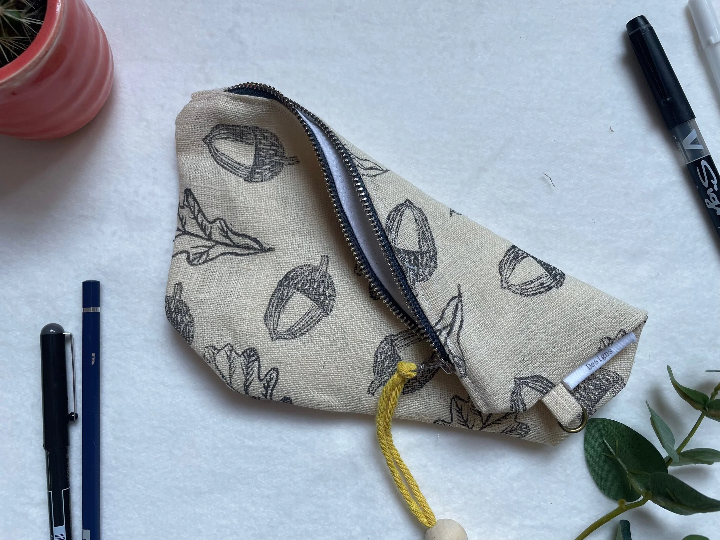 Oak leaf pencil case, make up bag, purse,handprinted, handmade, linen