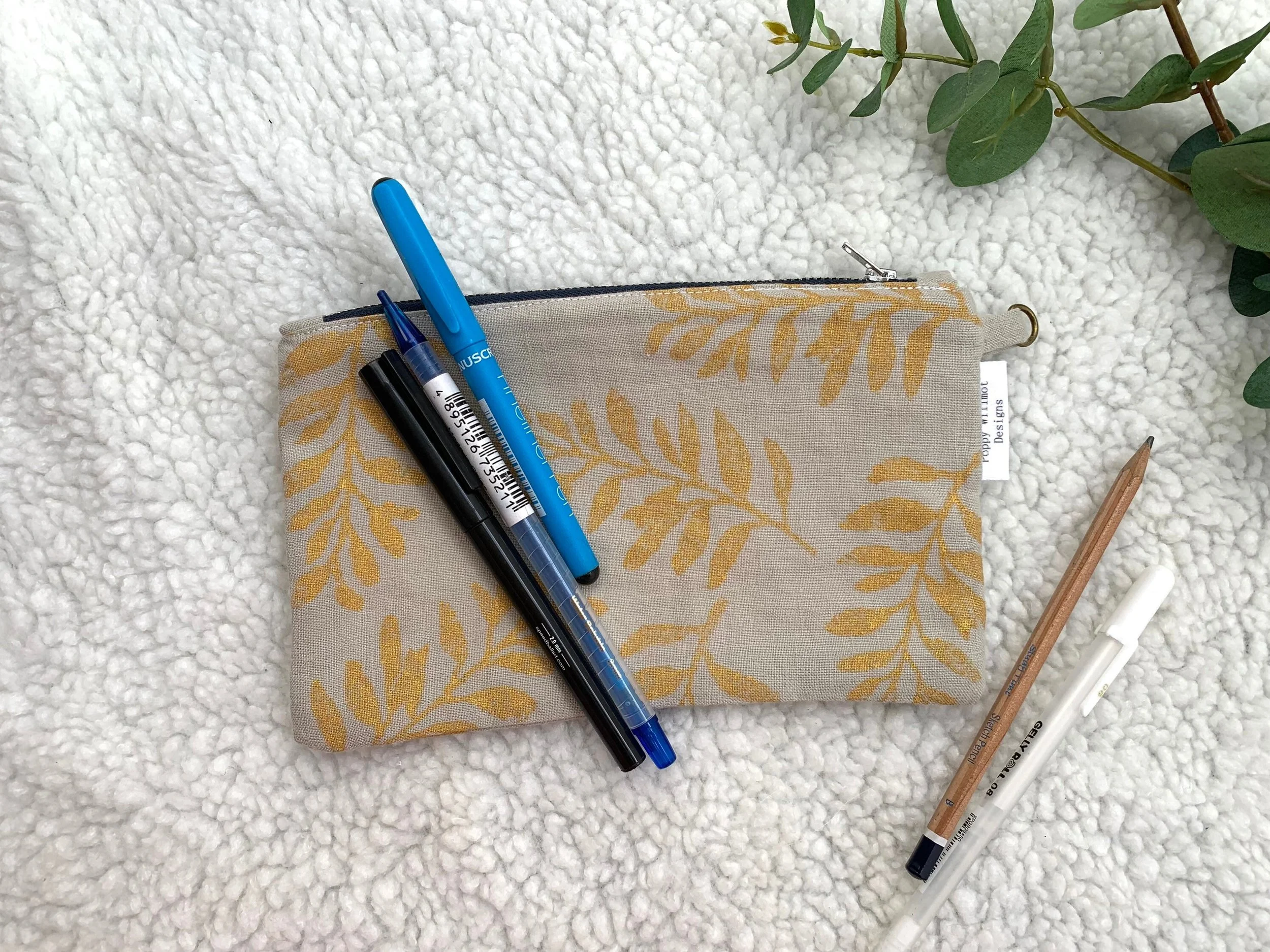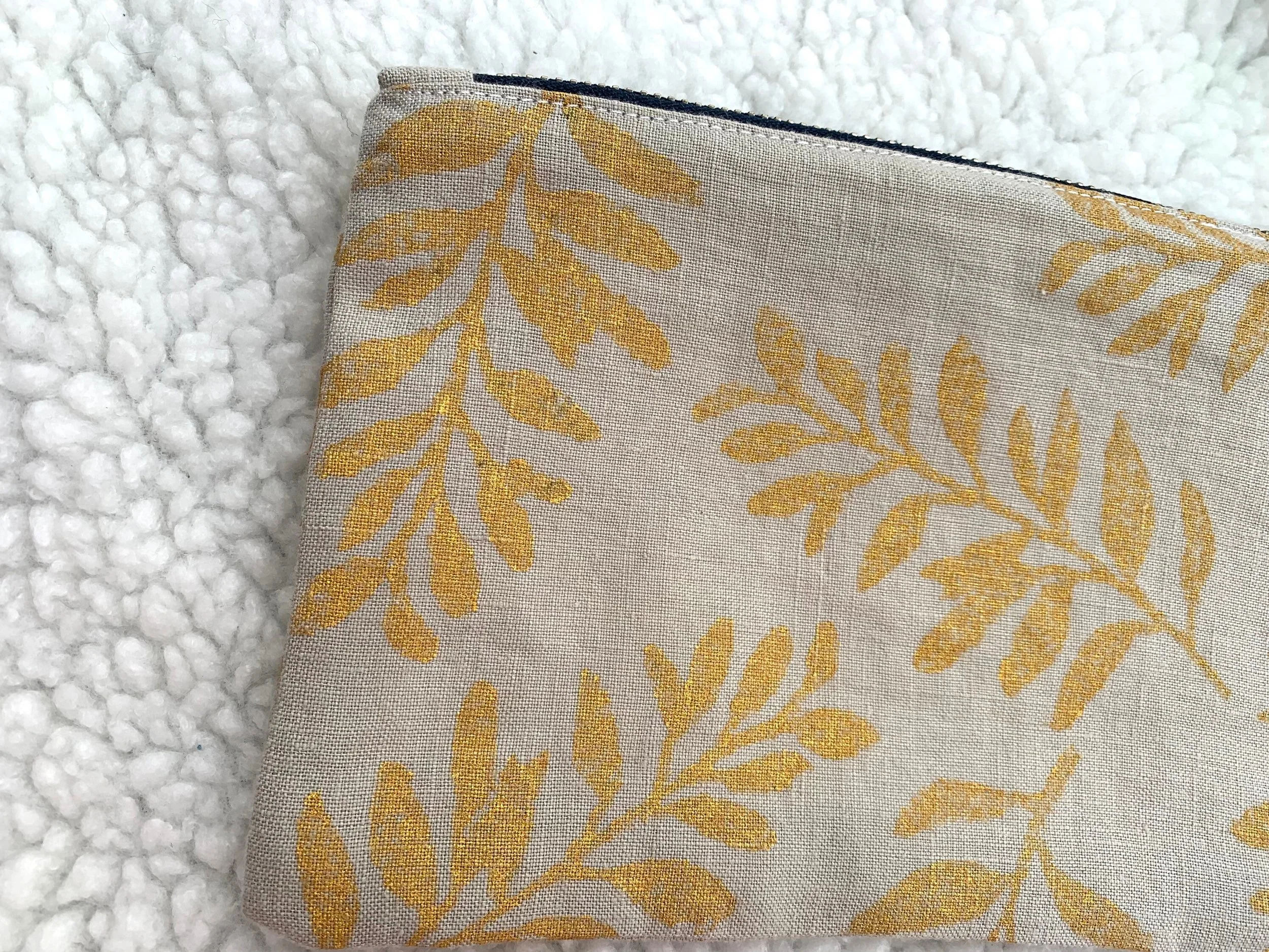 Pencil case, makeup bag, purse, zip up pouch,golden leaves, handprinted, handmade