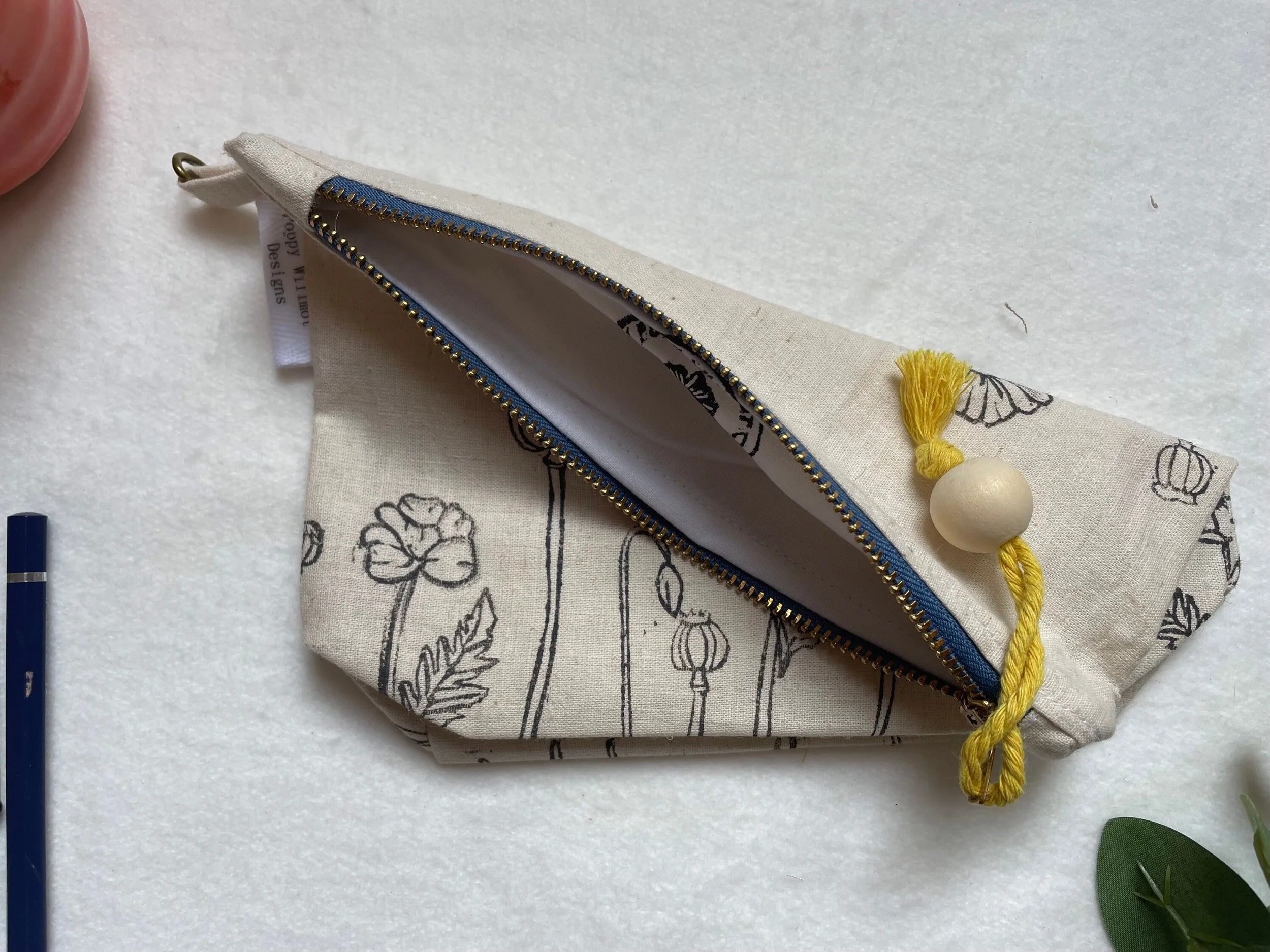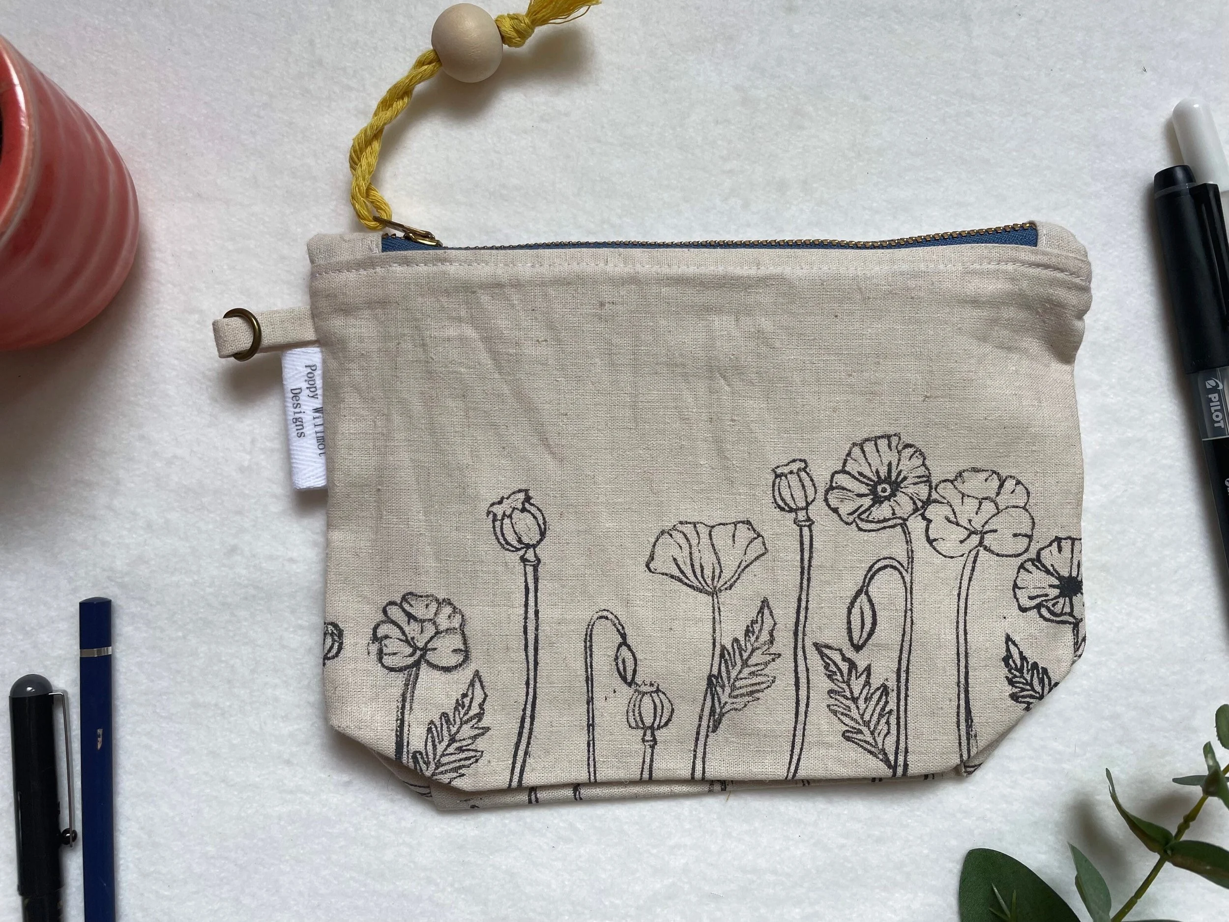 Poppy flower pencil case, make up bag, purse,handprinted, handmade, linen