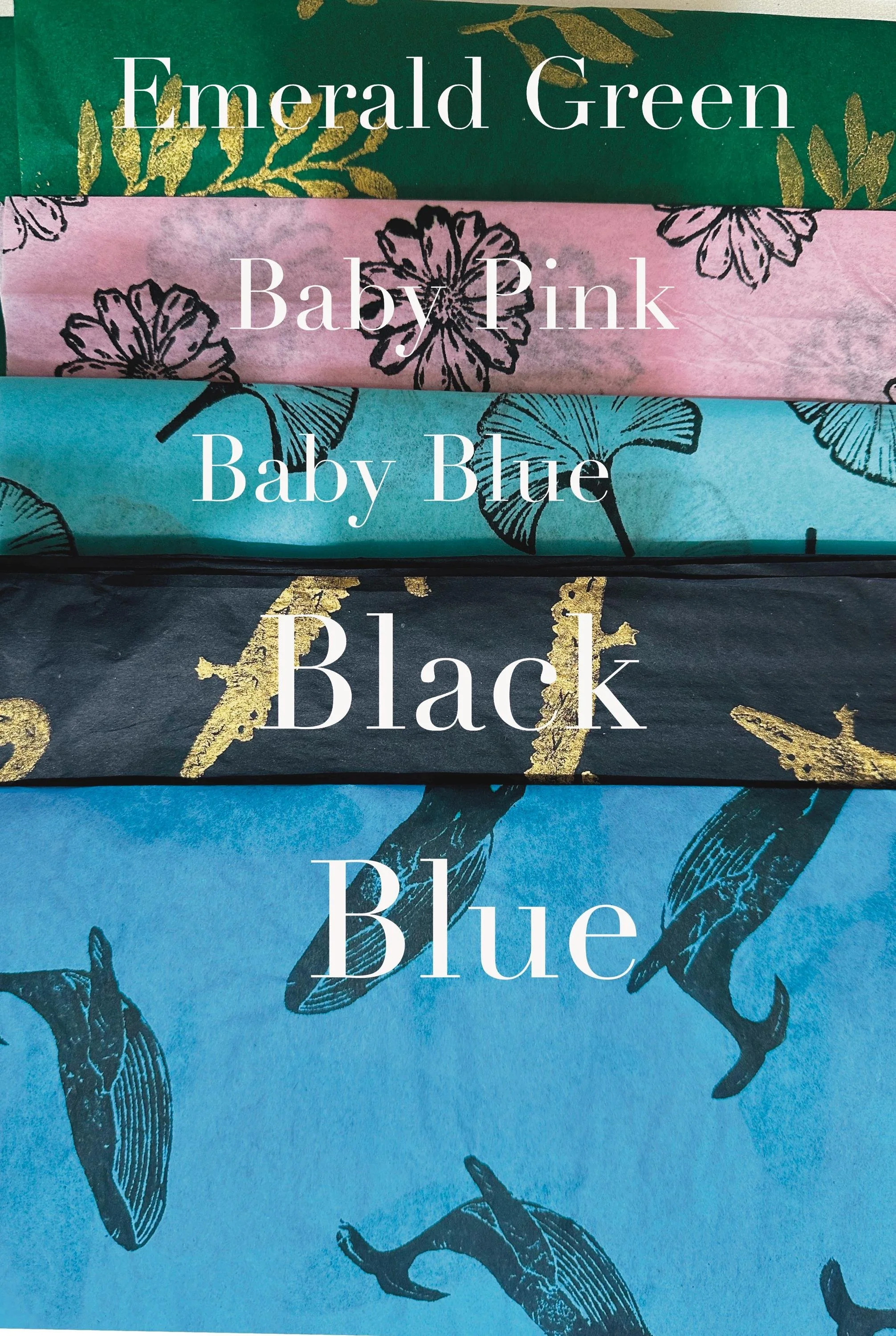 Introducing our eco-friendly tissue paper, handprinted with care and sustainability in mind. Each sheet of this exquisite tissue paper is meticulously crafted, using only the finest natural materials and eco-conscious printing methods.